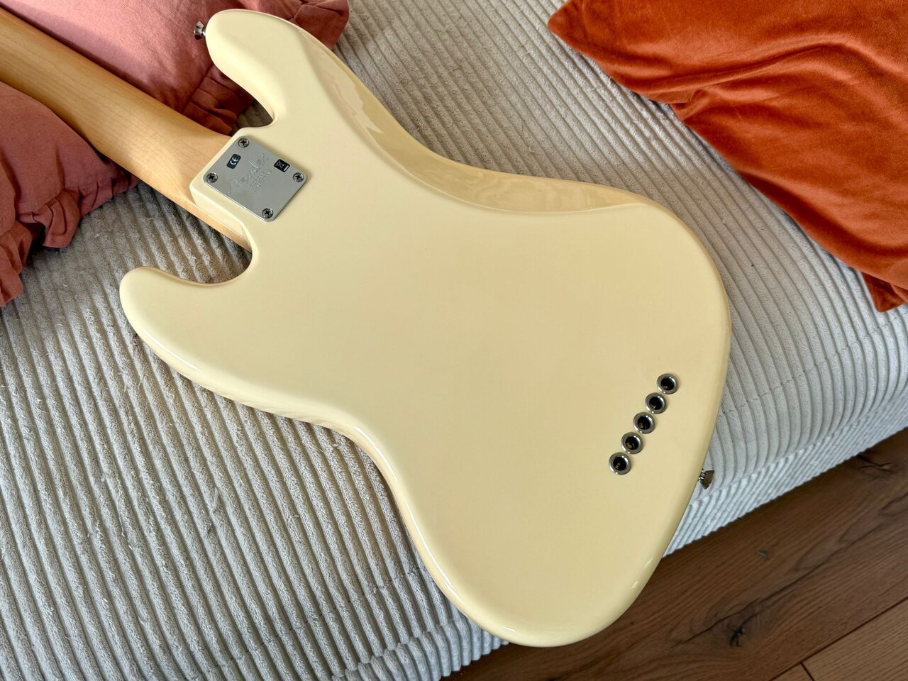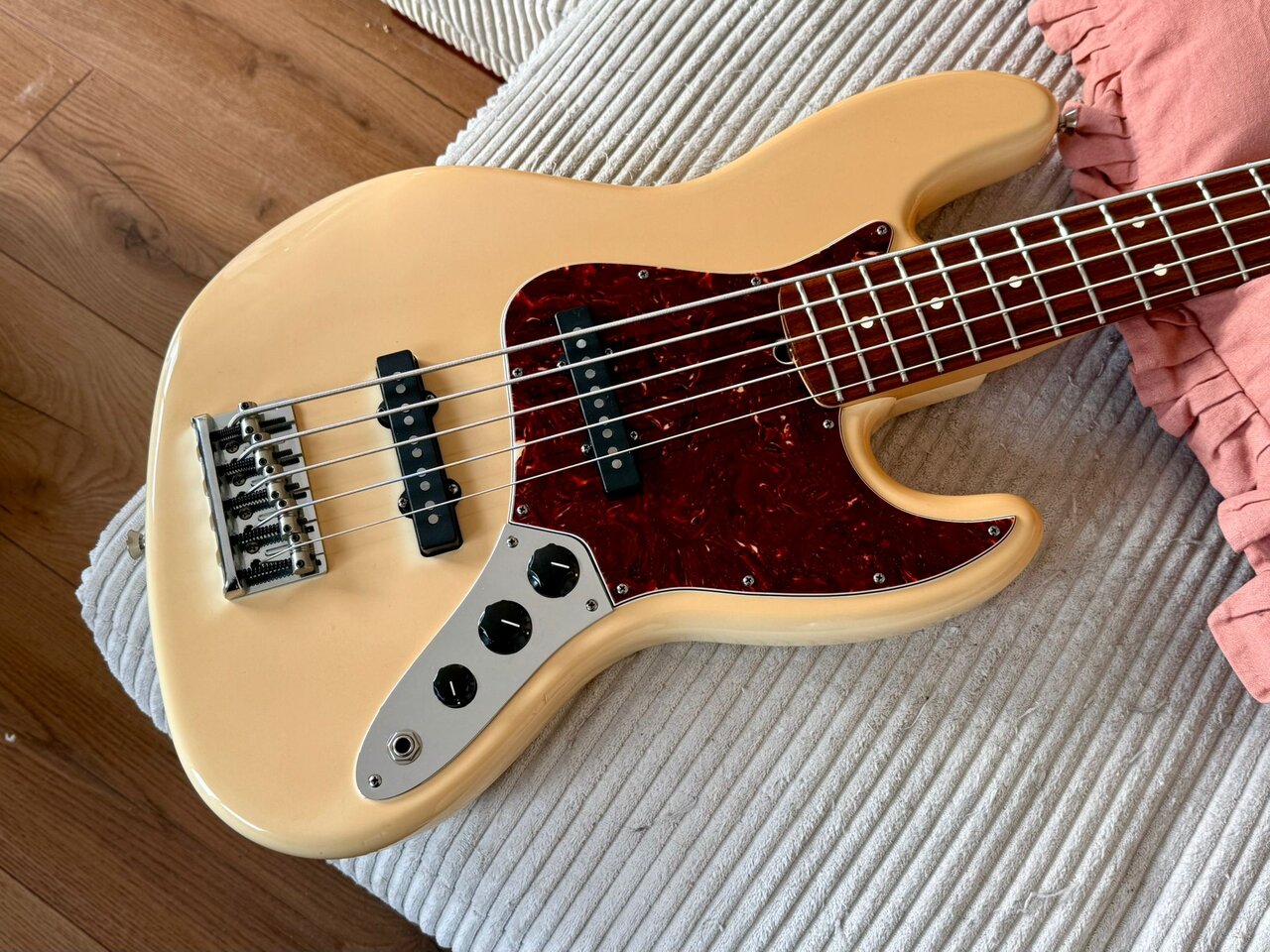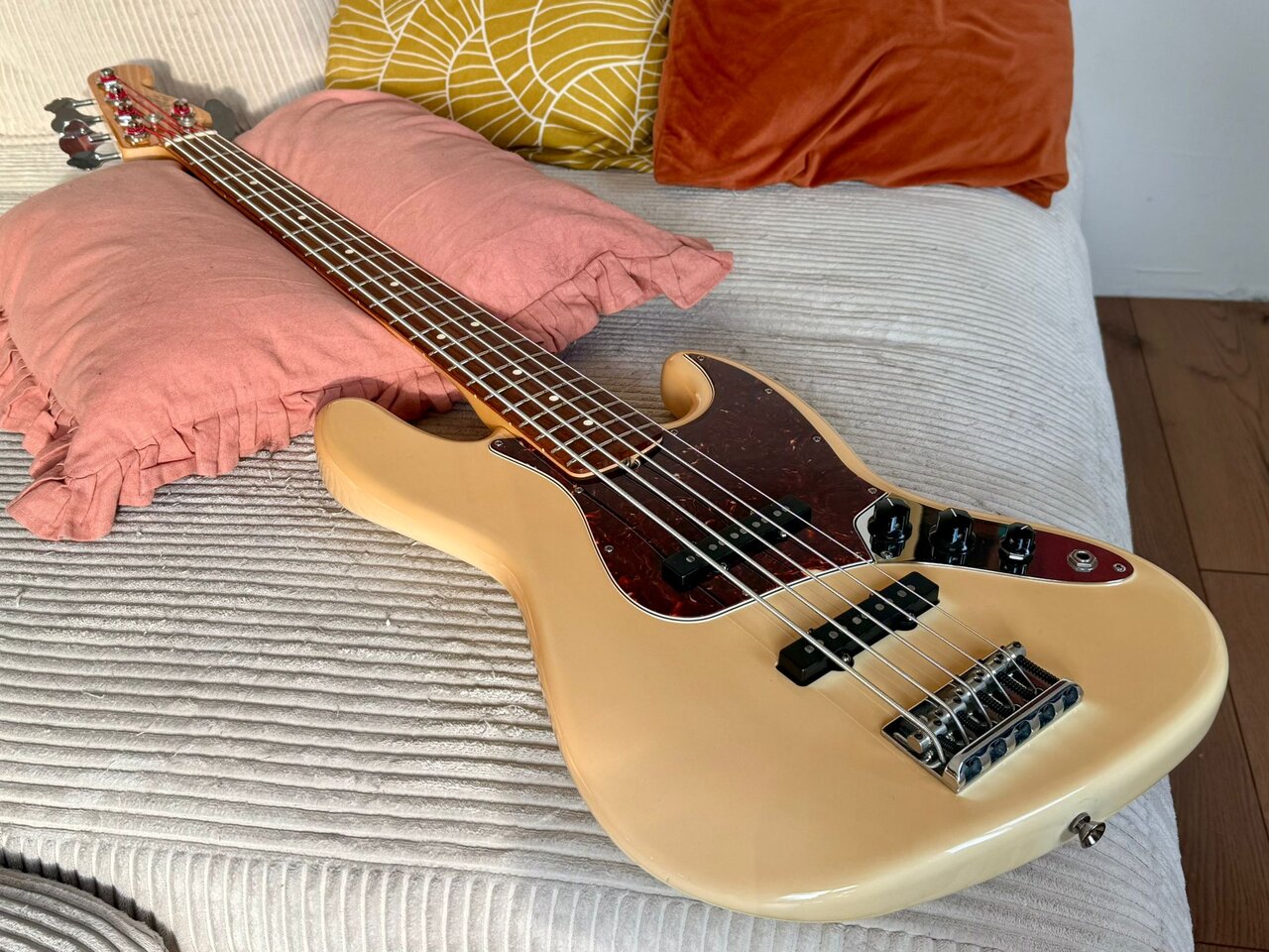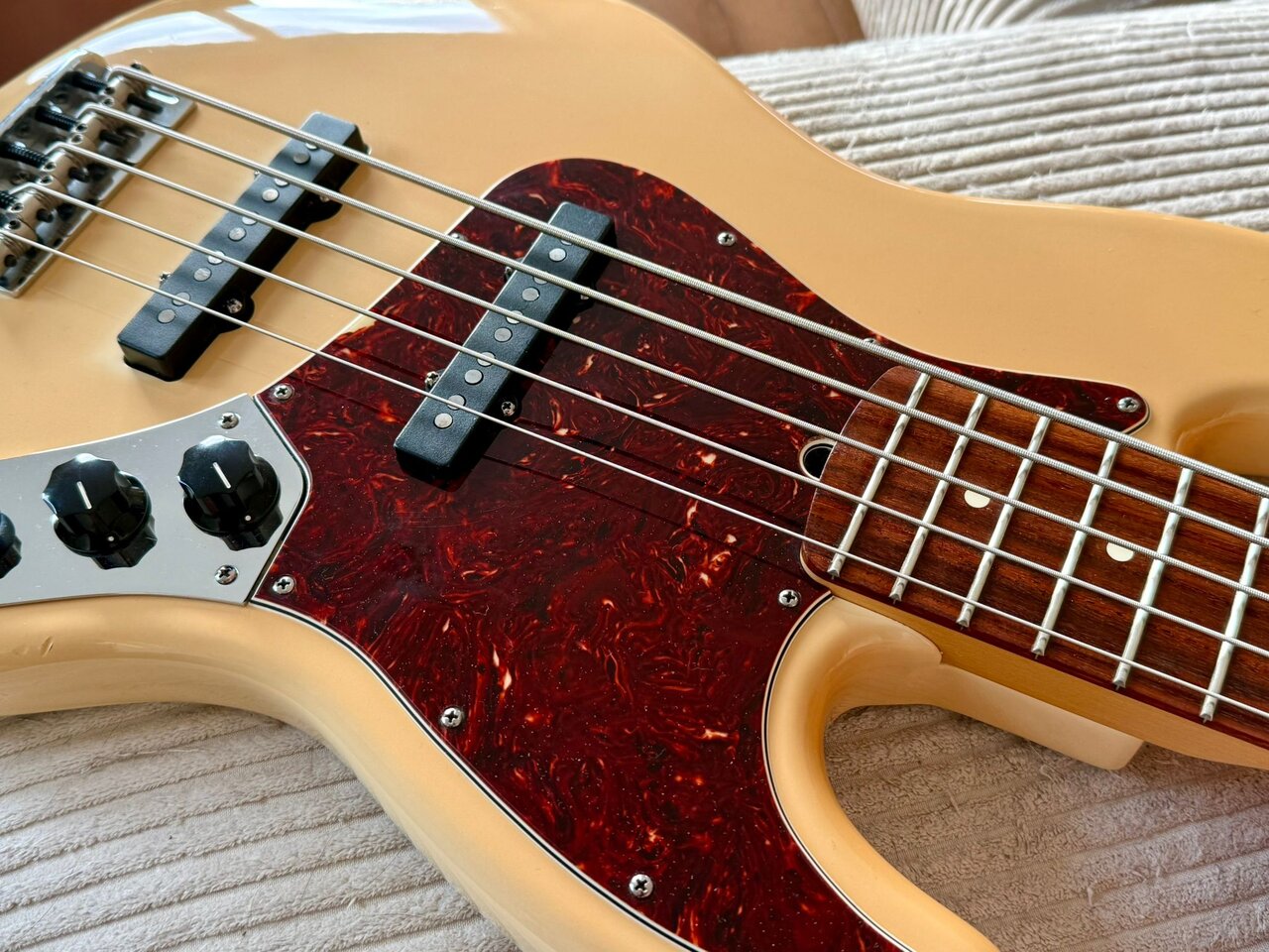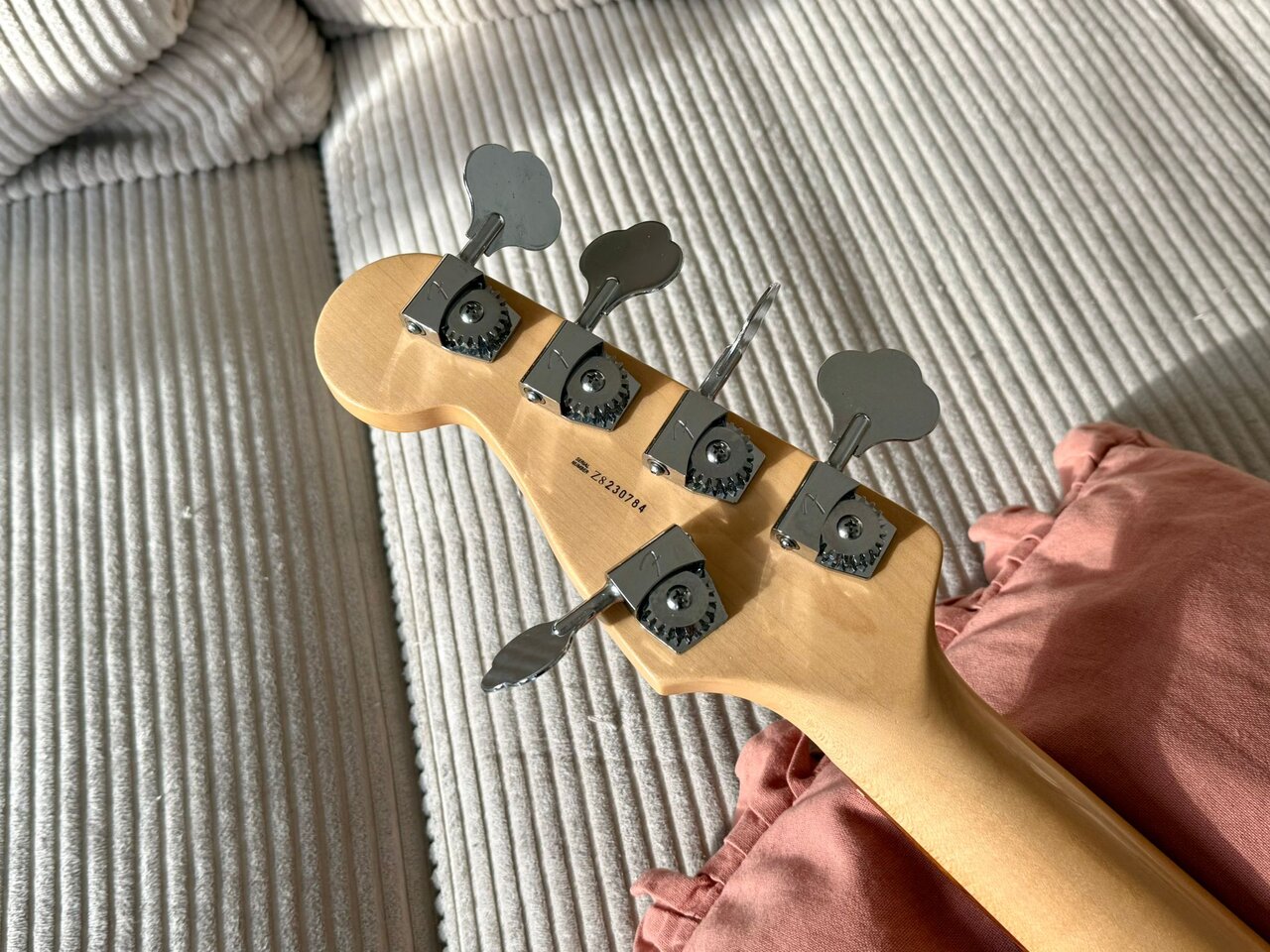 This Olympic White Jazz has coloured to blonde/butterscotch/vintage white due to the sun, it hasn’t been in a smoking household. Technically its perfect. One nick on the back of the neck around the 4th fret but that is the only thing worth mentioning. For a 17 year old bass it is in great condition.