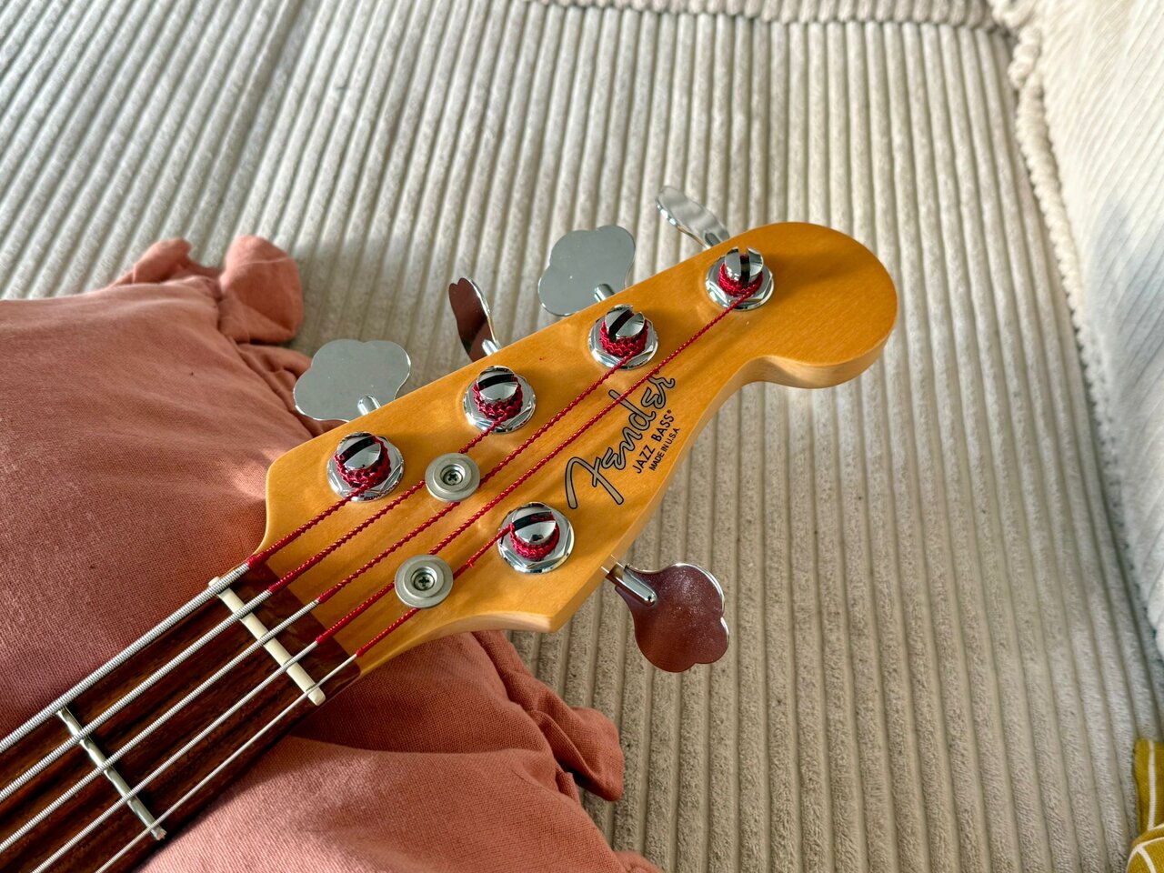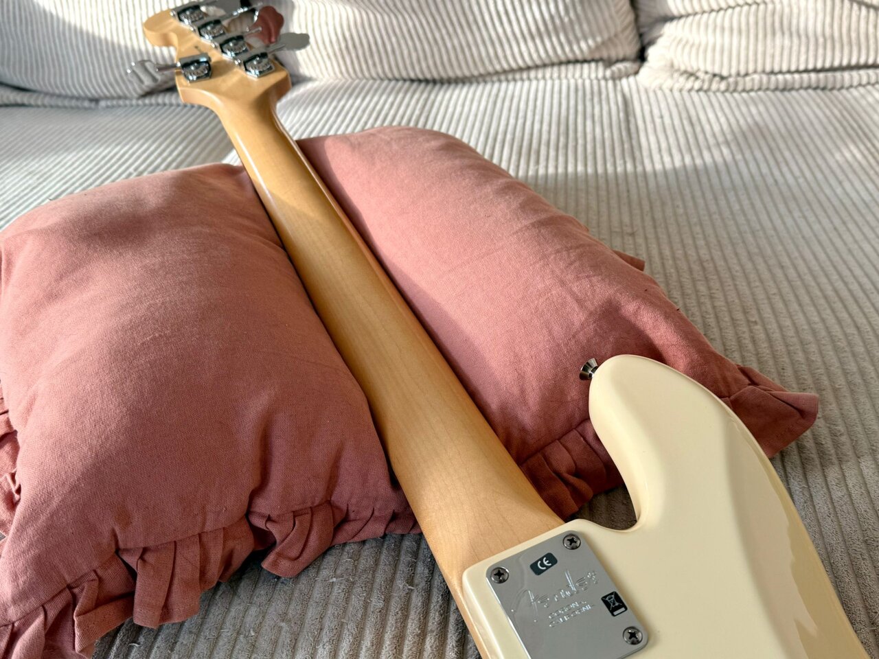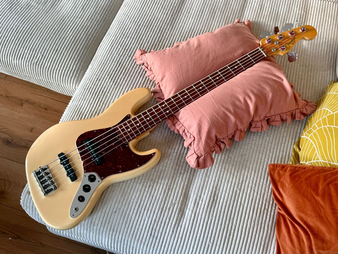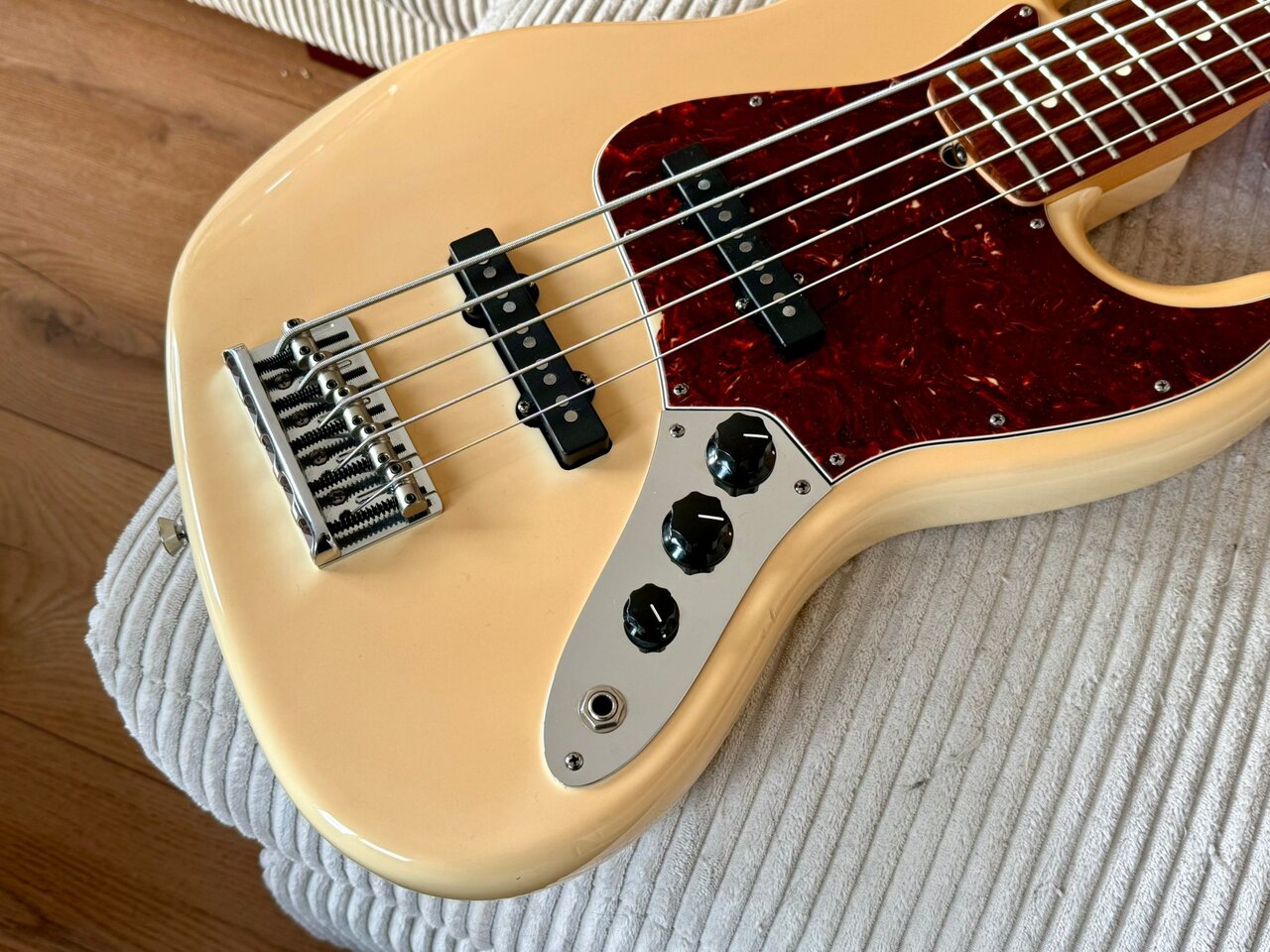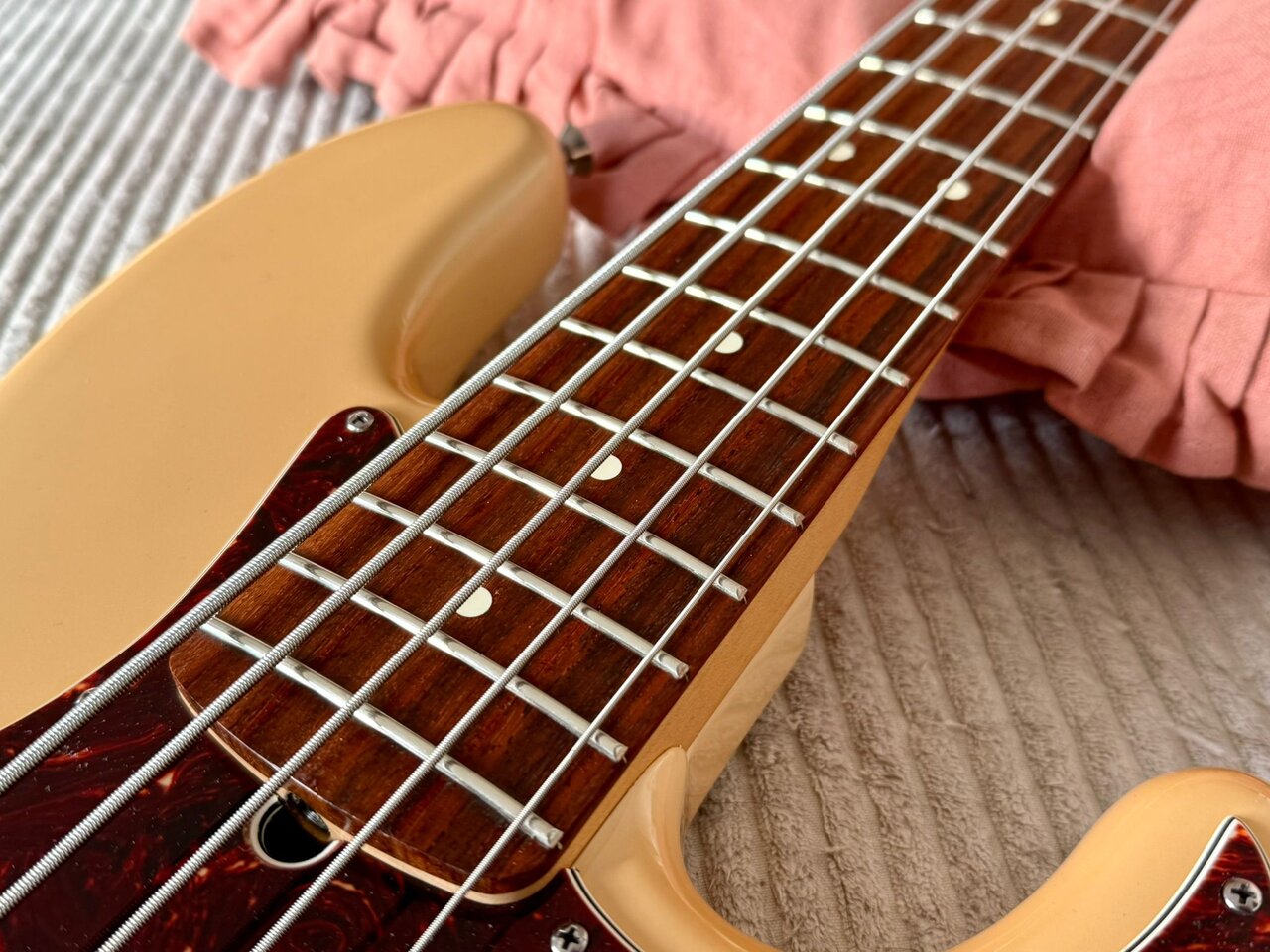 This Olympic White Jazz has coloured to blonde/butterscotch/vintage white due to the sun, it hasn’t been in a smoking household. Technically its perfect. One nick on the back of the neck around the 4th fret but that is the only thing worth mentioning. For a 17 year old bass it is in great condition.