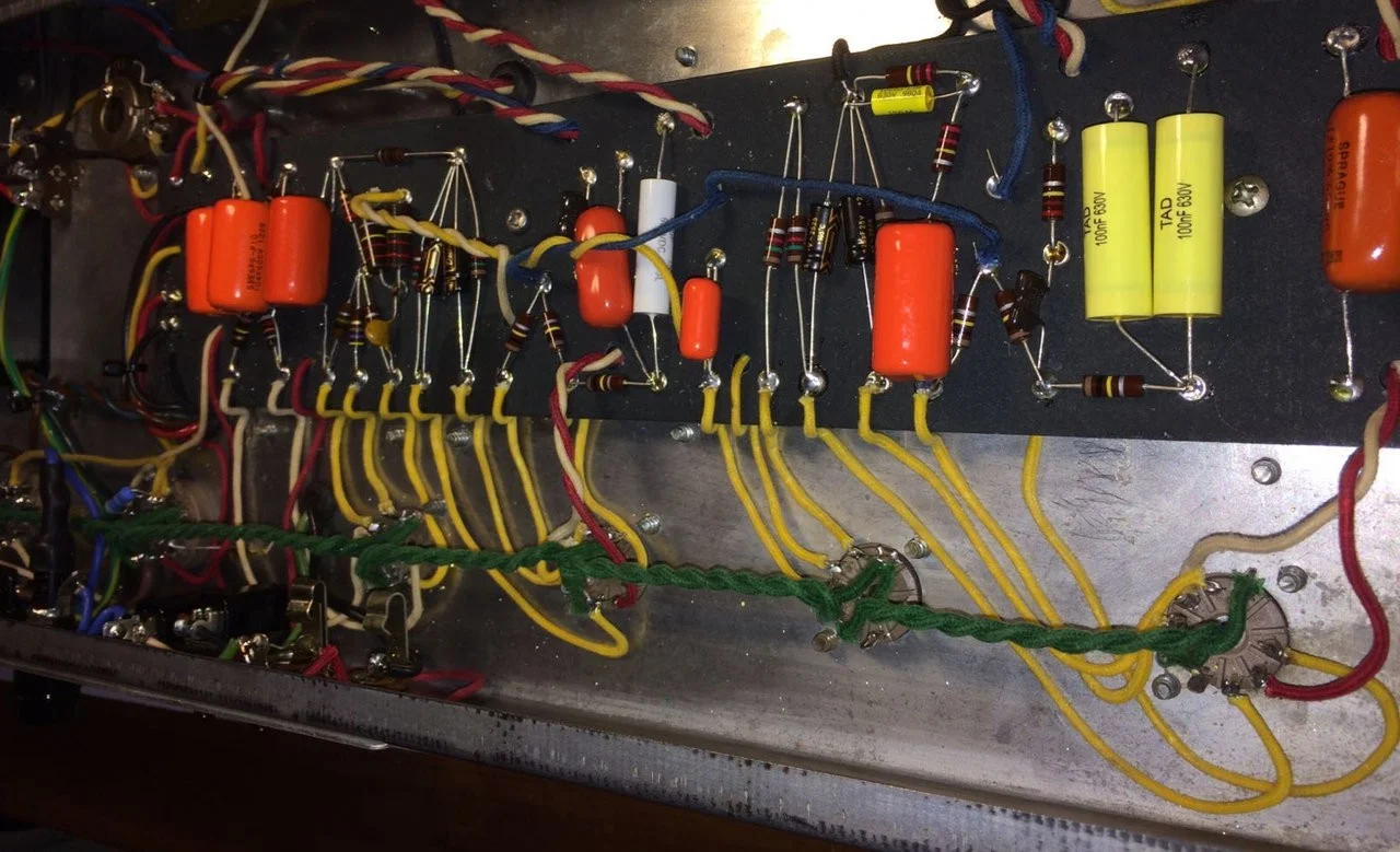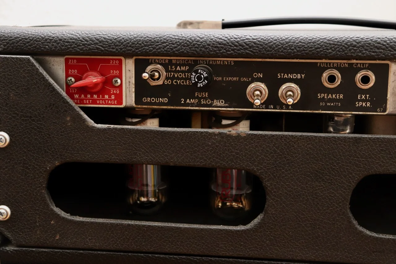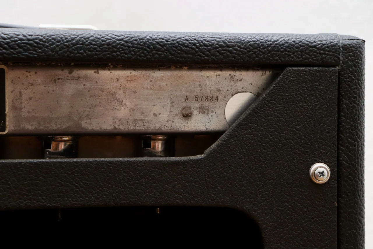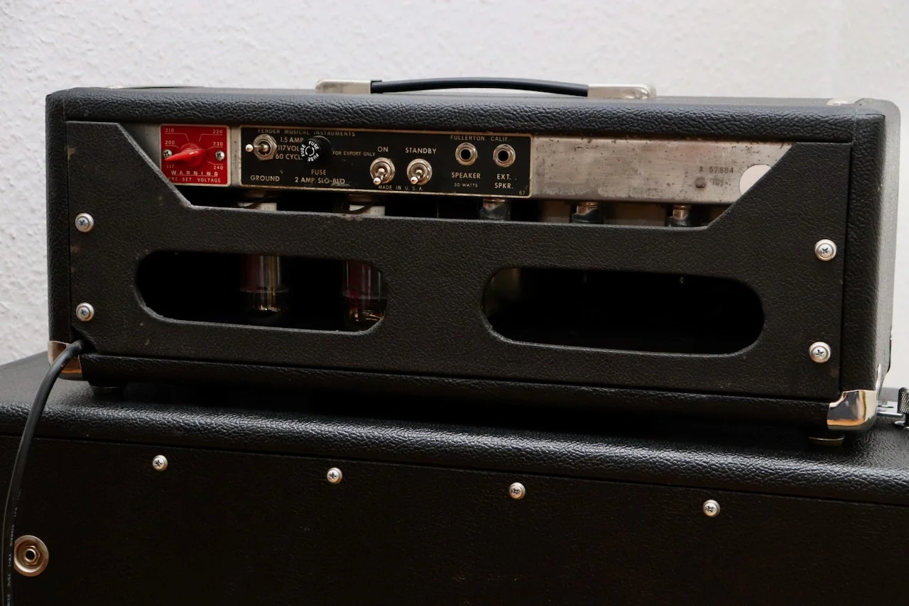 Das Topteil war ursprünglich ein Fender Export-Amp Topteil und wurde vom Fachmann soweit notwendig überholt. Das Gehäuse wurde komplett zerlegt und neu bezogen. Die Schaltung wurde neu aufgebaut und so modifiziert, dass sie der originalen Bassman Blackface-Schaltung entspricht.