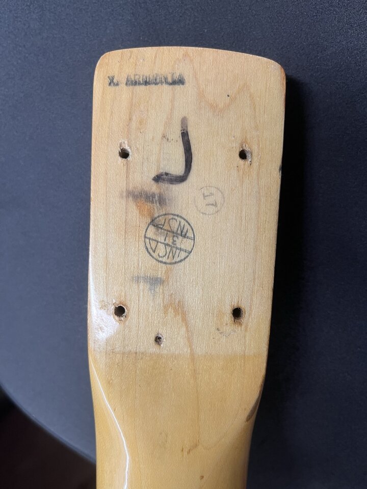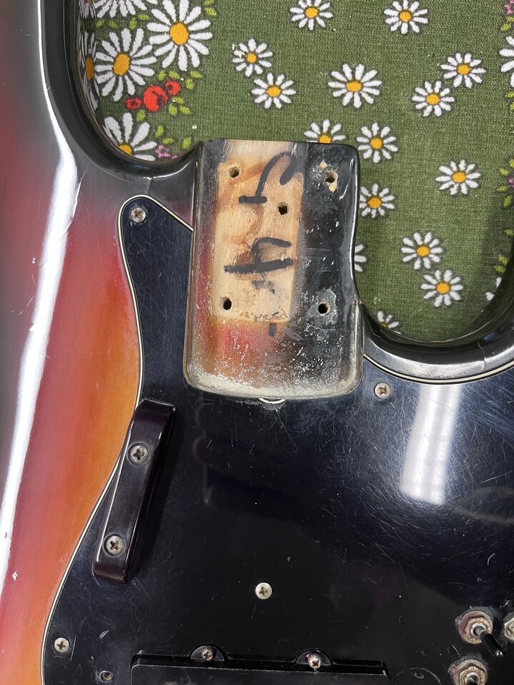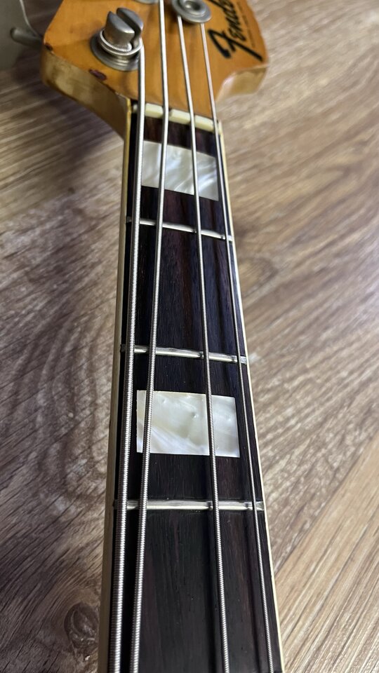 Der DiMarzio liefert einen warmen, vollen Ton, keinen mud. Für einen aufgehellten und saubereren Sound kann man mit dem zusätzlichen Mini-Schalter von Serie auf Parallel schalten: die Lautstärke sinkt minimal, aber die Mitten öffnen sich und bekommen eine akustischere Qualität. Dieser Bass ist ein sehr guter Player mit einem kräftigen Hals - beste Bespielbarkeit mit einem gut funktionierenden Halsstab und ohne Schnarren in den höheren Bünden. Dieser hat bereits das schwarze Pickguard (das natürlich original ist), hat aber noch eine 4-Schrauben-Befestigung des Halses. Die Potis sind auf Ende 1973 datiert, die Tonabnehmer beide auf 1974. Ich habe eine Menge Bilder, in denen ich gerne jedes Detail zeigen kann, um ev. Fragen zu beantworten.
