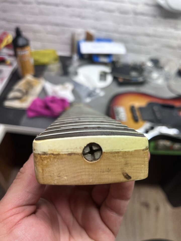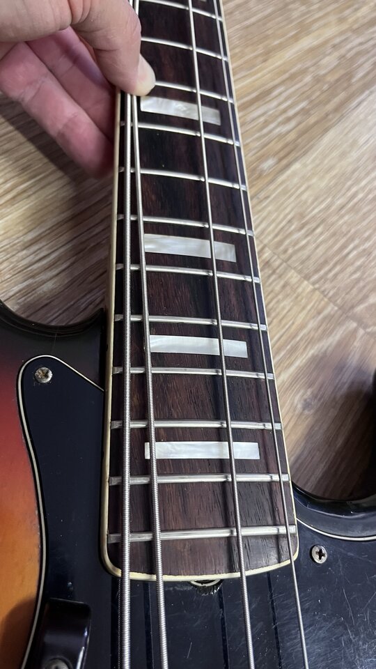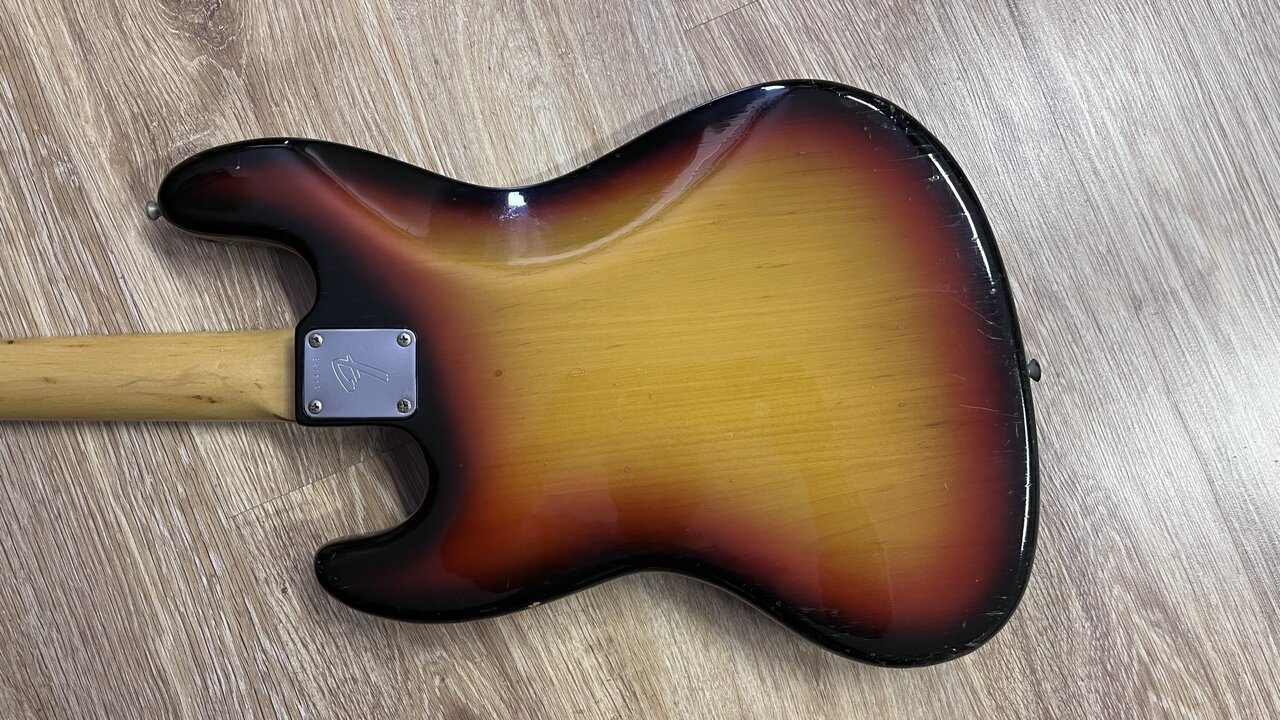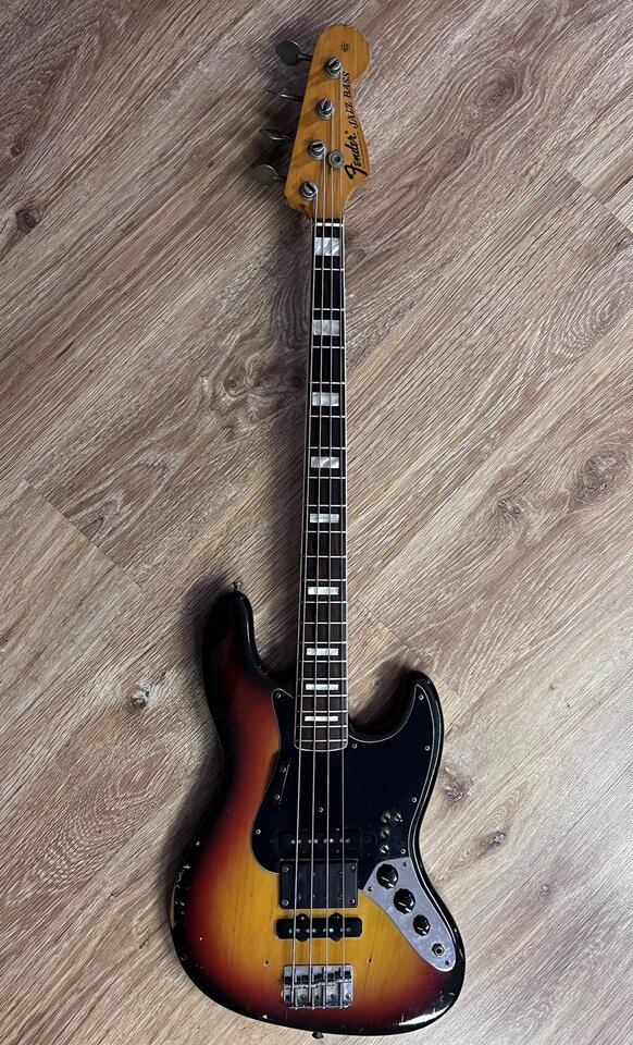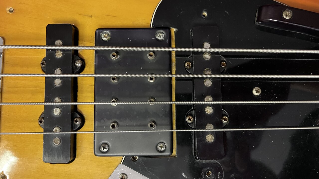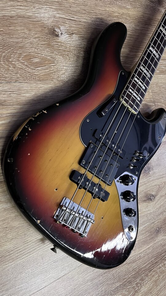 Der DiMarzio liefert einen warmen, vollen Ton, keinen mud. Für einen aufgehellten und saubereren Sound kann man mit dem zusätzlichen Mini-Schalter von Serie auf Parallel schalten: die Lautstärke sinkt minimal, aber die Mitten öffnen sich und bekommen eine akustischere Qualität. Dieser Bass ist ein sehr guter Player mit einem kräftigen Hals - beste Bespielbarkeit mit einem gut funktionierenden Halsstab und ohne Schnarren in den höheren Bünden. Dieser hat bereits das schwarze Pickguard (das natürlich original ist), hat aber noch eine 4-Schrauben-Befestigung des Halses. Die Potis sind auf Ende 1973 datiert, die Tonabnehmer beide auf 1974. Ich habe eine Menge Bilder, in denen ich gerne jedes Detail zeigen kann, um ev. Fragen zu beantworten.