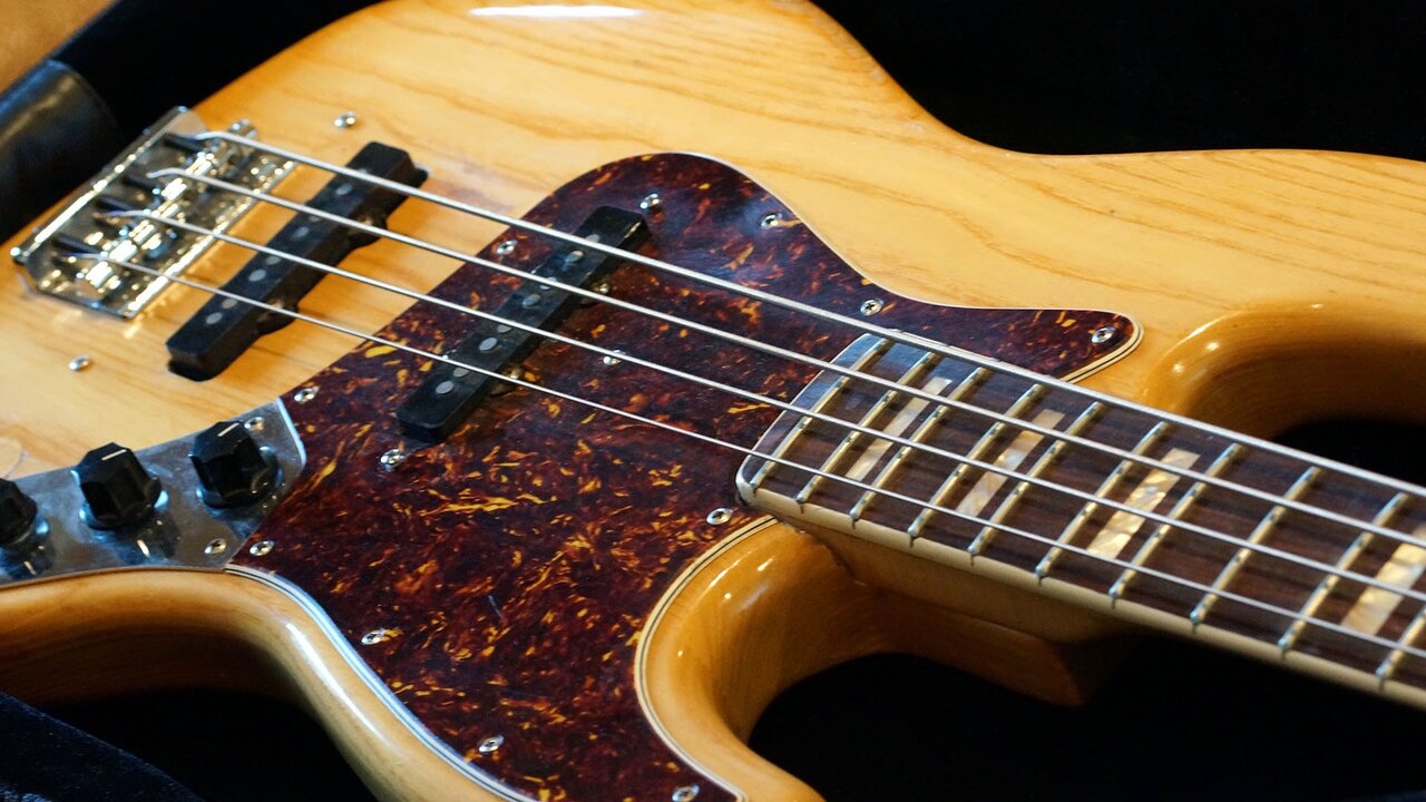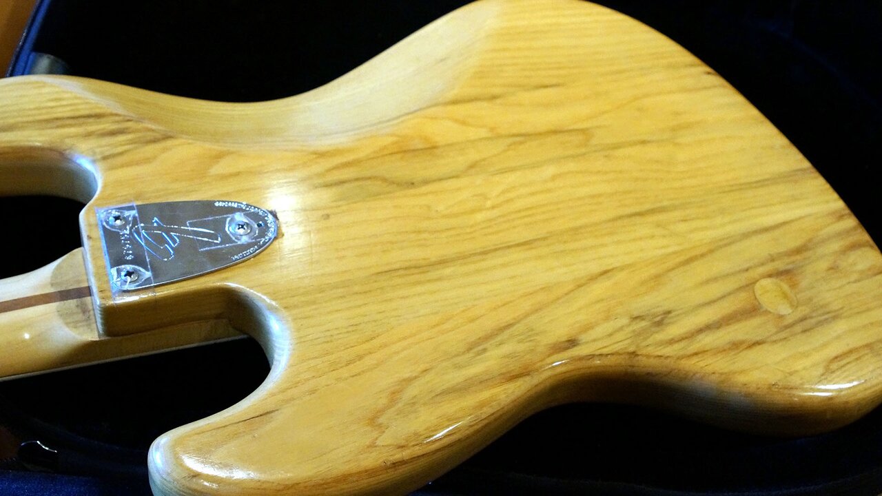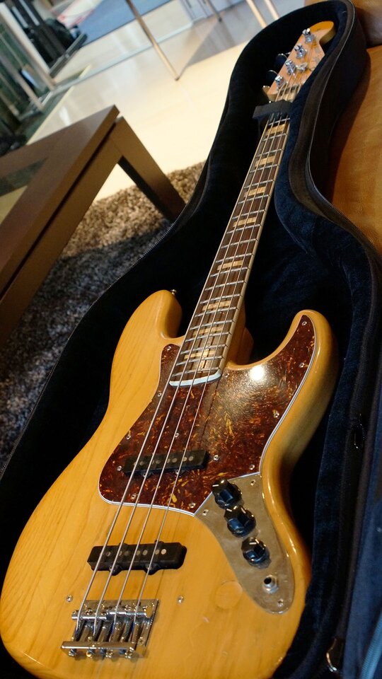 Fender Jazz Bass aus den 70ern, entlackt, mit Badass-Bridge und dunklem Griffbrett.