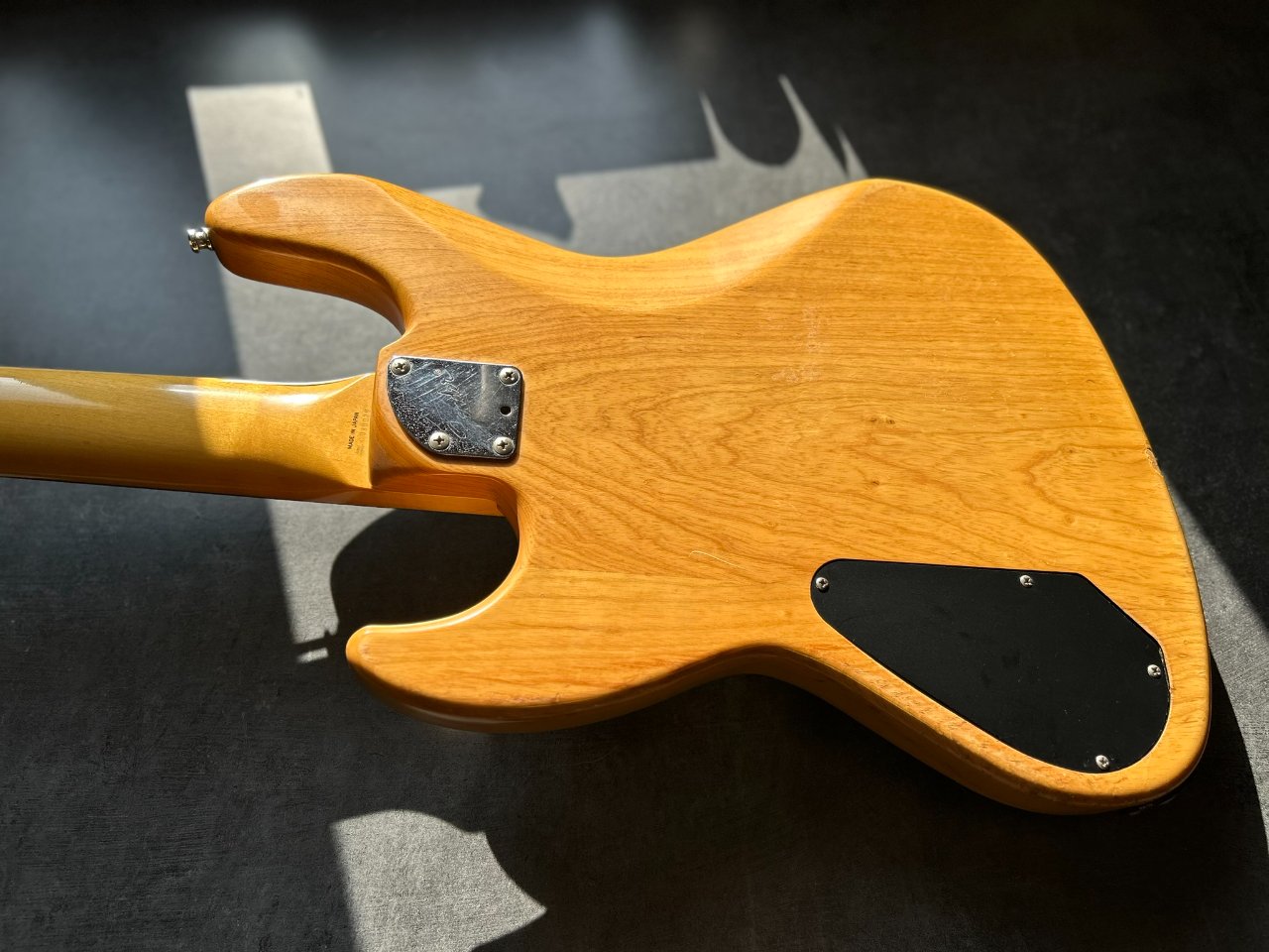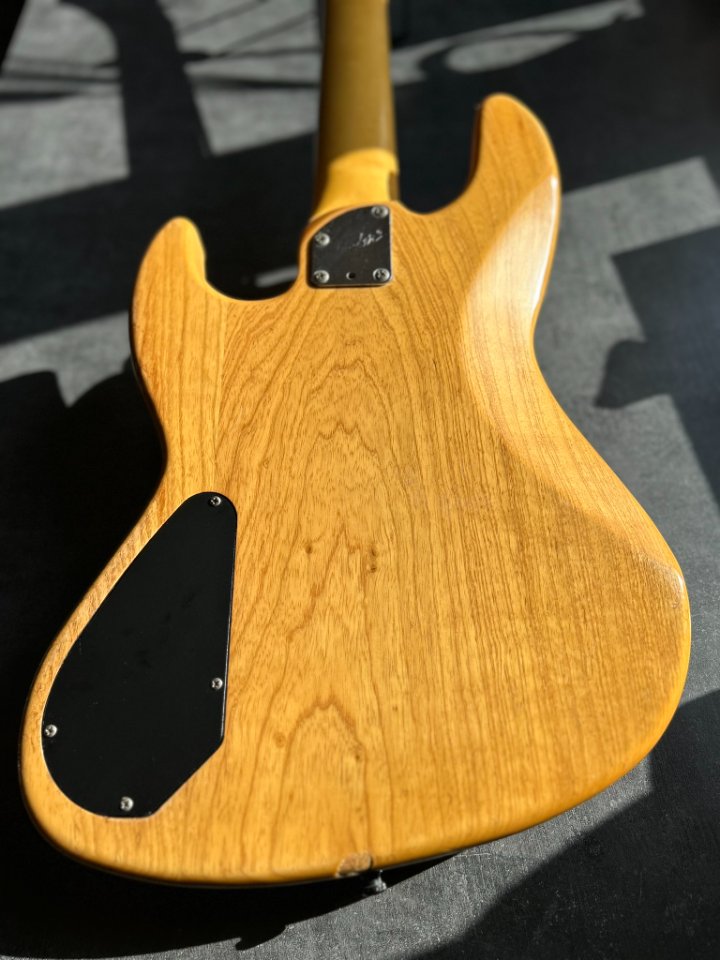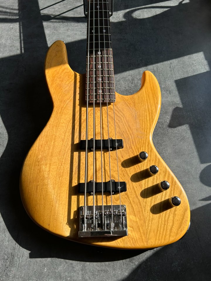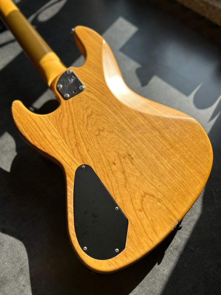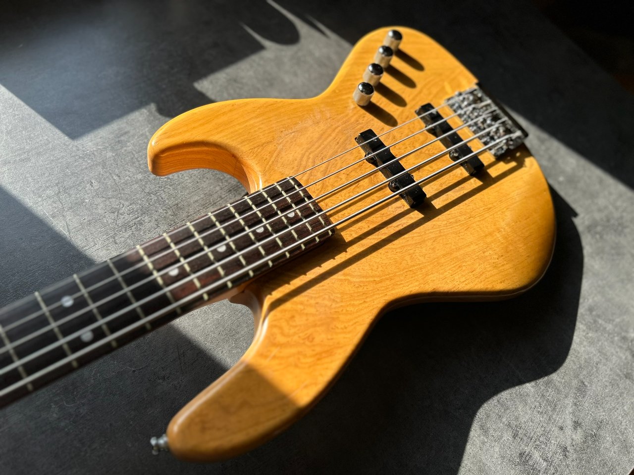 Der Korpus ist aus einem massiven Stück japanischem Sen gefertigt. Das Holz hat eine schöne, symmetrische Maserung, die unter einem dünnen transparenten Lack toll aussieht. Das Ganze wiegt etwa 4,3 kg. Der Hals ist aus Ahorn mit einem dicken Palisandergriffbrett und einem 44 mm breiten Messing-Sattel. Das Profil ist schlank und der Saitenabstand am Steg beträgt 17 mm – wenn Sie einen breiten „Airport” suchen, sind Sie hier falsch. Allerdings ist er nicht so schmal wie bei anderen japanischen 5-Saitern aus dieser Zeit. Ein guter Kompromiss.