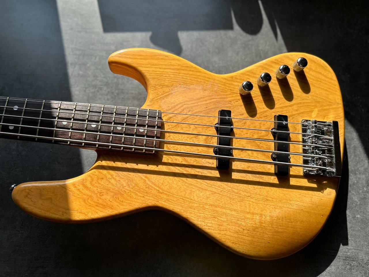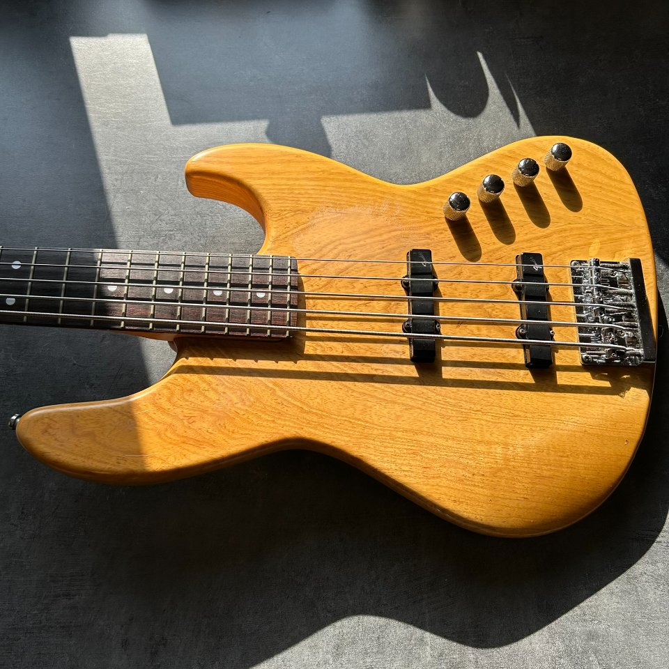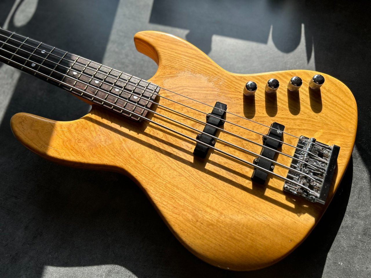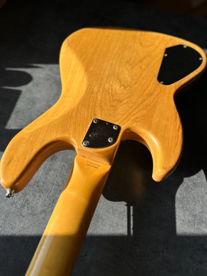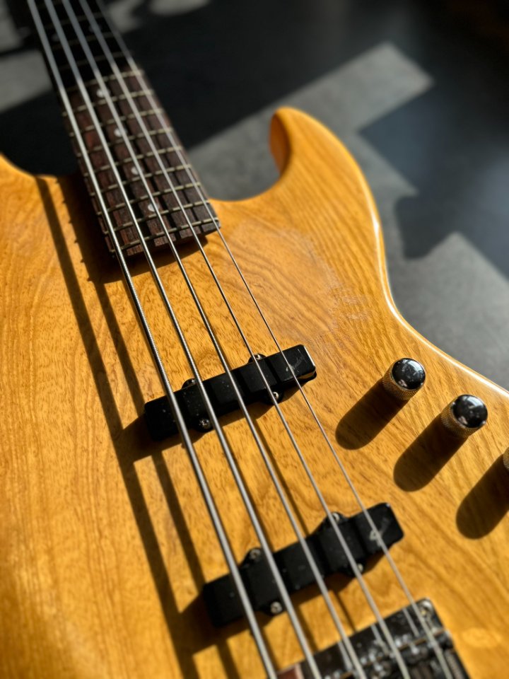 Der Korpus ist aus einem massiven Stück japanischem Sen gefertigt. Das Holz hat eine schöne, symmetrische Maserung, die unter einem dünnen transparenten Lack toll aussieht. Das Ganze wiegt etwa 4,3 kg. Der Hals ist aus Ahorn mit einem dicken Palisandergriffbrett und einem 44 mm breiten Messing-Sattel. Das Profil ist schlank und der Saitenabstand am Steg beträgt 17 mm – wenn Sie einen breiten „Airport” suchen, sind Sie hier falsch. Allerdings ist er nicht so schmal wie bei anderen japanischen 5-Saitern aus dieser Zeit. Ein guter Kompromiss.