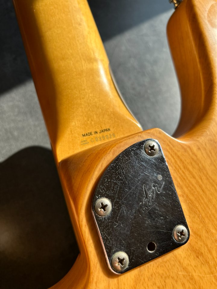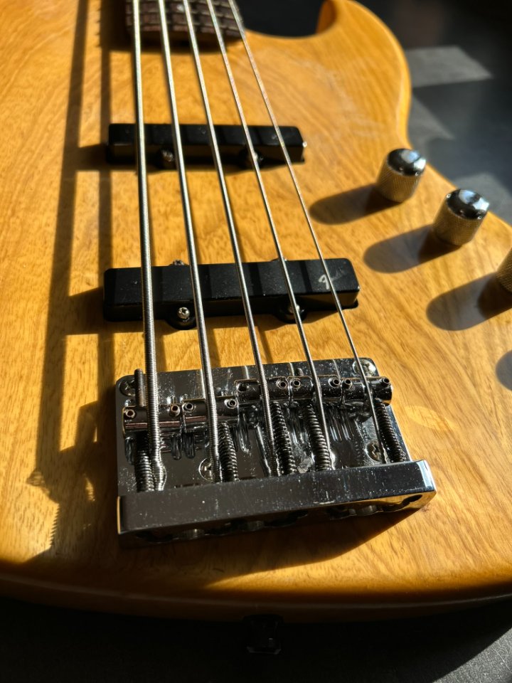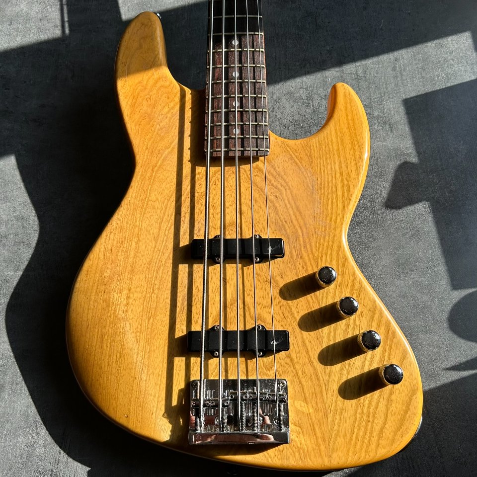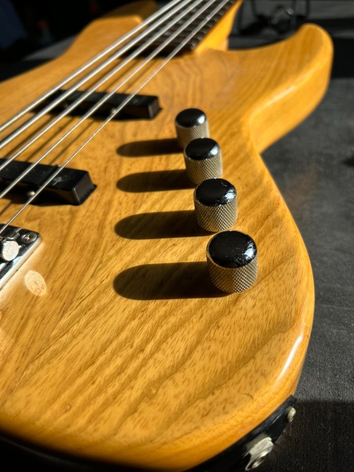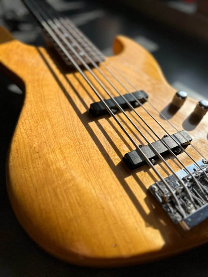 Der Korpus ist aus einem massiven Stück japanischem Sen gefertigt. Das Holz hat eine schöne, symmetrische Maserung, die unter einem dünnen transparenten Lack toll aussieht. Das Ganze wiegt etwa 4,3 kg. Der Hals ist aus Ahorn mit einem dicken Palisandergriffbrett und einem 44 mm breiten Messing-Sattel. Das Profil ist schlank und der Saitenabstand am Steg beträgt 17 mm – wenn Sie einen breiten „Airport” suchen, sind Sie hier falsch. Allerdings ist er nicht so schmal wie bei anderen japanischen 5-Saitern aus dieser Zeit. Ein guter Kompromiss.