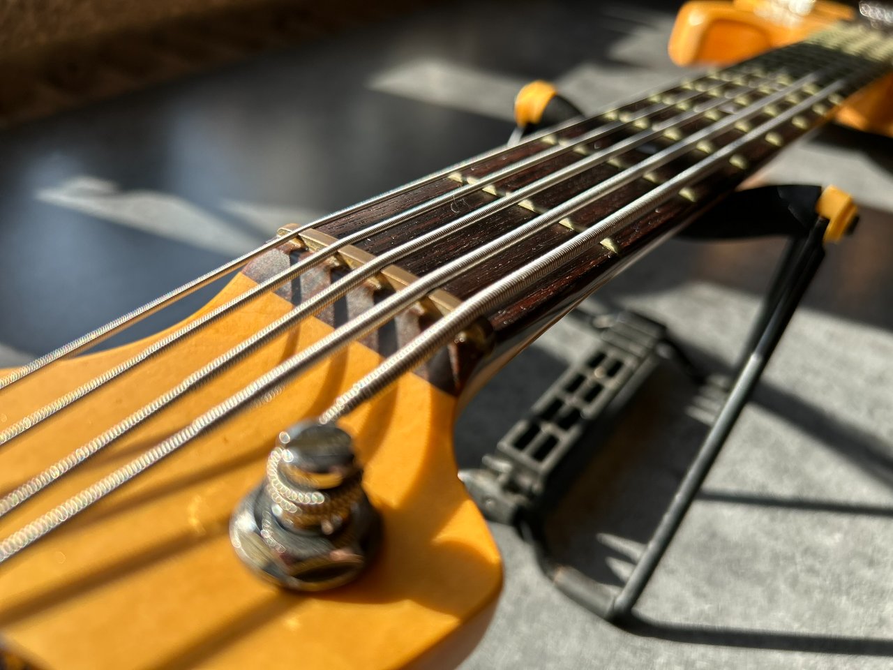Technisch einwandfrei. Der Halsstab funktioniert reibungslos, die Bünde sind in einem hervorragenden Zustand und erfordern keine Eingriffe. Derzeit ist der Bass tief eingestellt – die Saitenlage am 12. Bund reicht von 1,8 mm (G-Saite) bis 2,4 mm (H-Saite), was einen hohen Spielkomfort gewährleistet. Intonation, Mechaniken, Steg – keine Probleme.