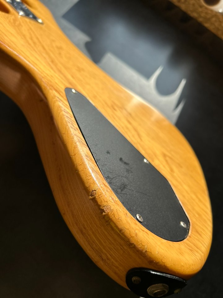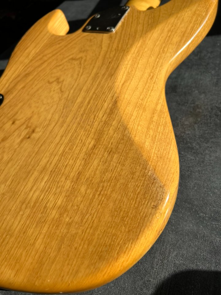 Der Zustand des Instruments ist für 40 Jahre wirklich gut. Zu erwähnen sind: eine Absplitterung im Lack und ein paar Dellen an der Unterseite des Korpus, ein typischer Riss (im Lack/Holz? er wird nicht schlimmer) in der Nähe einer der Mechaniken und einige Abnutzungsspuren durch Daumen- und Slap-Spiel unter den Saiten. Abgesehen von einem ausgetauschten Gurtknopf ist das Instrument zu 100 % original.