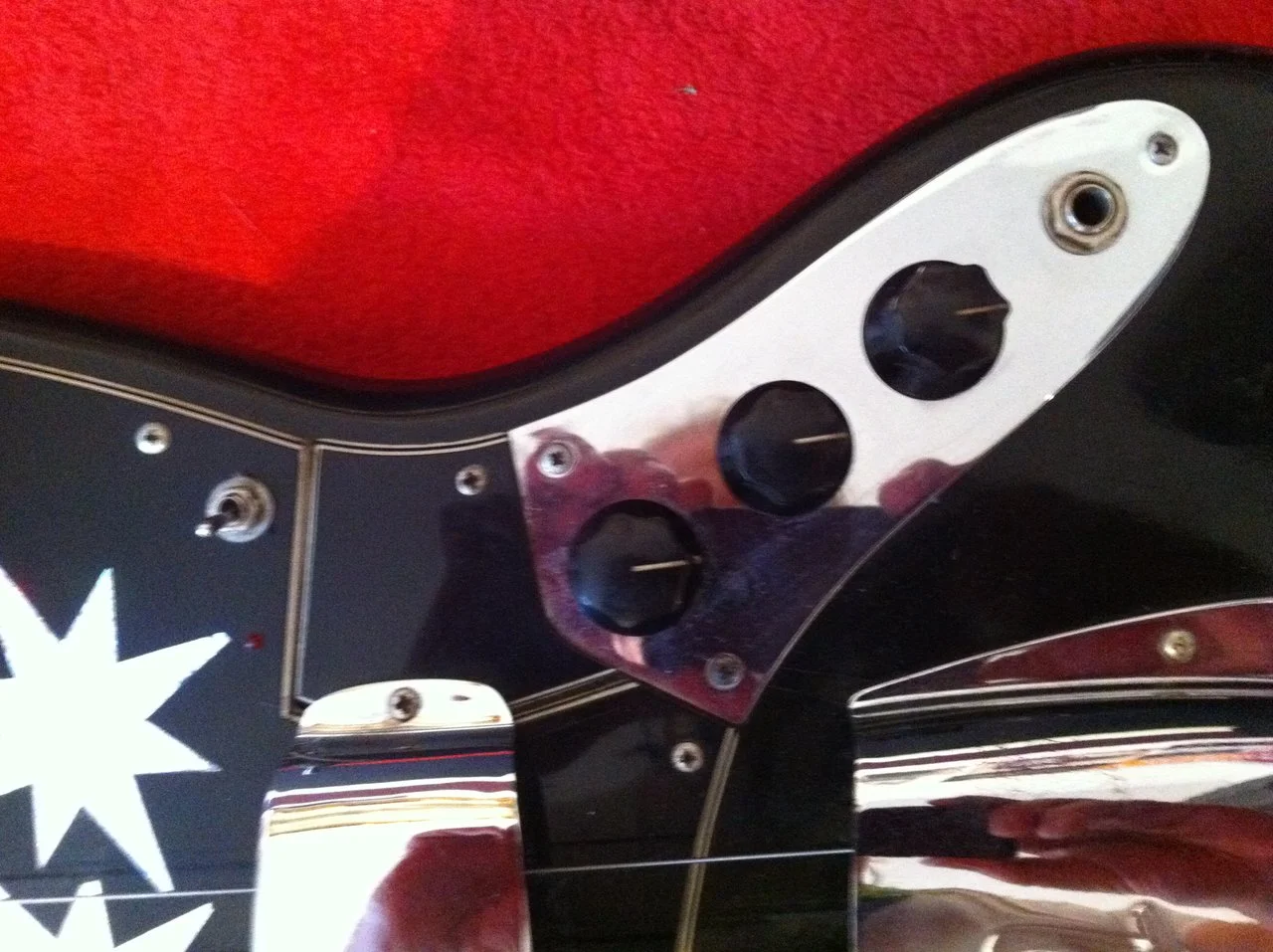 Der Bass wurde mit einem Funksender nachgerüstet (dabei wurden keine Fräsungen vorgenommen, das originale Pickguard wurde aber entsprechend „ausgeschnitten“); der Empfänger ist dabei (siehe Fotos).