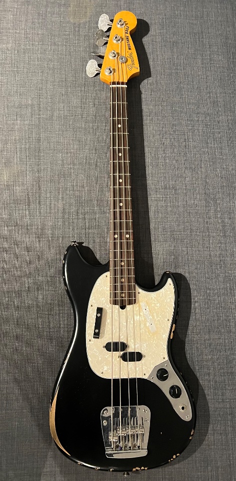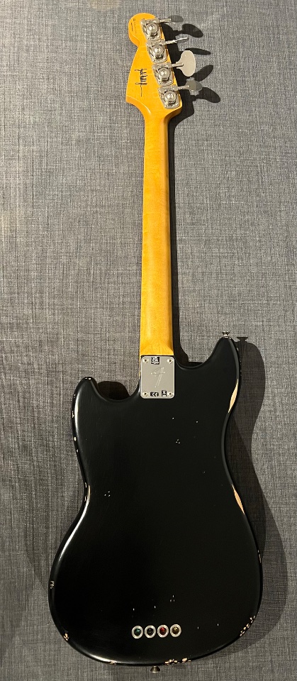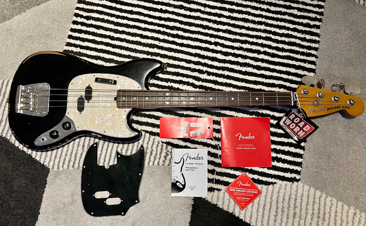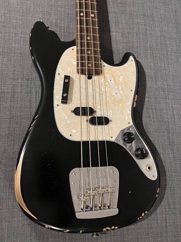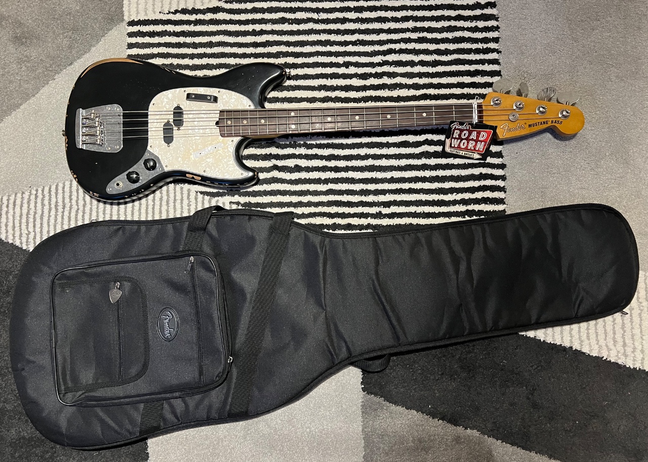 Verkaufe meinen Fender JMJ Mustang Bass in schwarz inklusive Zubehör, schwarzes Schlagbrett und Gigbag.