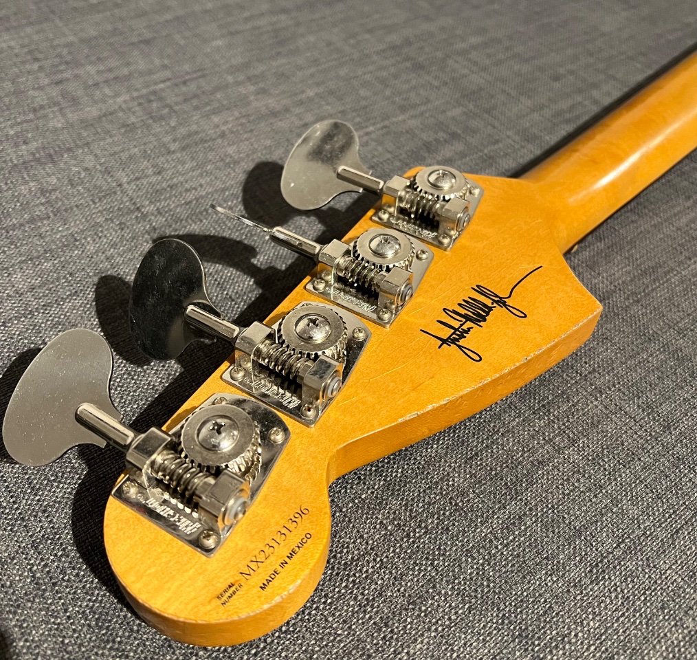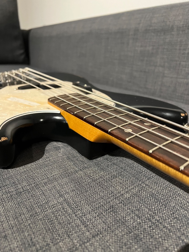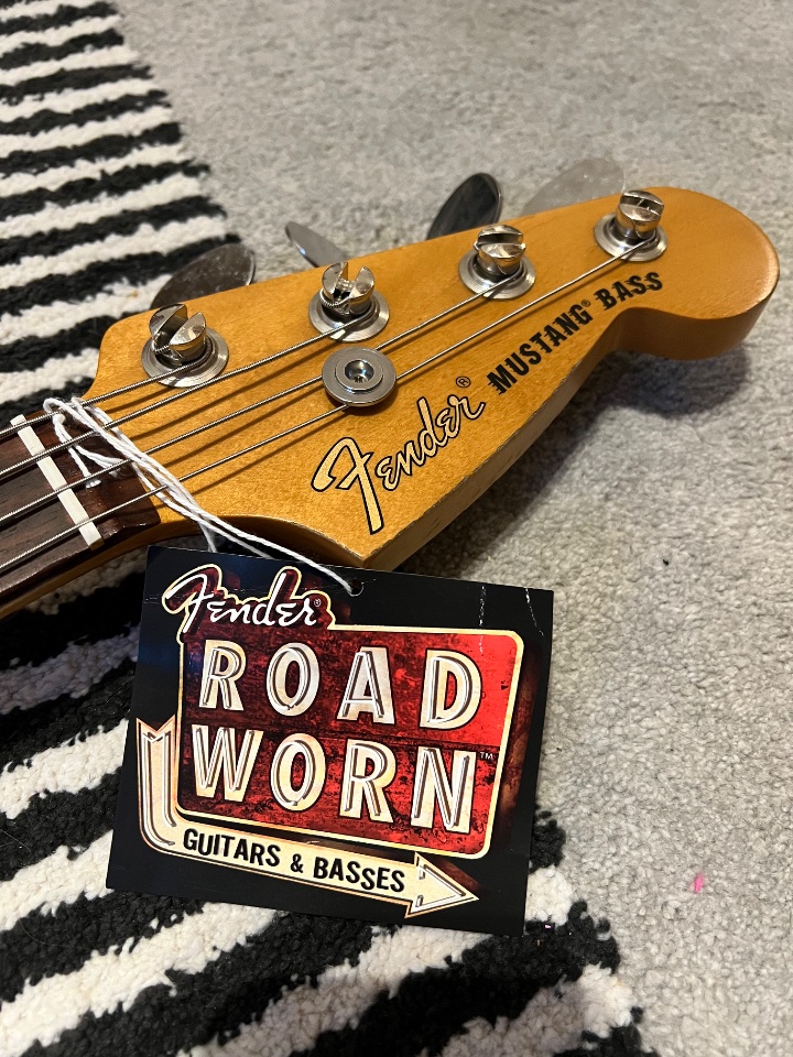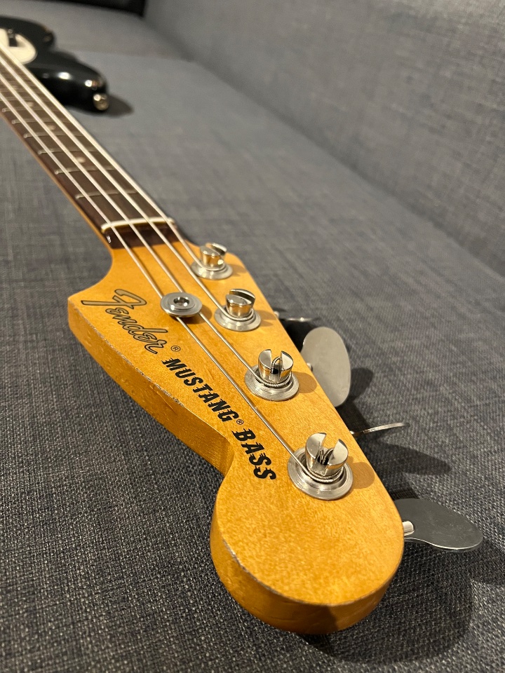 Der Mustang ist so gut wie neu, keine Beschädigungen (außer natürlich das Aging), Halsstab und Bünde sind Top, Elektronik funktioniert tadellos.