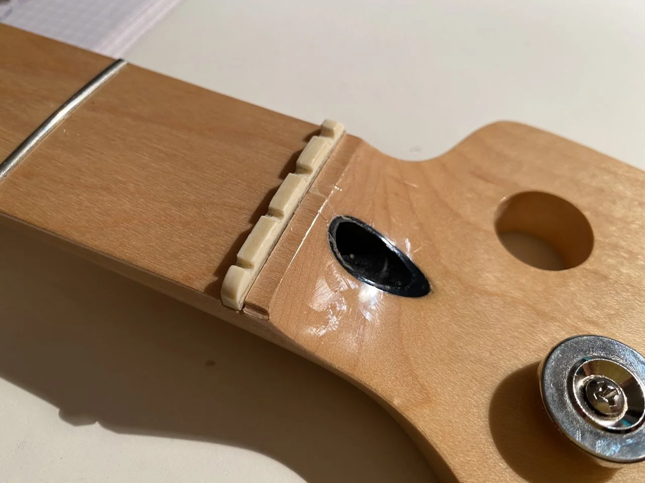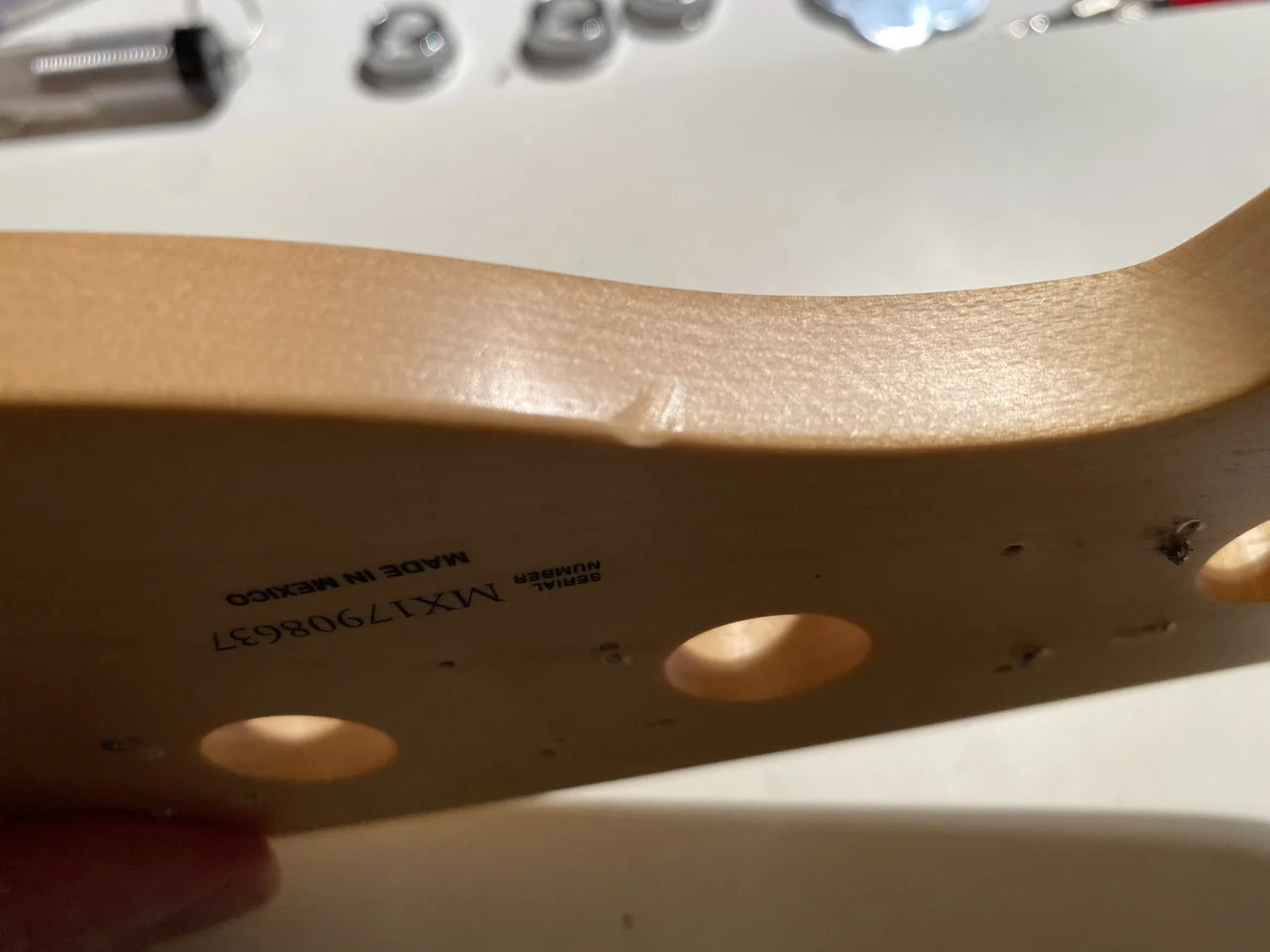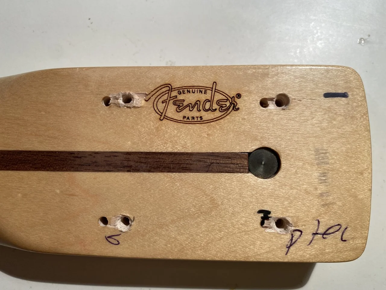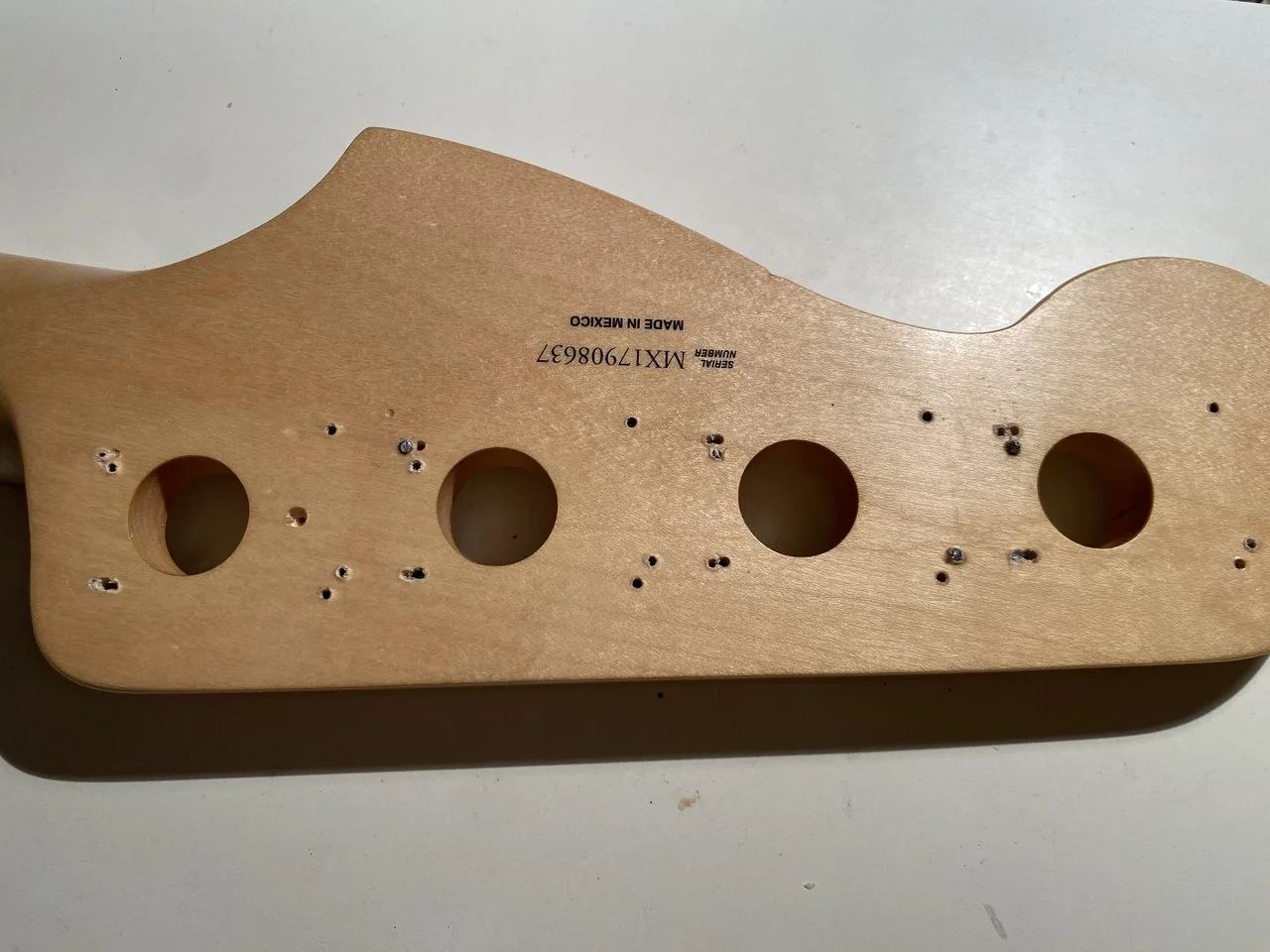 Aus meinem Bastel-Preci. Ich war etwas wild unterwegs an der Kopfplatte, da gibt es mehrere „Sets“ an Bohrlöchern - hier und da steckt auch mal ein Schräubchen mit abgebrochenem Kopf noch drin. Alles in den Bereichen, die unter den Mechaniken verschwinden, aber auf ein wenig Frickelei muss man sich einstellen.