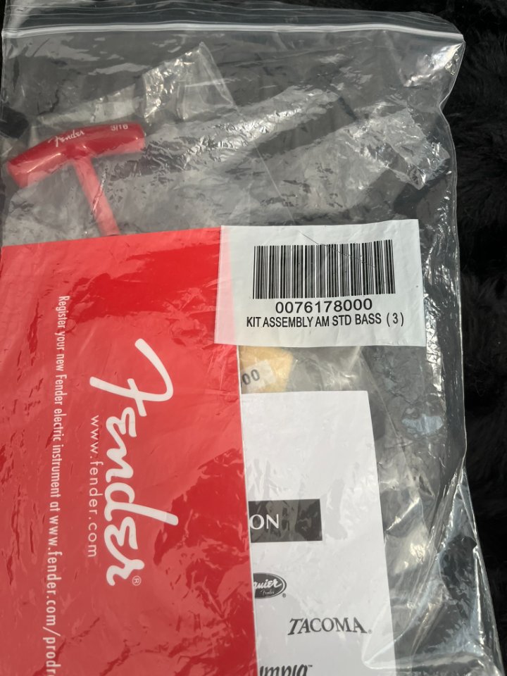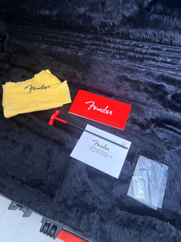 Er wird mit dem gesamten Zubehör geliefert, das ich im Laden gekauft habe: einem Halseinstellschlüssel, einem Satz Inbusschlüssel und sogar dem originalen Fender-Reinigungstuch.