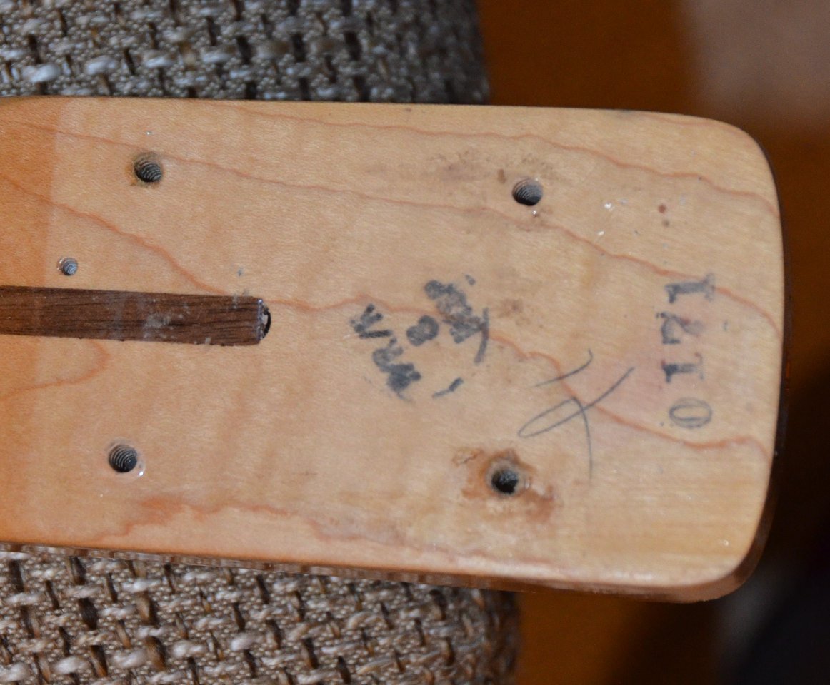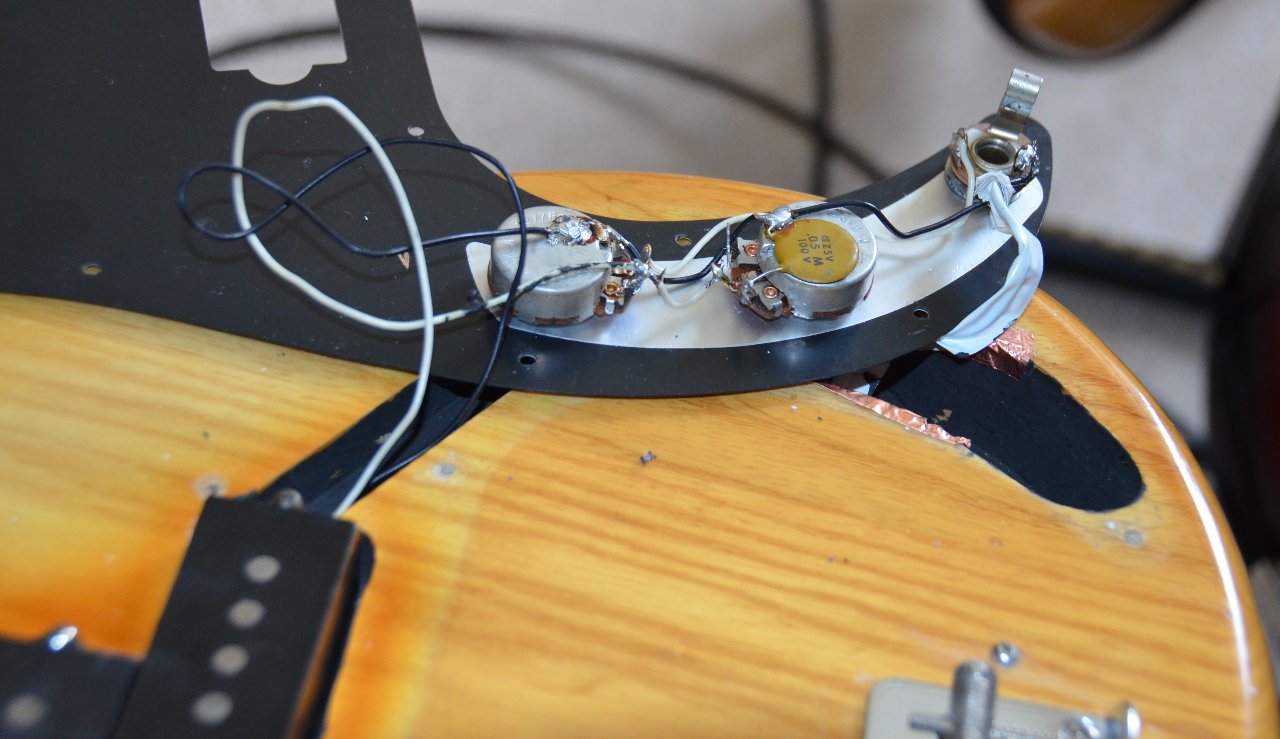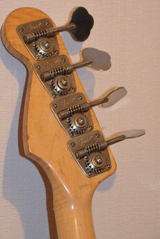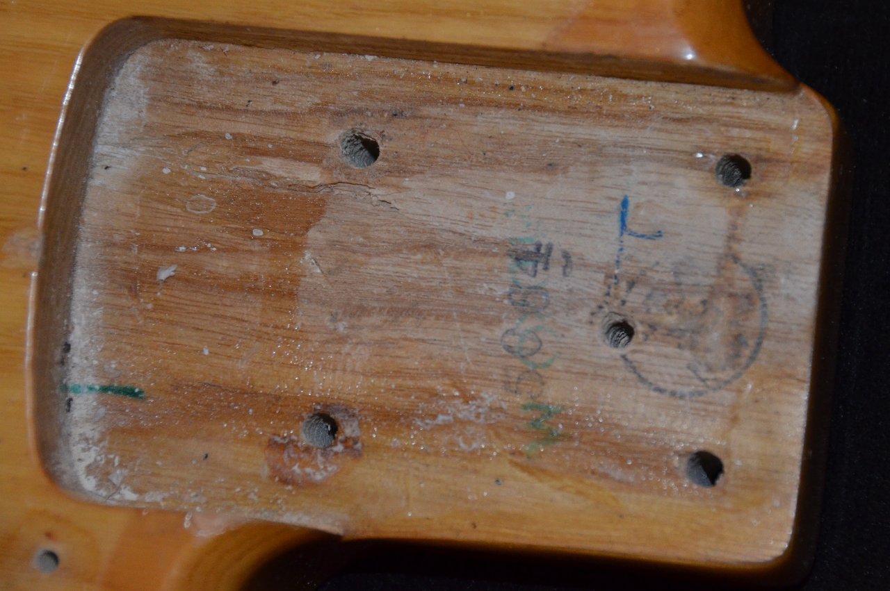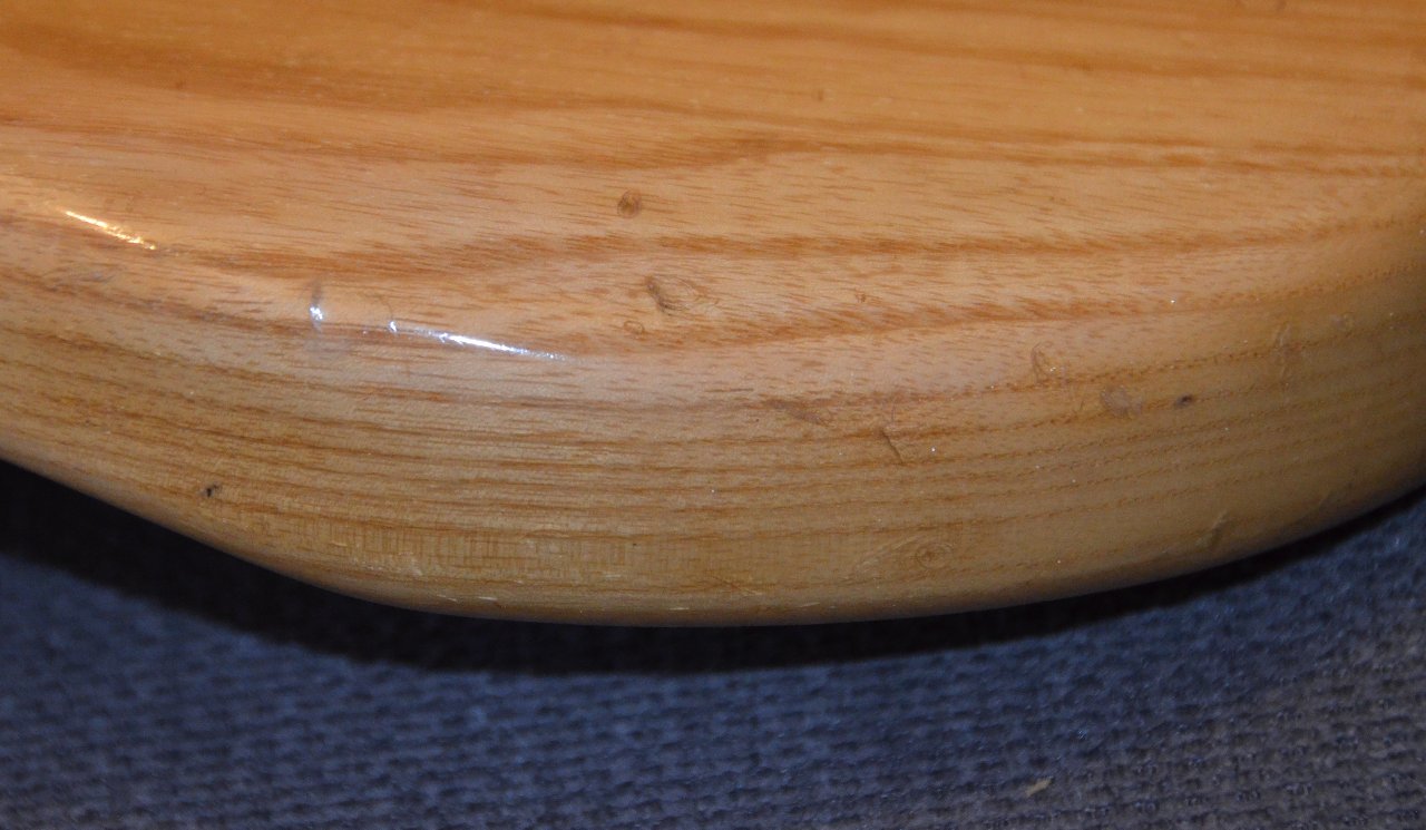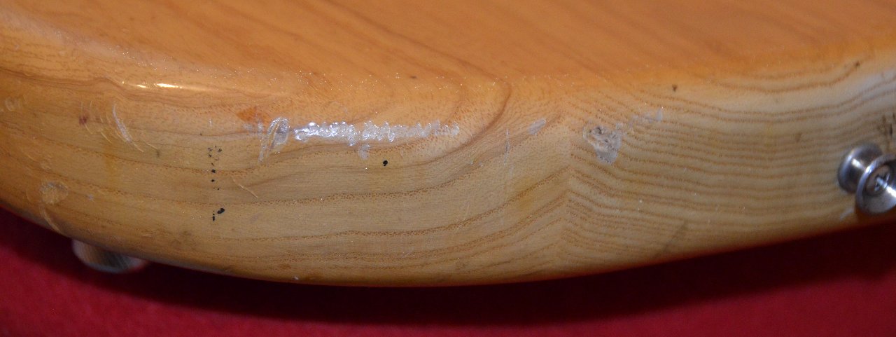 An dem Instrument ist alles noch original bis auf die Brücke und das Pickguard und die Potiknöpfe (glaub ich). Das Griffbrett wurde mal neu lackiert, die Bünde sind kaum abgenutzt, hab auch nur flats gespielt. Es gibt einige Dings und Dongs, siehe Fotos, die Lackoberfläche des Korpus ist teilweise flächenhaft leichtgradig angekratzt, es gibt eine unebene Stelle im Spielbereich der rechten Hand (siehe Foto), die ich der Vollständigkeit halber erwähne, alles kosmetische Veränderungen auch auf der Kopfplatte, die einem so alten Teil zustehen, das viel gespielt wurde und entsprechend eingeschwungen ist (Mojo!). Gewicht ist übrigens 4,3kg. Ich verkaufe ihn auch nur aus Geldmangel.
