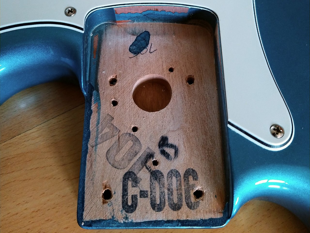 Der Body ist komplett original bestückt und in einem sehr guten Zustand ohne Dellen, Dings & Dongs. Das Gewicht liegt bei 2640g. Halsplatte und Schrauben sind dabei. Die Halstasche misst 63.3mm und passt entsprechend für Hälse mit Fender-Fuß.