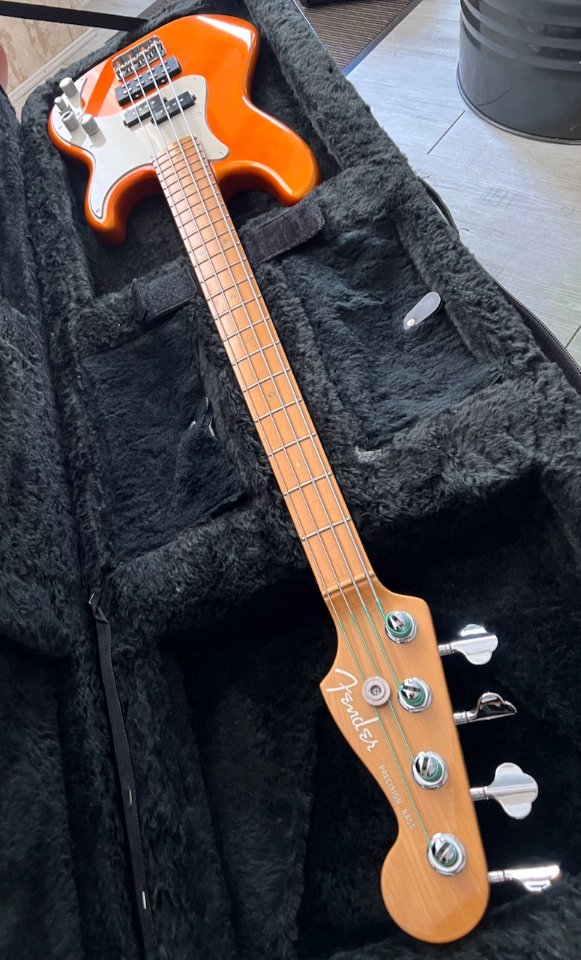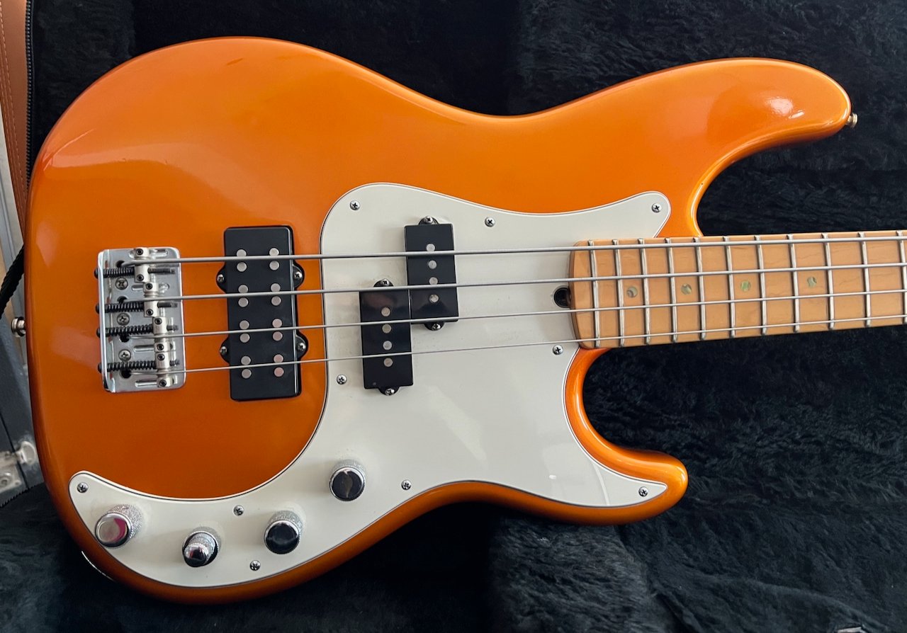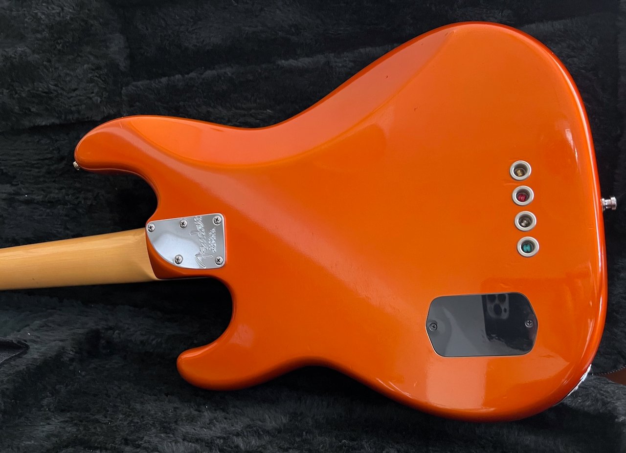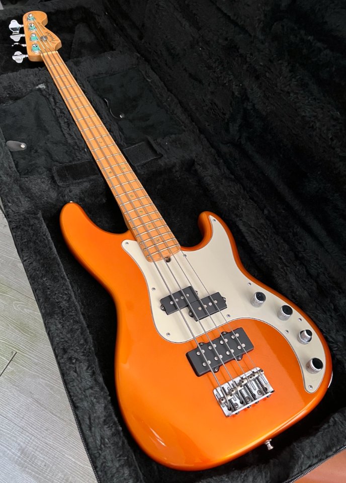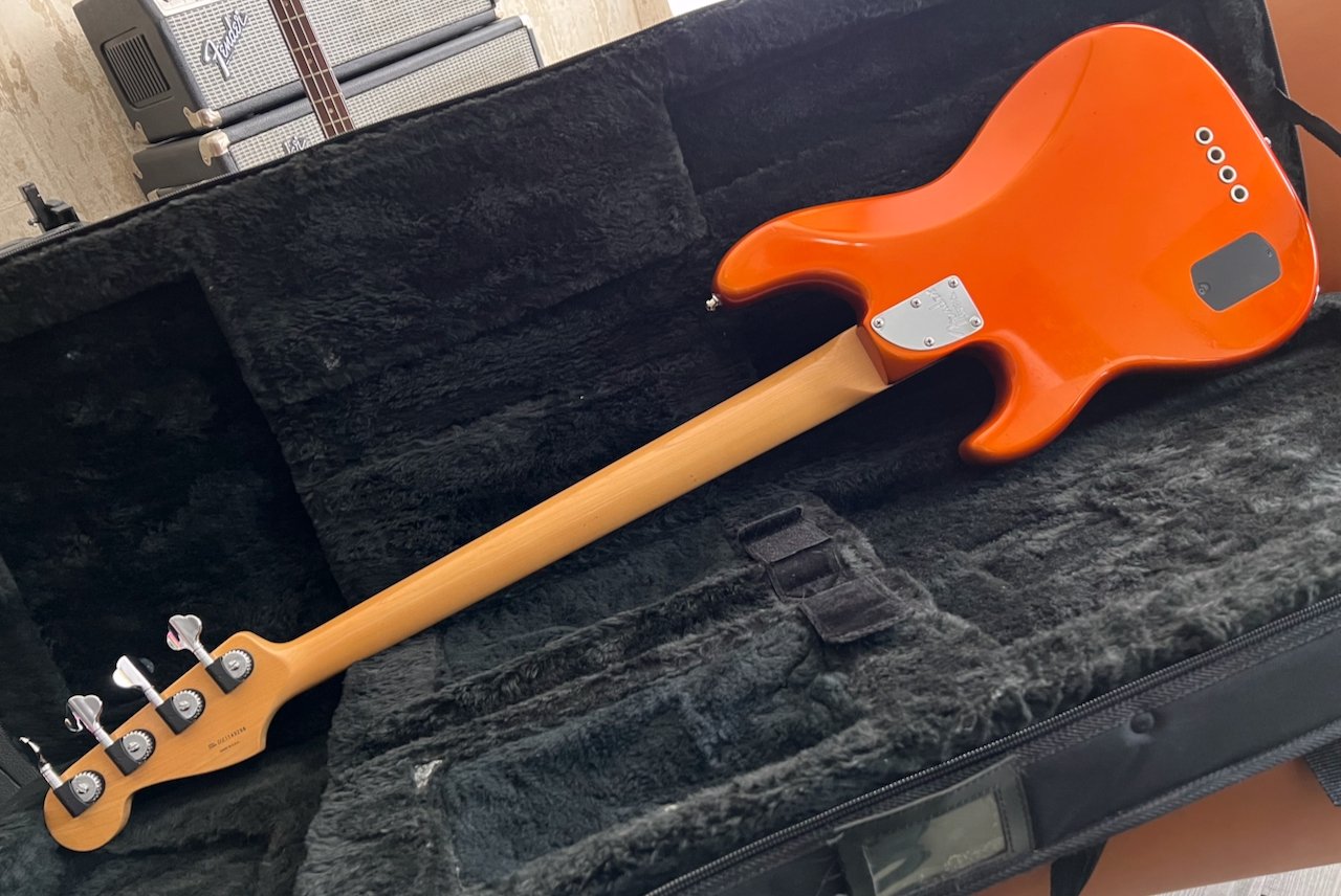 Zum Verkauf kommt dieser gebrauchte Fender Precision Deluxe Bass von 2001 (U.S.A.) in der seltenen, tollen Farbe Autumn Blaze Metallic!