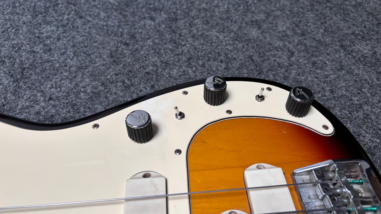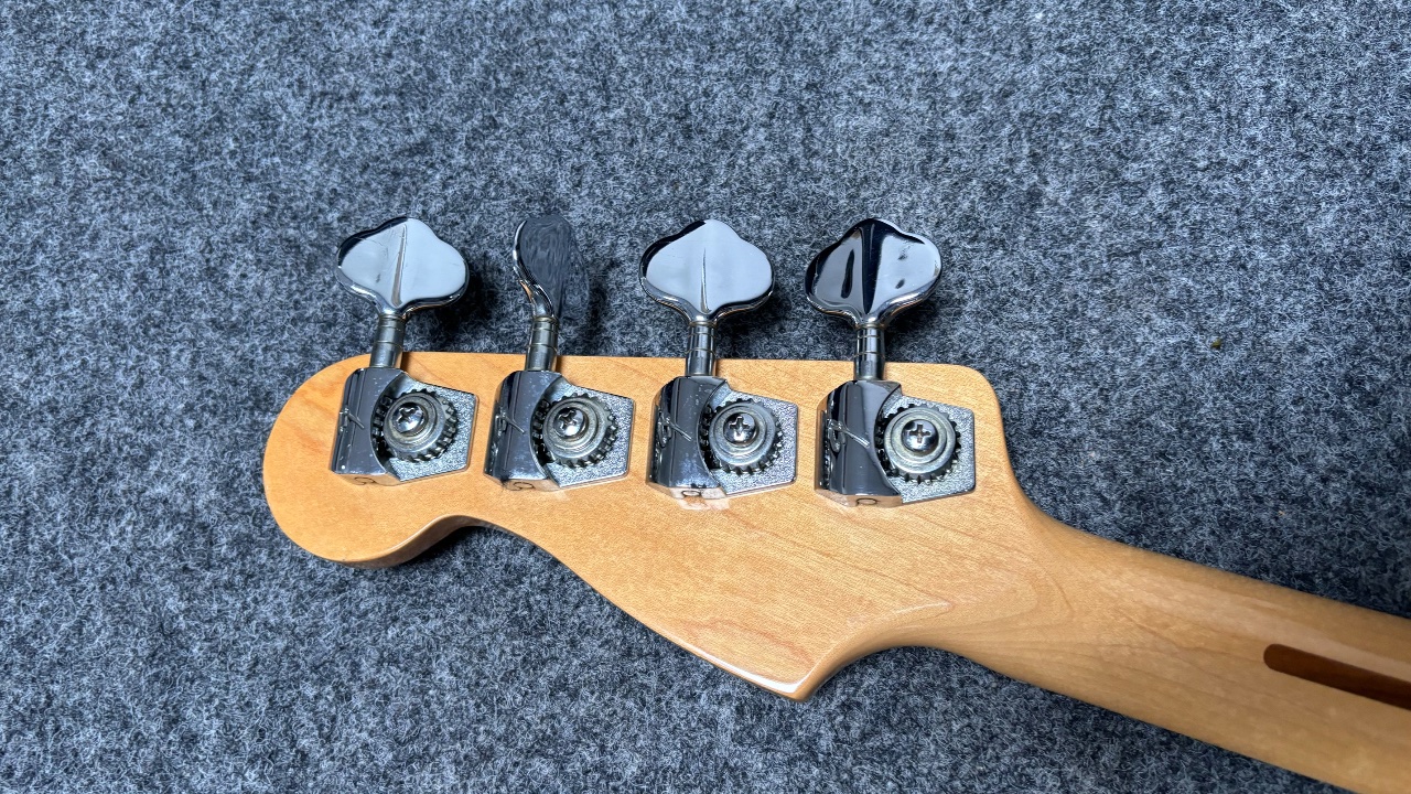Top-Qualität aus Fullerton (Dan Smith’s Ära): Hochwertige Hardware wie Bi‑Flex-Trussrod, Feinstimmer an der Brücke (Schrauben fehlen leider), micro-tilt, weiße Pickup-Cover – gefertigt in Kalifornien.