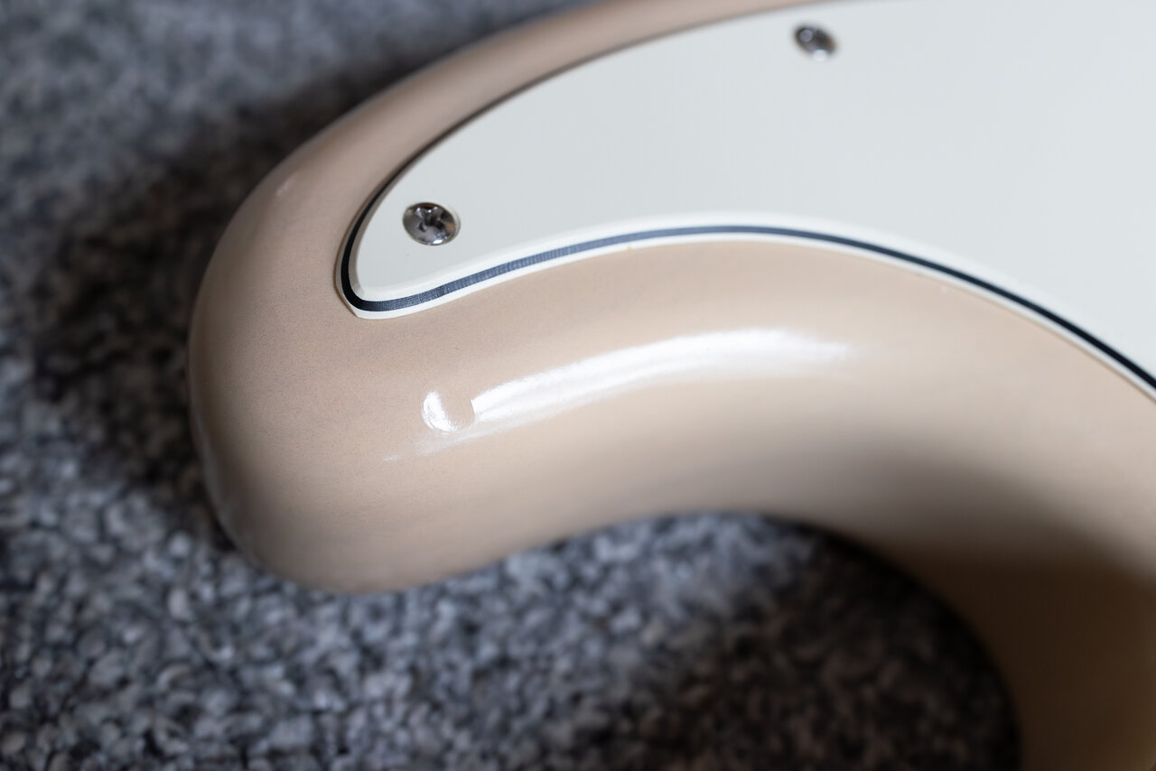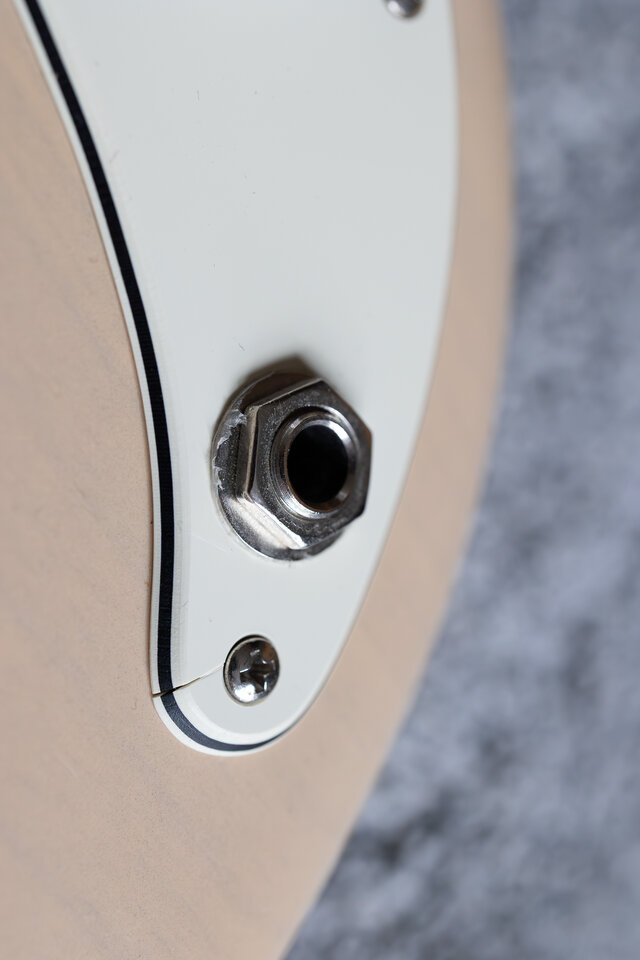 Das Pickguard hat einen Riss an der Schraube im Bereich der Klinkenbuchse. Das war schon ab Werk so und mir wurde ein orignales Ersatzpickguard zugeschickt, welches ich aber nie verbaut habe. Das Ersatzpickguard ist aber natürlich dabei.
