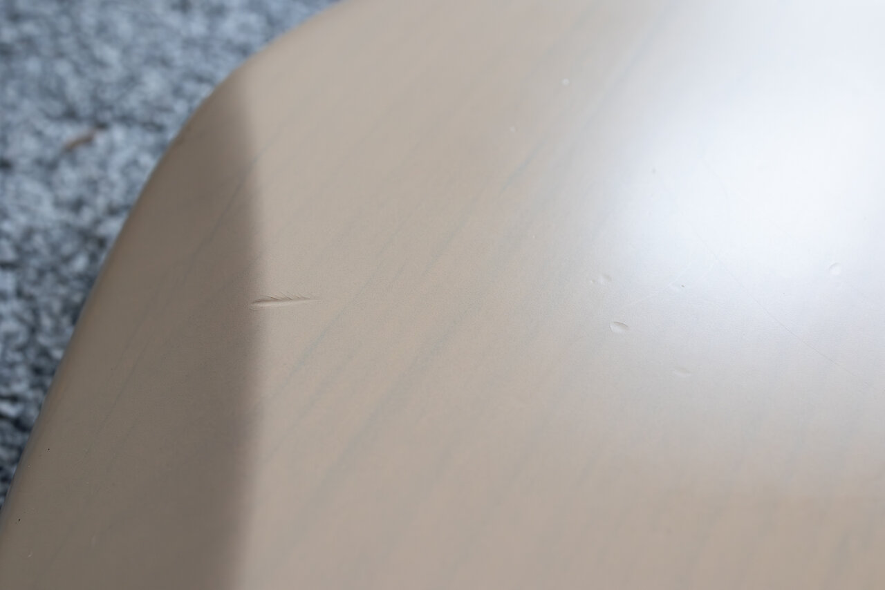 Ein paar Dings und Dongs sind vorhanden, vor allem auf der Rückseite im Bereich der Gürtelschnalle - Erle und dünner Nitrolack eignen sich einfach optimal für Relic Optik. Auf den Fotos sieht man gut die beiden größten Dellen. Eine ist am unteren Horn und eine am Übergang von der "Bauchaussparung" zur glatten Rückseite. Das Ganze wirkt auf den Detailfotos aber deutlich krasser, als es in Wirklichkeit ist! Der Hals ist mackenfrei.