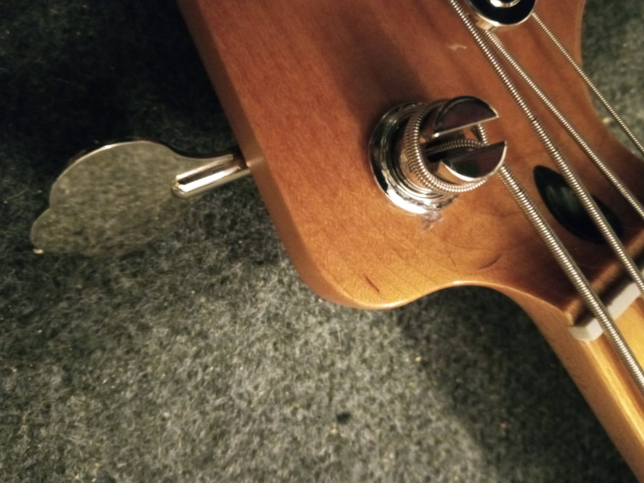 Leider hat er einen kleinen Lackplatzer/minimalen Riss neben der E-Mechanik, da habe ich beim Einpressen der Hülsen für die Mechaniken nicht aufgepasst. Ist aber lediglich ein Schönheitsfehler und tut der Stabilität keinen Abbruch. Montiert sind Schaller BMFL Mechaniken.