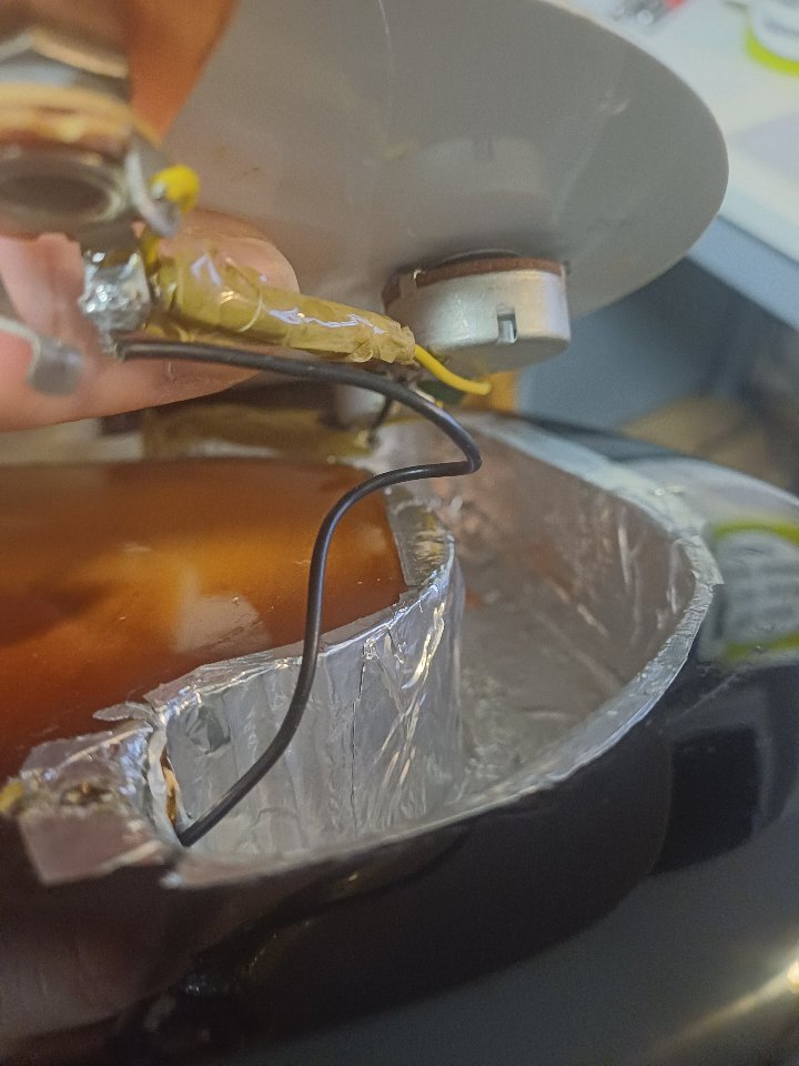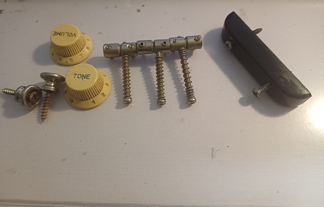 Neue Saitenreiter aus Messing, da einer der orginalen fehlte (siehe Foto der Einzelteile), Schaller kompatibele Gurtpins, komplettes E-Fach durch Aluklebeband ausgekleidet, was die Nebengeräusche schon mächtig eindämmt (etwas was bei der Serie leider typisch war), ein "Klingen" Shim in der Halstasche, damit die Saitenlage besser einstellbar war, Reinigung der Elektronik (läuft jetzt ohne Nebengeräusche), Original Potiknöpfe durch Chormknöpfe ersetzt.