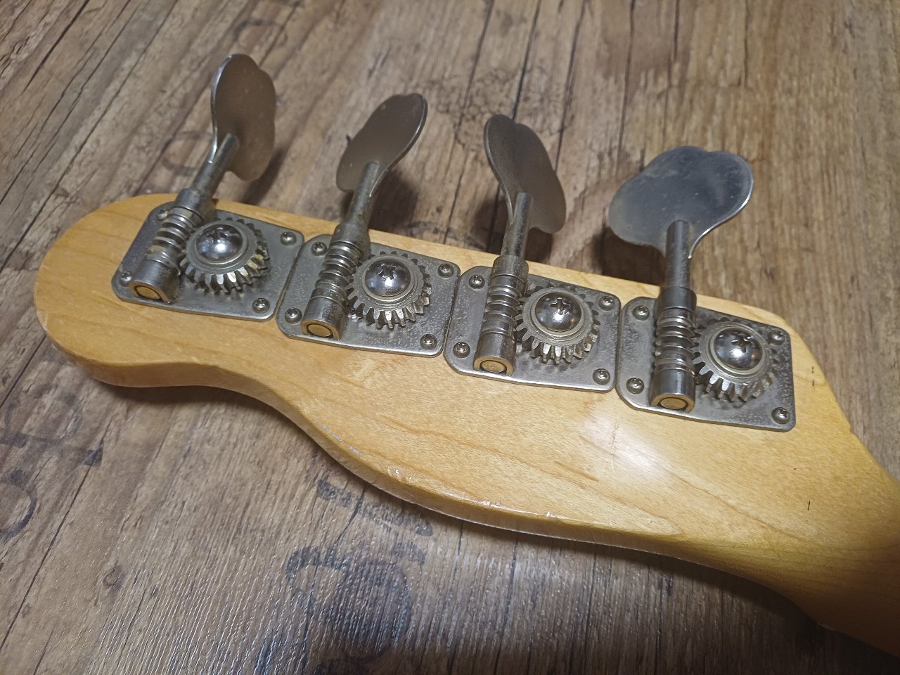 Der Bass sieht wie eine Mischung aus Precision Bass, Ur-Peci (Telecaster Bass), Mustang Bass, mit etwas schrägen Charme aus.