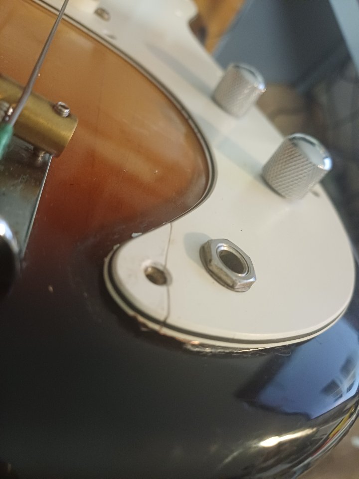 Mankos: Lackabplatzer unter dem Pickguard und an der Zarge (fotos), 2 der Mechaniken habe (leicht) verbogene Flügel, aber funktionieren ohne klappern etc., Das gebrochene Pickguard wurde geklebt und zusätzlich von unten mit Kupferband verstärkt.