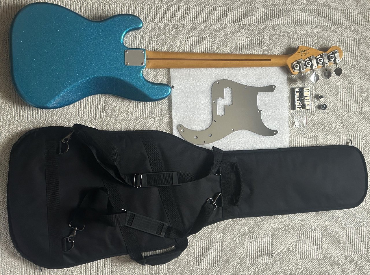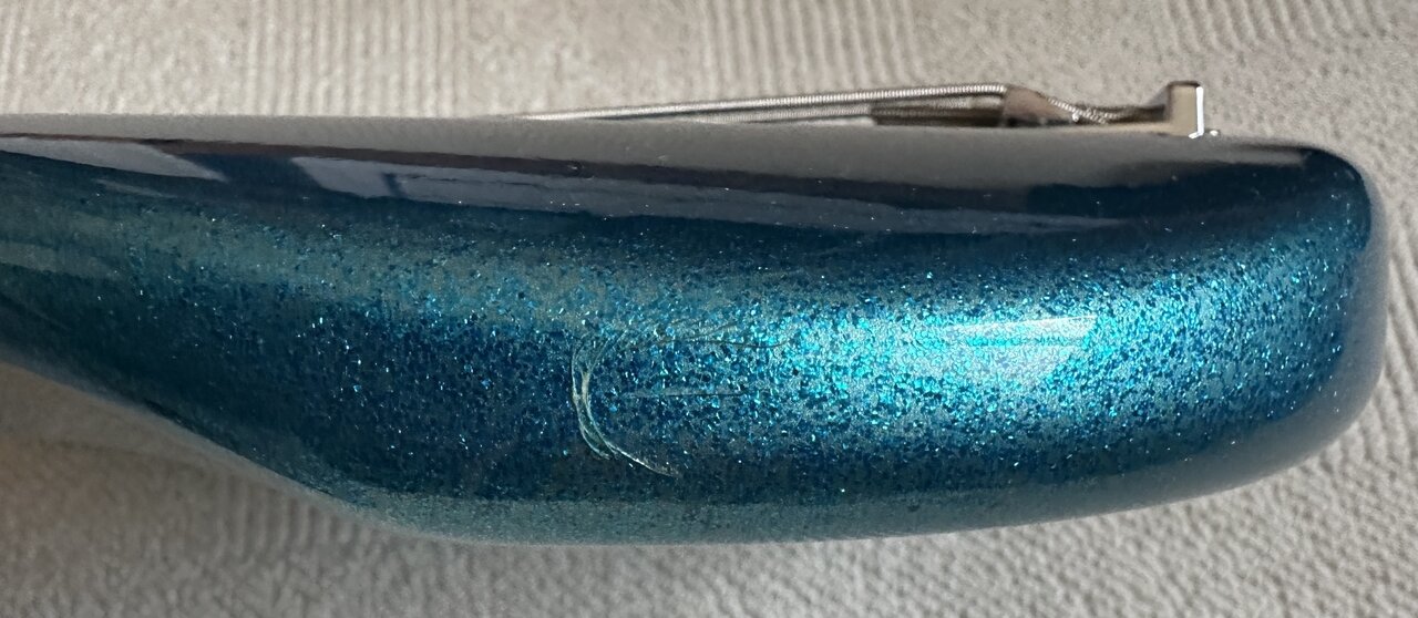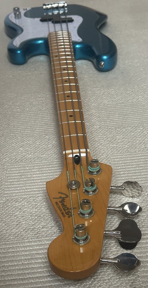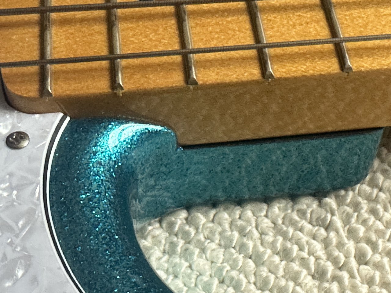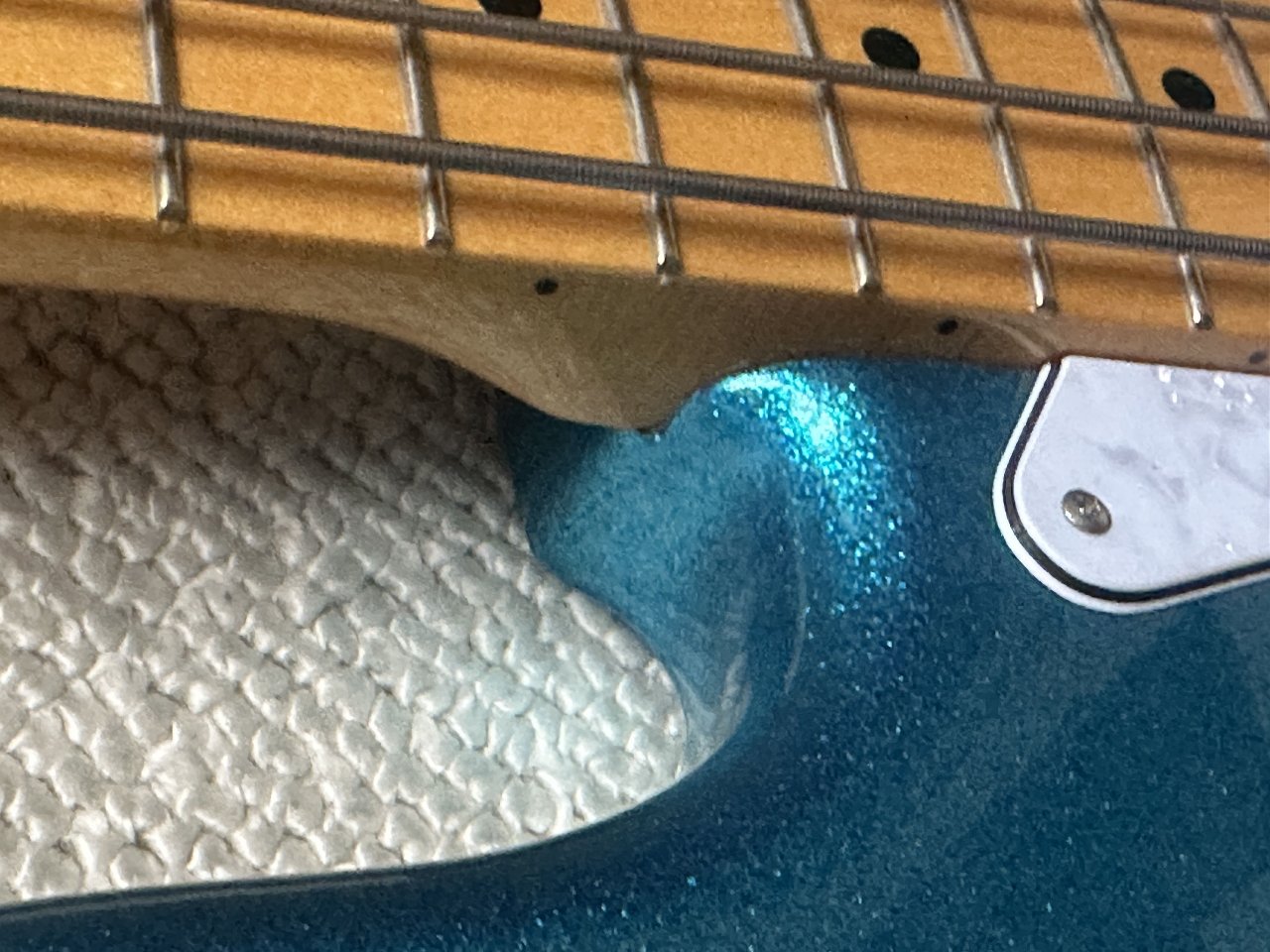 Er hat einen kleinen Lackschaden (nur im Klarlack) an der oberen Korpusseite (siehe Foto) ansonsten hat er keinerlei Spielspuren. Seitdem ich die Entscheidung zum Verkauf getroffen hatte, habe ich ihn auch nicht weiter verwendet, es sind daher neue, fast ungespielte Fender 9050ML Stainless Steel Flatwound Saiten (50 - 65 - 85 – 100) drauf.