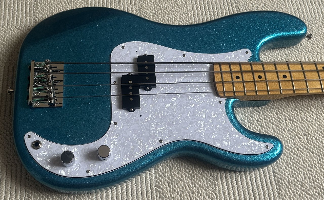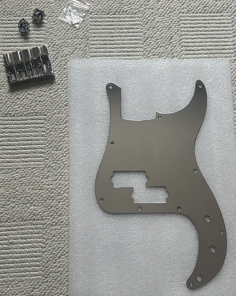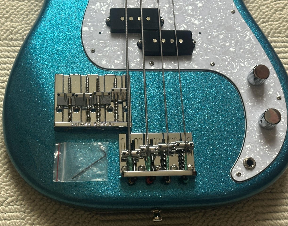 Statt dem verchromtem Spiegel-Pickguard hat er ein passendes white pearl Pickguard (10 Loch), die große Badass II Bridge wurde gegen eine halbmassive Brücke mit geriffelten Fender Deluxe Saitenreitern ausgetauscht – neben dem optischen gibt es noch einen weiteren Vorteil: mit diesen Änderungen wiegt er jetzt nur 4,1 kg.