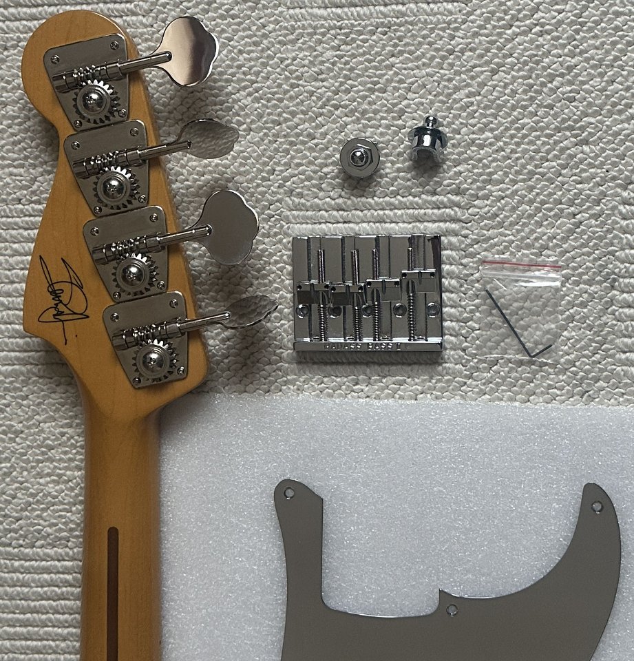 Als Komplettpaket sind die abgebauten originalen Teile natürlich auch dabei (das Chrome Pickguard und die Badass Bridge II). Auch das originale Deluxe Gig Bag und die Gurtteile für die Schaller Security Locks sind enthalten.