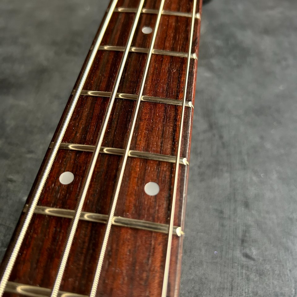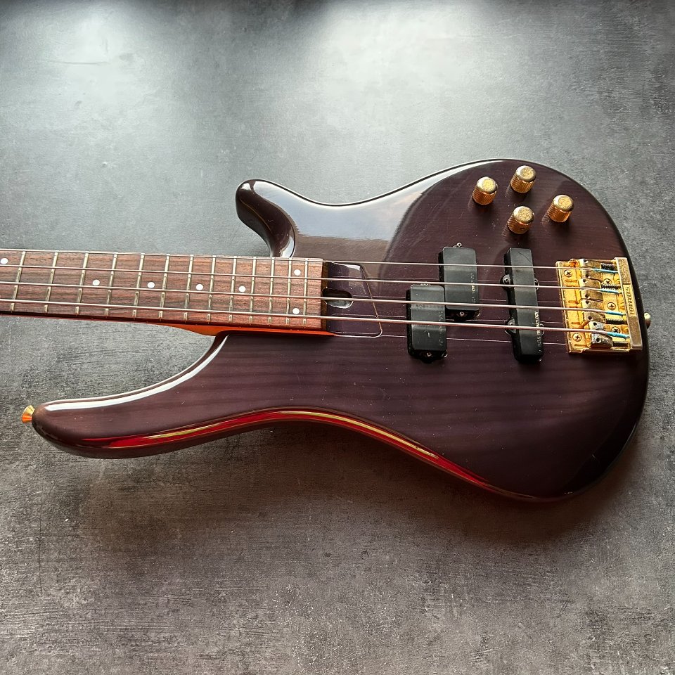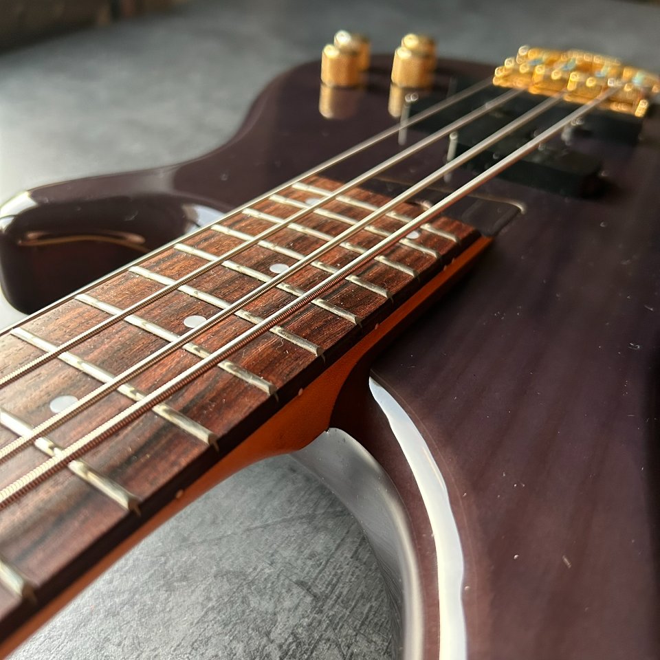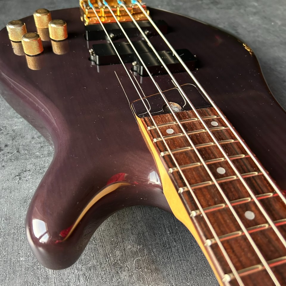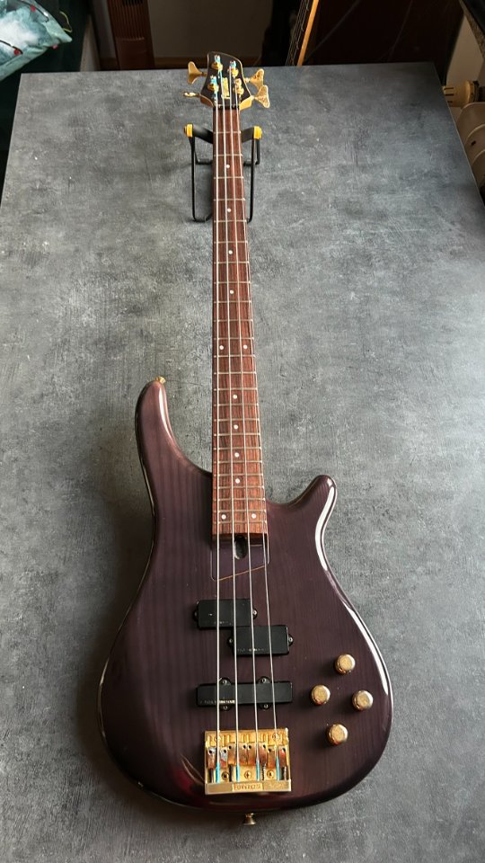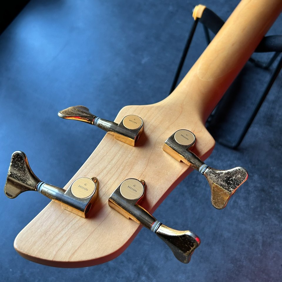 The neck is straight, and the truss rod works well, turning - though with some resistance - in both directions. The bridge has more wear and tear: the E-string nut has lost some of its gold finish, and the thread on one of the adjustment screws has worn out, making it more difficult to adjust. However, the action is very comfortable, 1.8-2.0mm at the 12th fret. No problems with the electronics or the Gotoh tuners. The bass weighs 4.1kg and is perfectly balanced.