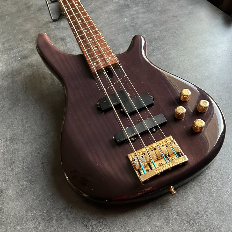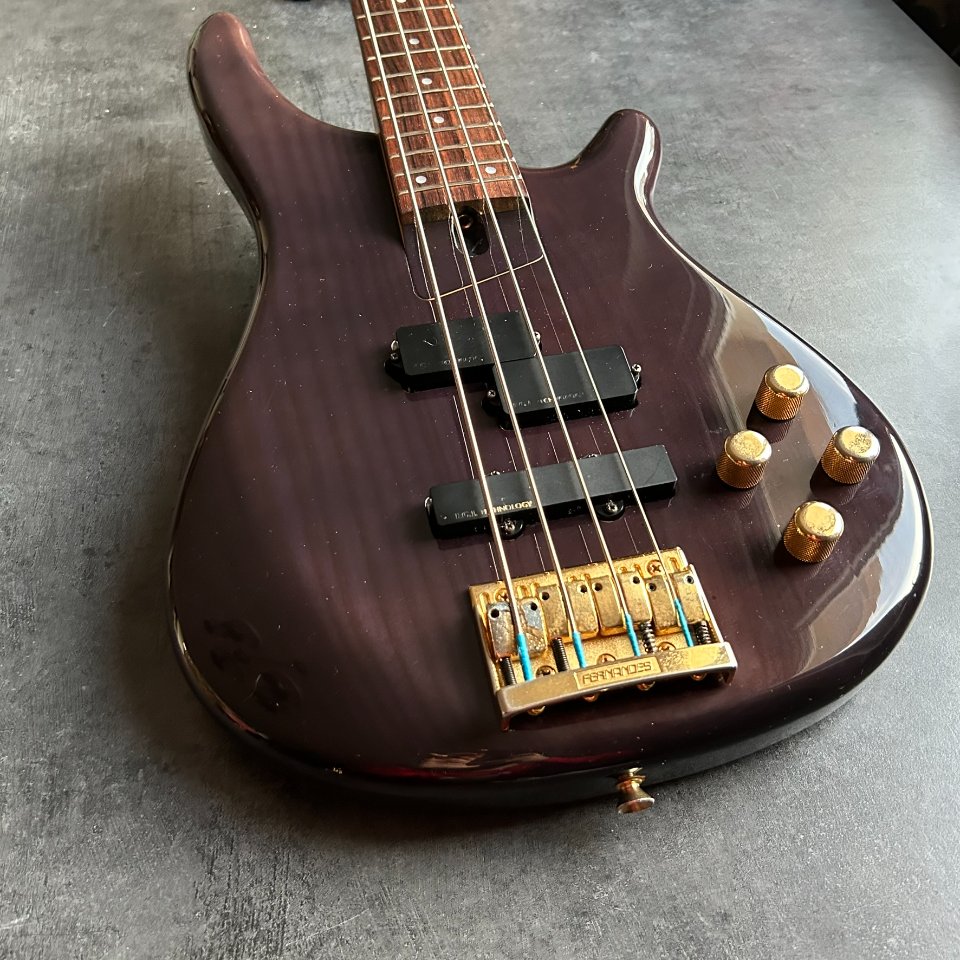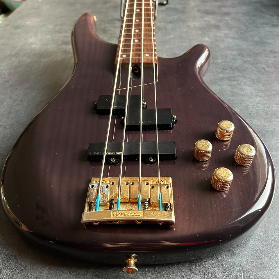For sale is a rare, active Fernandes FRB-90 bass guitar from the early 1990s. This high-end model, made in Japan, dates back to the heyday of this renowned brand. It has a 34-inch scale and a beautiful translucent purple finish.