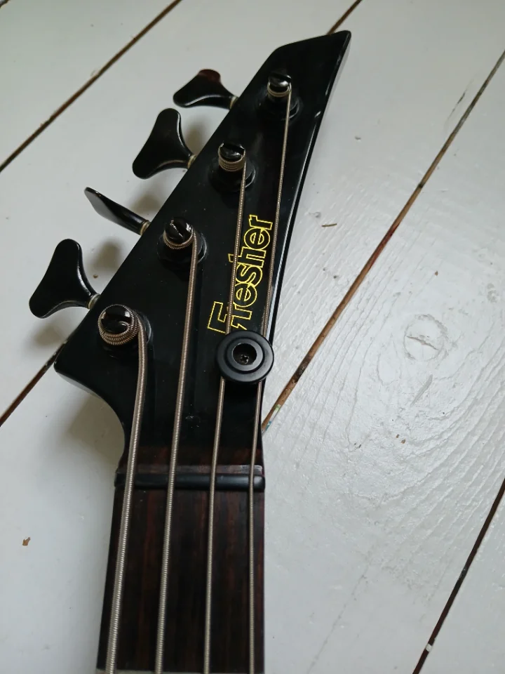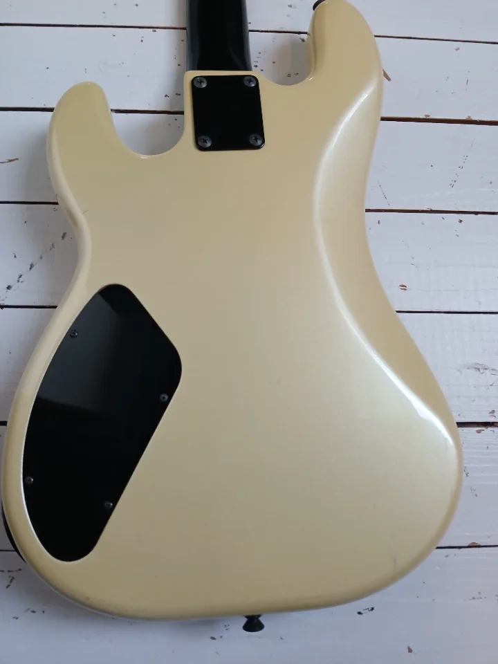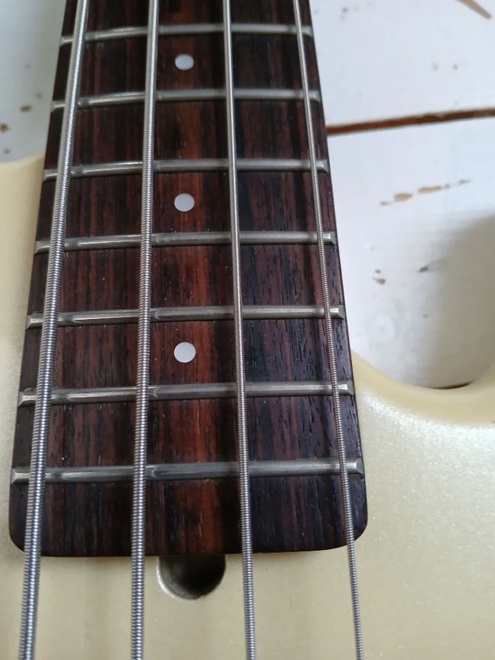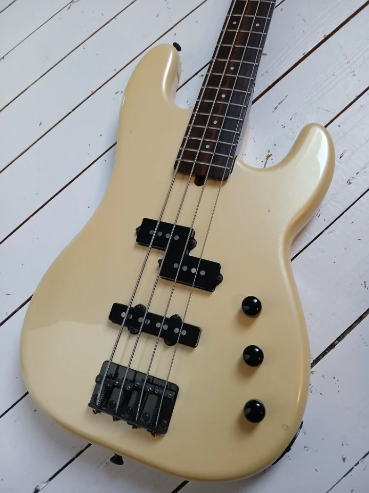 Optisch gelungene Kombination aus Vintage White Perleffekt- Lackierung und schwarzem Hals/Hardware und fast schwarzem Rosewood. Die Keramik-PUs habe ich durch alte Gotohs ersetzt bzw. Alnicos. Der Bass ist ca. 7/8 so groß wie ein üblicher P-Bass. Korpus Erle. Der Klang ist wirklich gut, kräftig, macht Spaß!