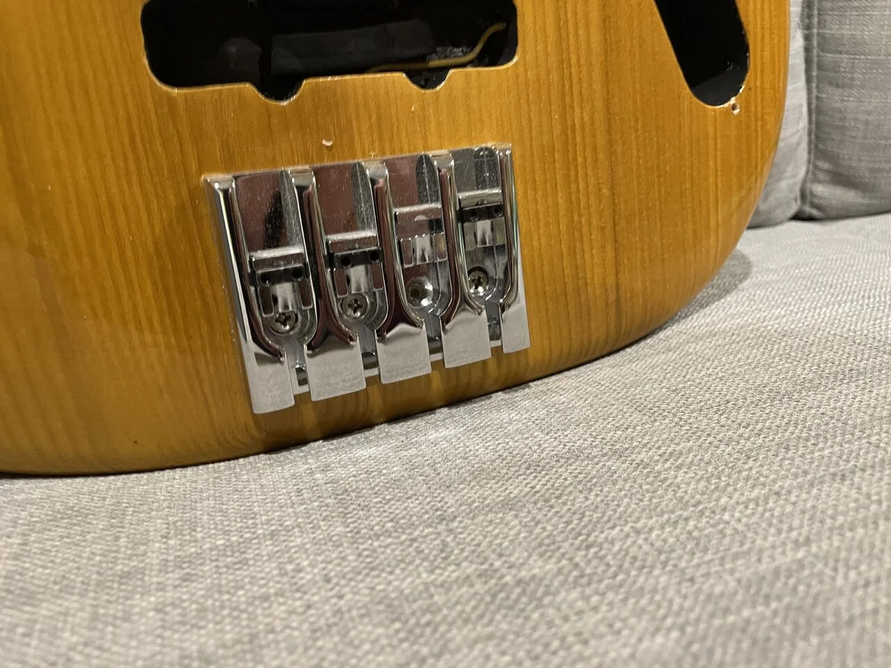 Auf dem letzten Foto kann man den Bass in fertig sehen, so wie ich ihn hatte. Da sieht man auch sehr deutlich die tolle Maserung der Esche.