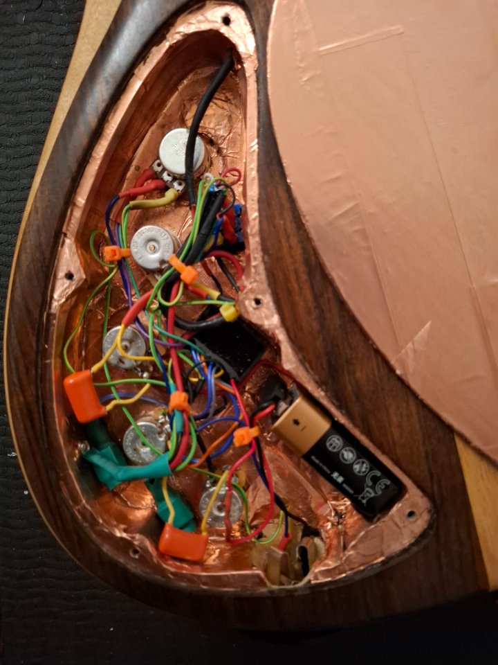 The Gregory pre-amp this came with had some issues, so this was replaced with a Bartolini AGDB/918-2 Dual Channel Adjustable Gain Buffer wired with master volume + V/T for each pickup + three way switch for the bridge pickup (coils in parallel/single coil/series).