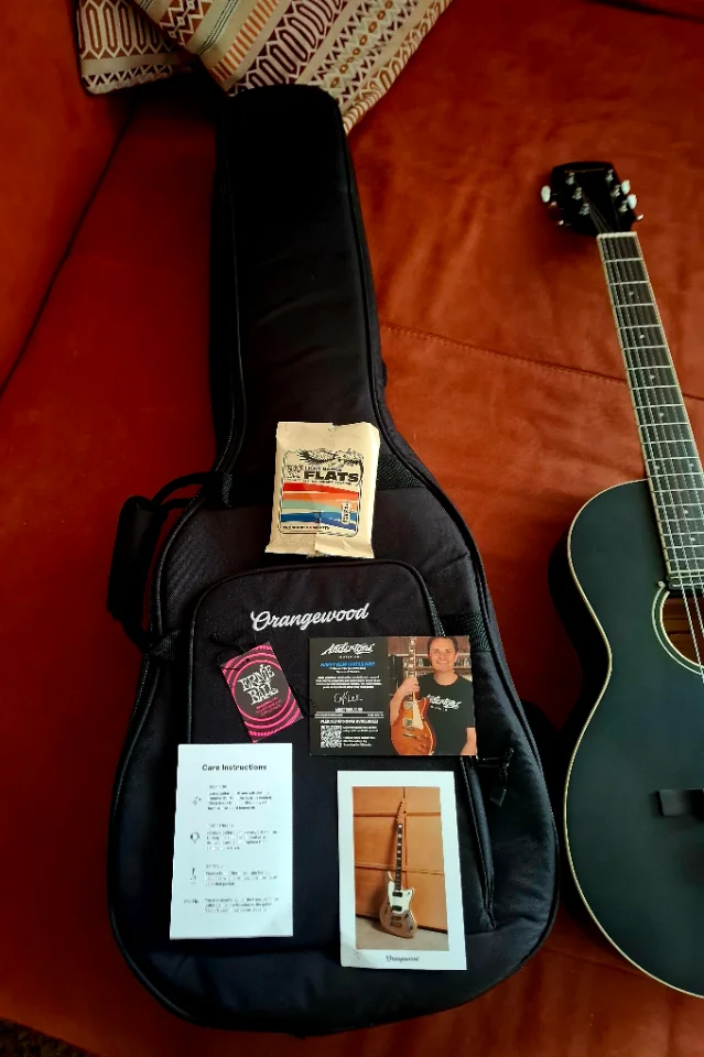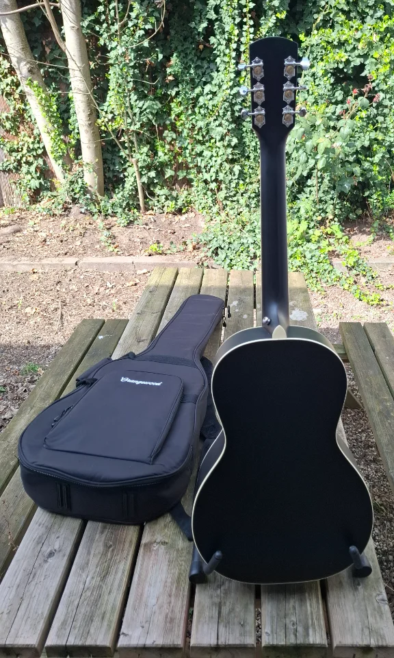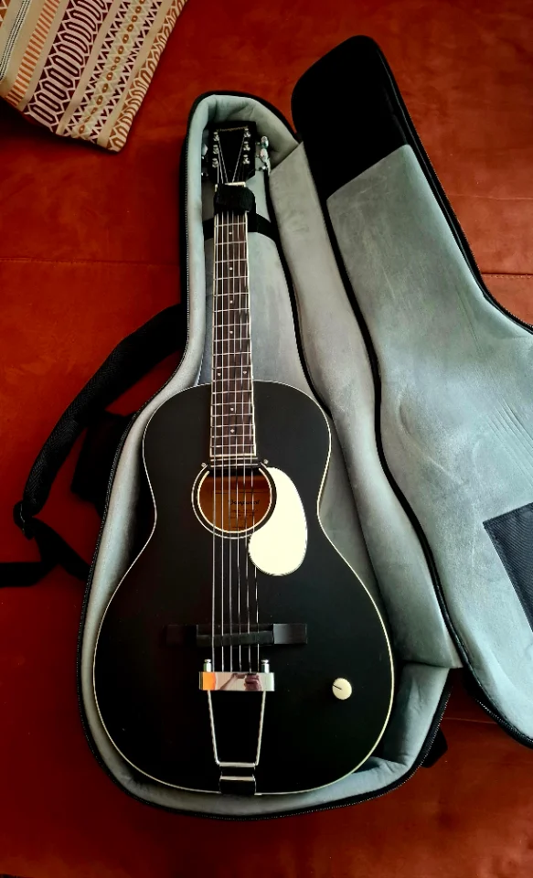 The Orangewood Juniper is a parlor-shaped guitar with a rubber bridge, flatwound strings, and a Hot Rail pickup.