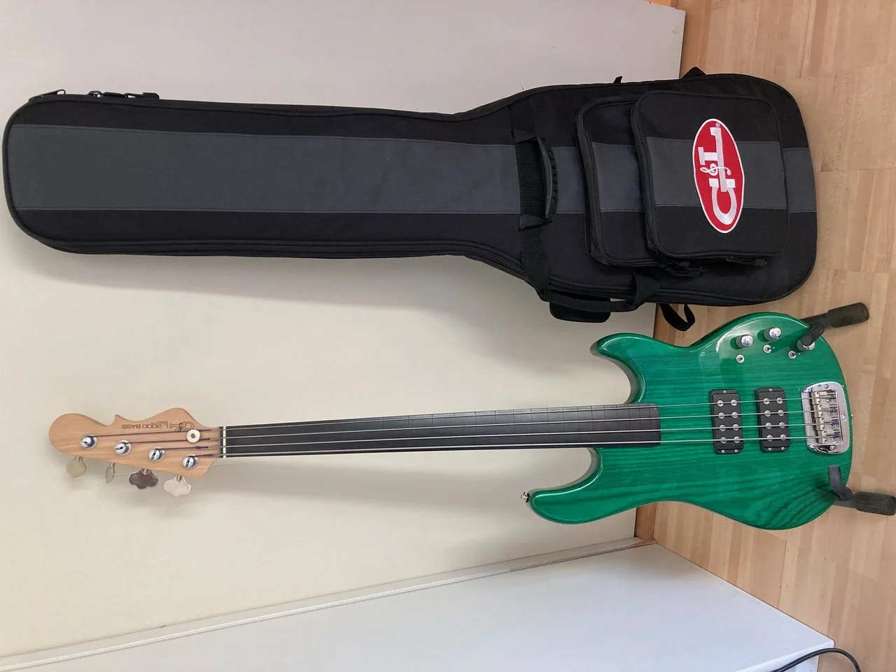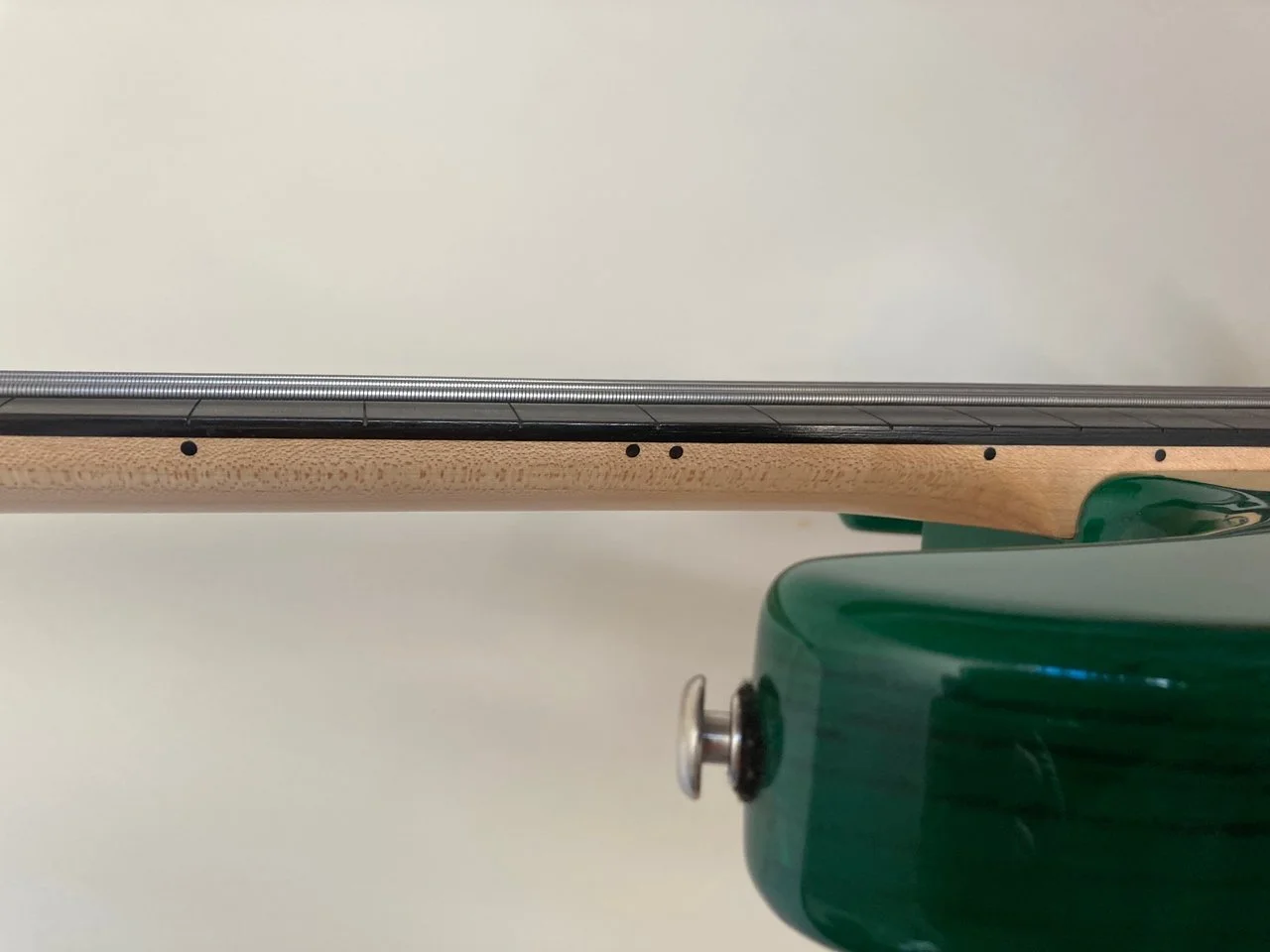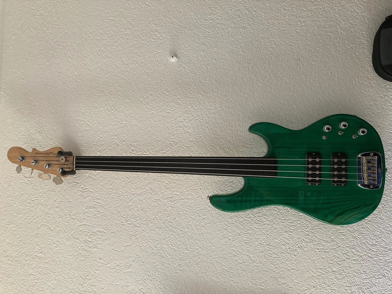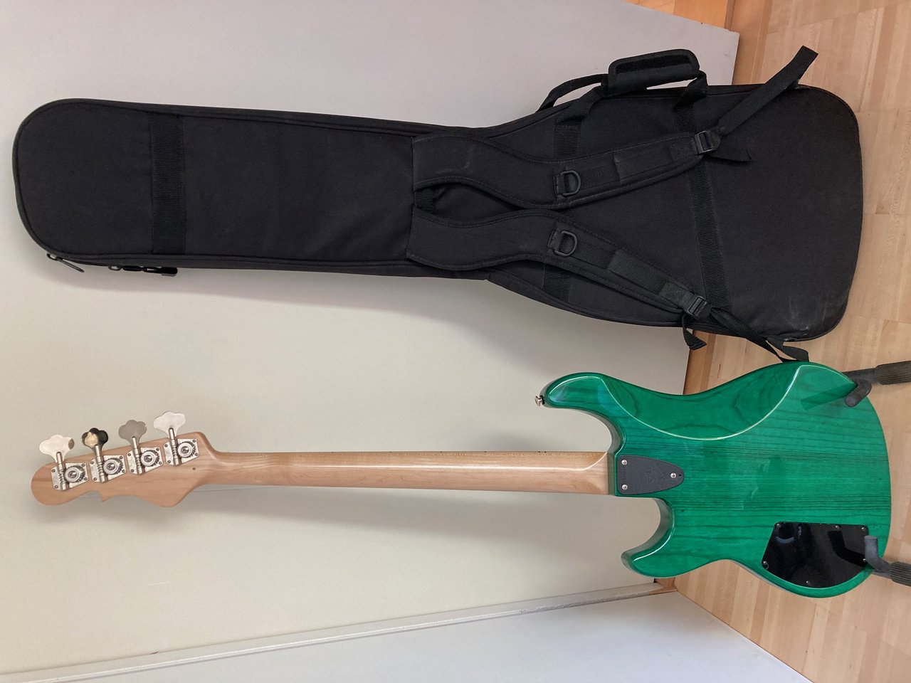 Dieser Bass besteht aus einem 2-teiligen Sumpferlebody, Ahornhals und Ebenholzgriffbrett. Fretless = ohne Bünde. Farbe: leuchtend grün transparent lackiert.