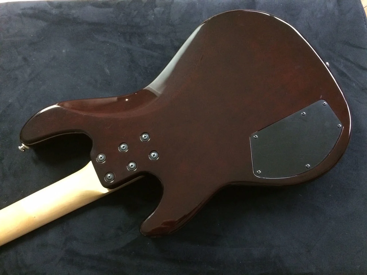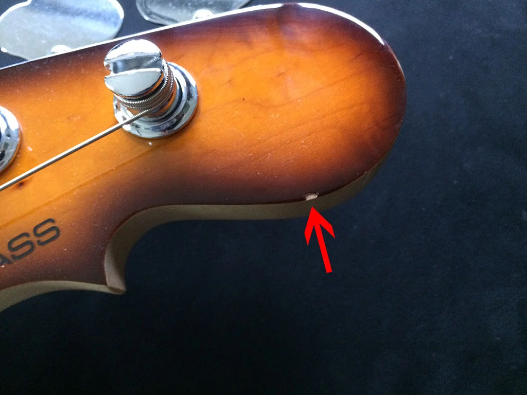 Der Bass ist in sehr gutem Zustand. Eine winzige Macke am Headstock, siehe Foto und ein paar Schlieren vom Slappen. Auf der Rückseite keine Kratzer vom Gürtel oder so….