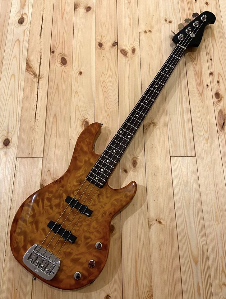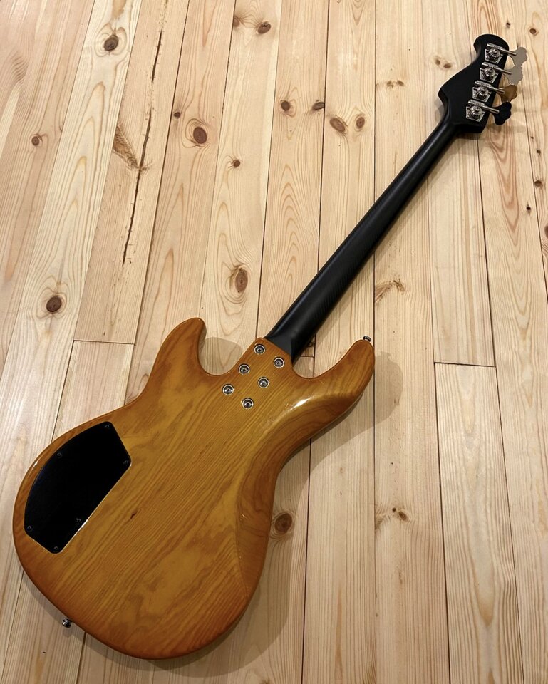 Es handelt sich um einen G&L JazzBass aus US-Fertigung. Da der Halsstab allerdings irgendwie nicht richtig funktioniert hatte, wurde er von Stefan Heß von Bogart kurzerhand gegen einen extra angefertigten Carbonhals getauscht. Dieser Carbonhals ist eher fett als dürr und man hat was in der Hand, eine spürbare Tendenz zum Preci-Hals. Trotzdem supergut zu bespielen und sehr komfortabel. Die Bespielbarkeit ist halt so, wie man sie von so einem Bass auch erwartet.