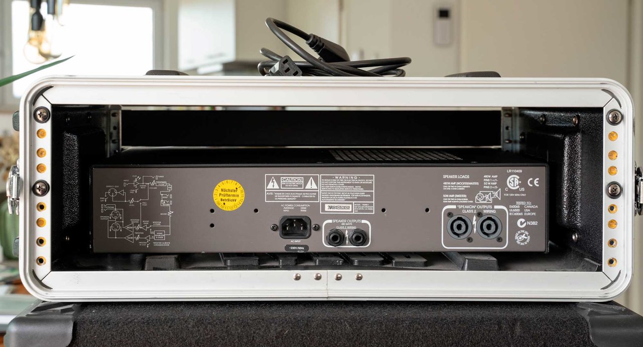 • Ausgänge: D.I.-Ausgang (XLR); Effect send (6,3 mm Klinke); Tuner-Ausgang (6,3 mm Klinke); 2x Lautsprecherausgang (6,3 mm Klinke); 2x Lautsprecherausgang (Speakon)