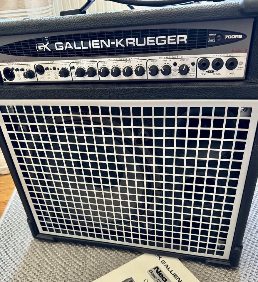 Ich biete hier meinen GK Combo an. Dieser ist eine Kombination aus dem beliebten GK 700 RB II und einer Neo 112 Box. Der Würfel stand jahrelang im beheizten, trockenen Proberaum und ist daher in einem sehr guten Zustand. Das Gewicht beträgt circa 25Kg. Der Lüfter ist nicht zu hören. Für die volle Leistung an 4 Ohm lässt sich eine zusätzliche 8 Ohm Box anschließen. Anbieten würde sich z.B. eine weitere GK Neo 112. Das habe ich nie genutzt, da das Teil GK typisch alleine schon gut Alarm macht.
