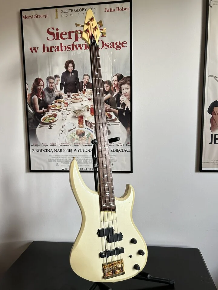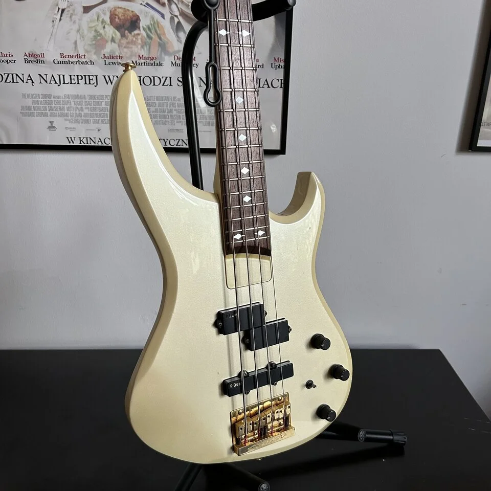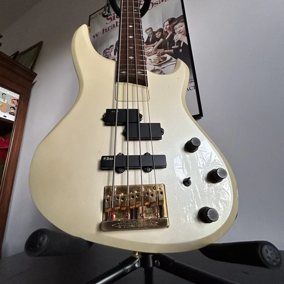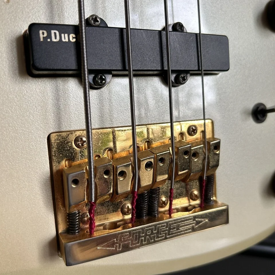 The sound is also interesting - although it looks passive, it is active bass. The battery powers a magic flick that cuts or boosts the midrange completely changing the character of the sound. The Pro-Duce pickups have a similar spec to the EMG, the ax sounds great in slap. The hardware is also cool - Gotoh keys and a proprietary Bob-Force bridge. The latter is impressive - a heavy piece of brass on 6 screws with a very clever patent that allows you to change strings without threading. A few seconds and the strings are on, brilliant.