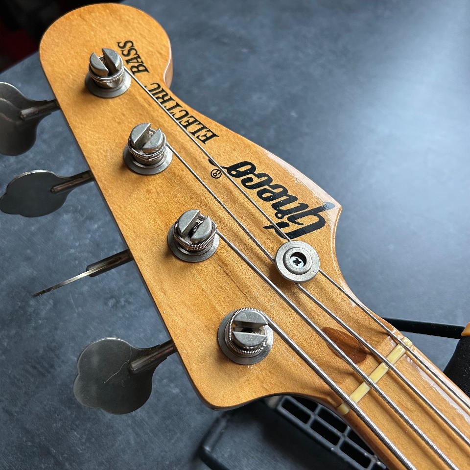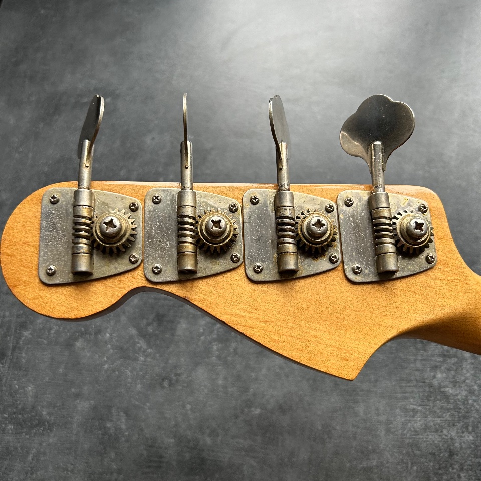 For a 50-year-old bass, it's in very good condition – aside from three dents on the back of the body, there's virtually no damage. The frets are quite low, but they would last for another sanding (unnecessary for now – they're in good condition). The guitar recently underwent a luthier overhaul, including electronic maintenance and neck angle adjustments. A small veneer was added to improve the setup. The current string action is 2mm above the 12th fret.