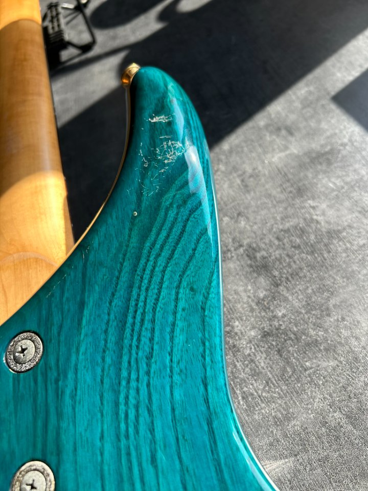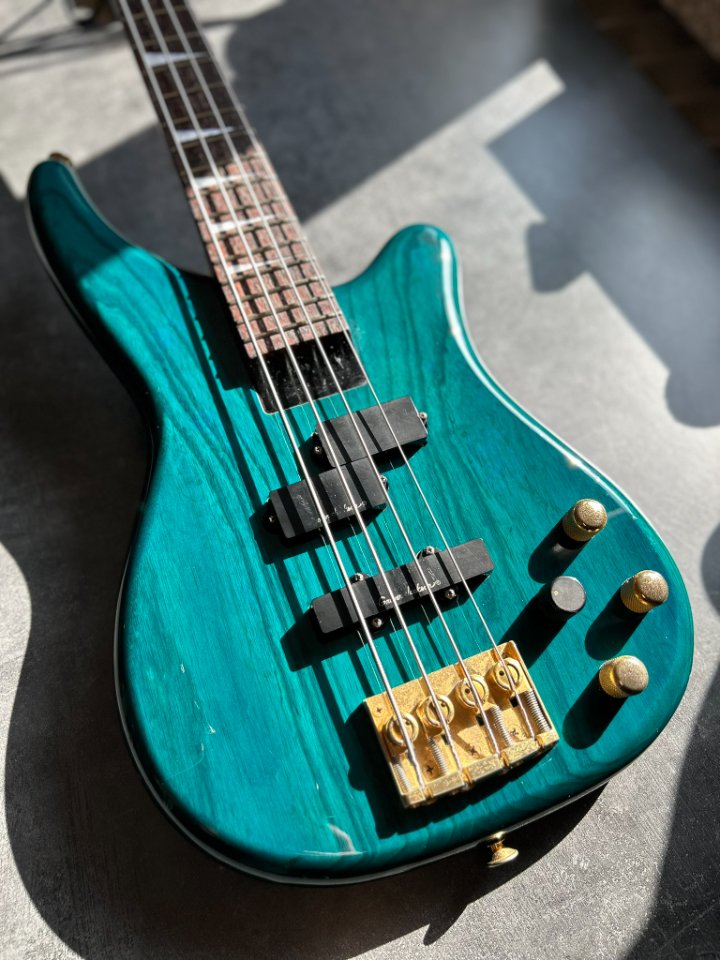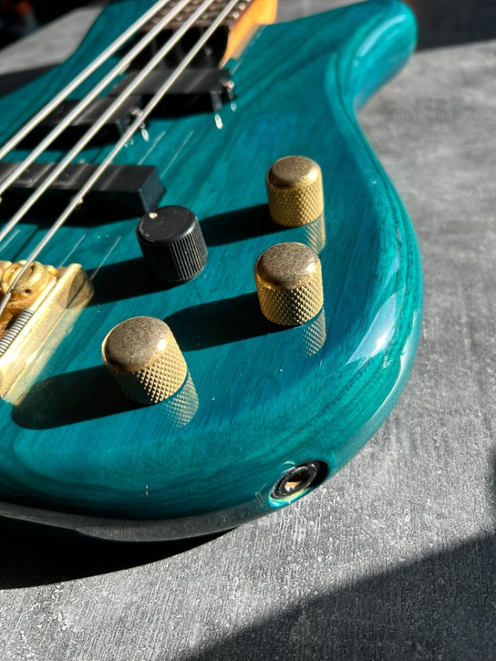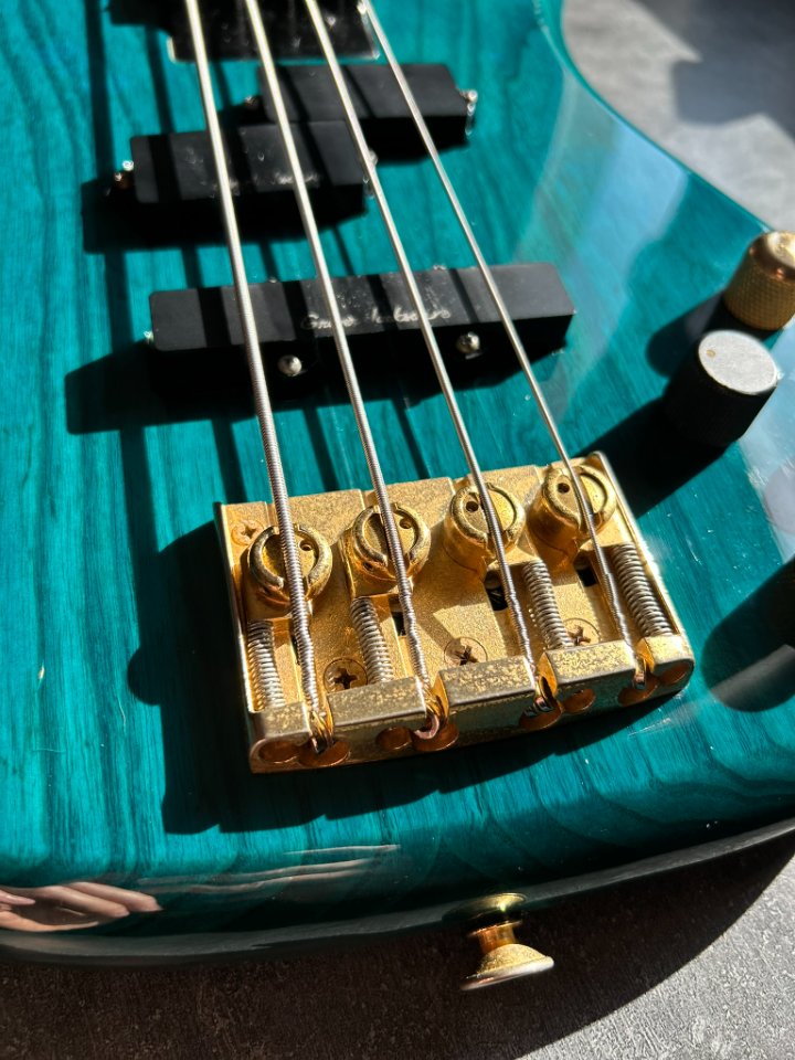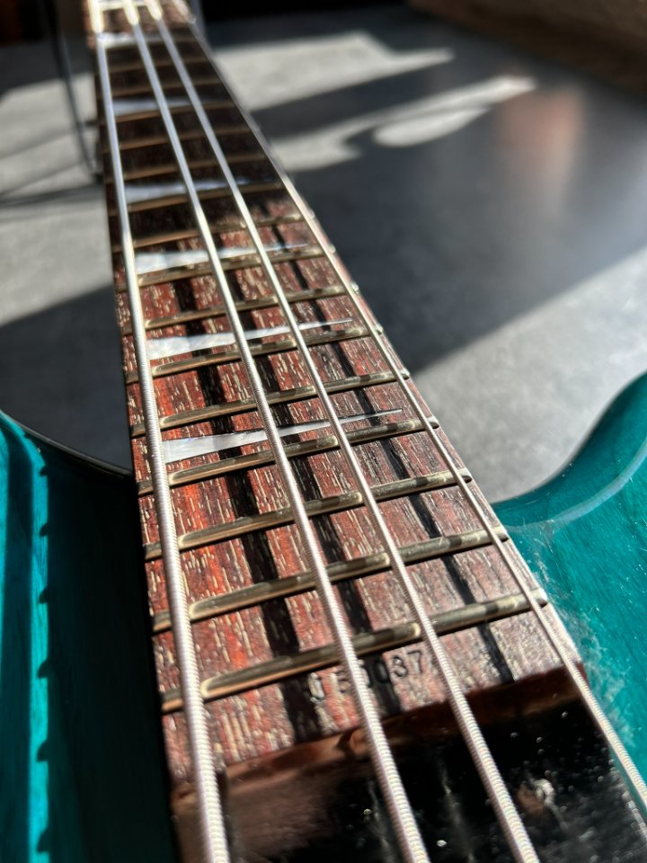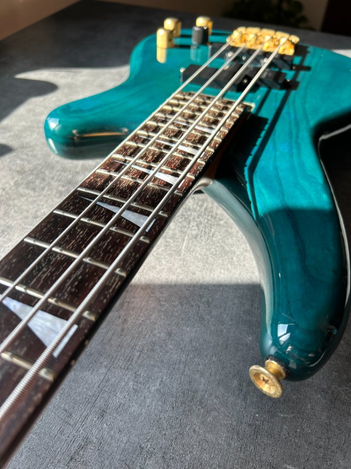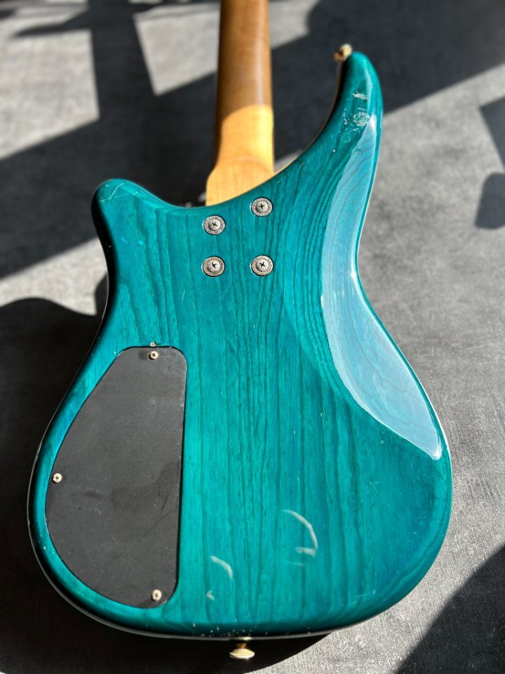 Der Bass ist auf einem zweiteiligen Eschenholz-Korpus aufgebaut. Der Blue Teal-Lack ist halbtransparent, sodass die wunderschönen Maserungen gut zu sehen sind. Der Hals ist aus Ahorn mit einem Palisandergriffbrett (24 Bünde) und dem für Jackson typischen dünnen „D”-Profil. Das Gesamtgewicht beträgt weniger als 4 kg. Bequem für Proben und Auftritte – es ist offensichtlich, dass dies eine Gitarre für wilde Bühnenauftritte ist.