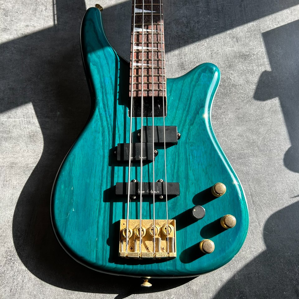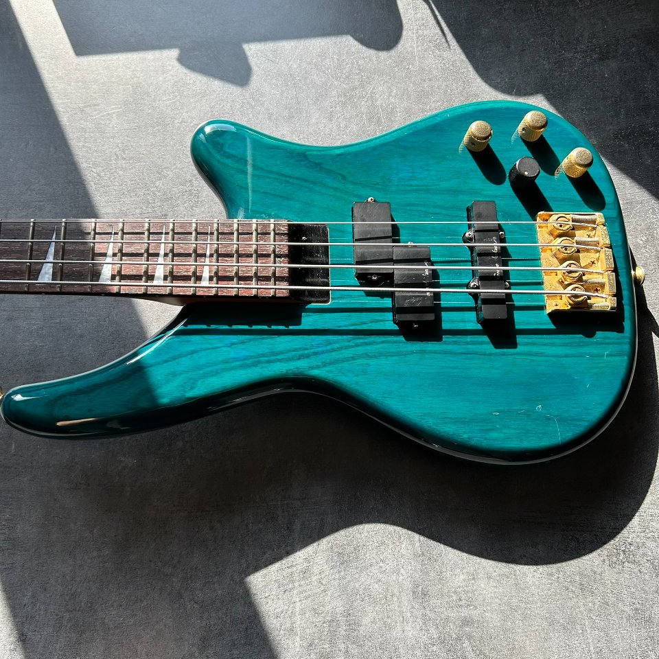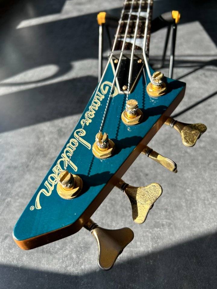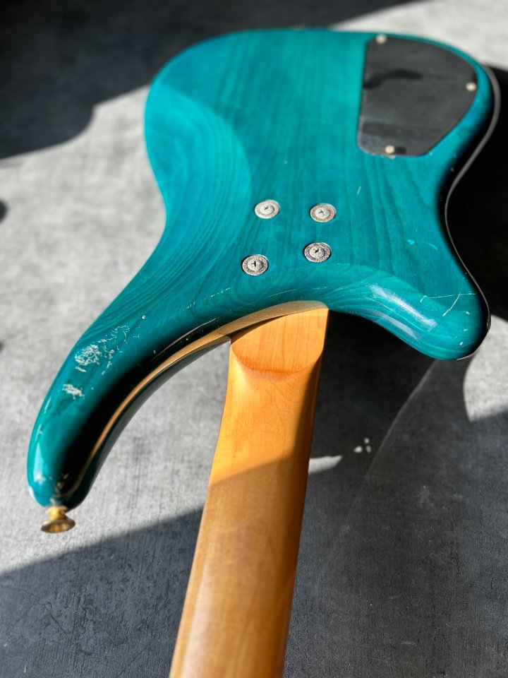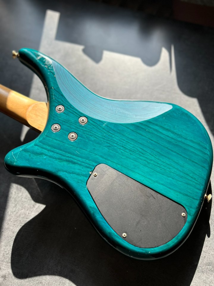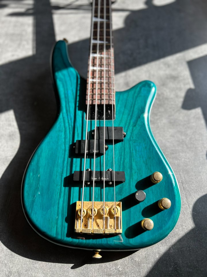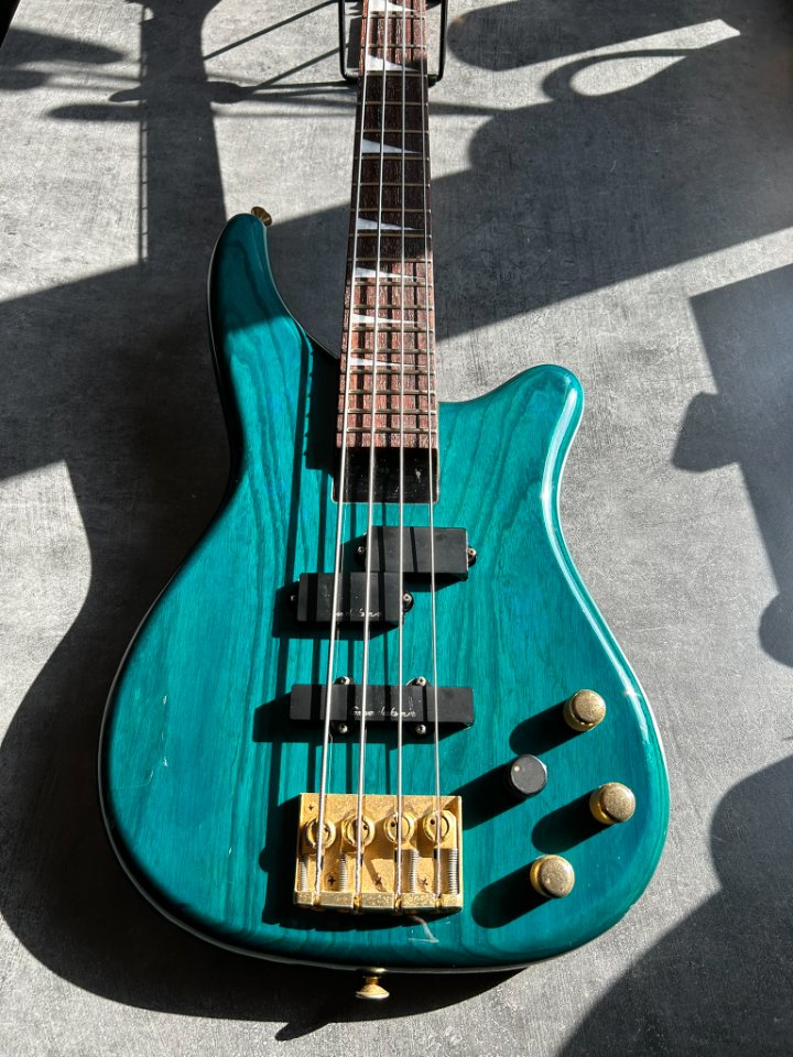 Der Bass ist auf einem zweiteiligen Eschenholz-Korpus aufgebaut. Der Blue Teal-Lack ist halbtransparent, sodass die wunderschönen Maserungen gut zu sehen sind. Der Hals ist aus Ahorn mit einem Palisandergriffbrett (24 Bünde) und dem für Jackson typischen dünnen „D”-Profil. Das Gesamtgewicht beträgt weniger als 4 kg. Bequem für Proben und Auftritte – es ist offensichtlich, dass dies eine Gitarre für wilde Bühnenauftritte ist.