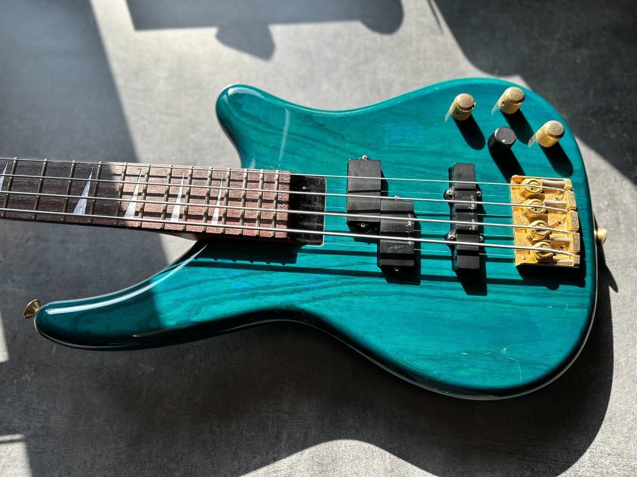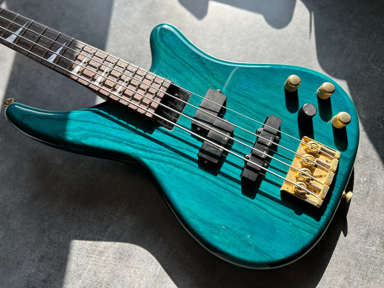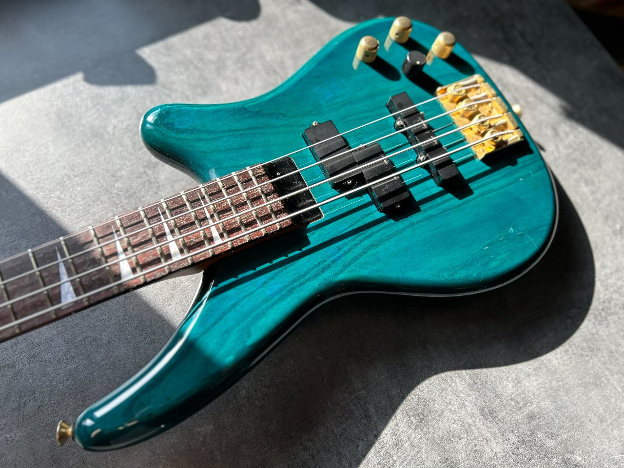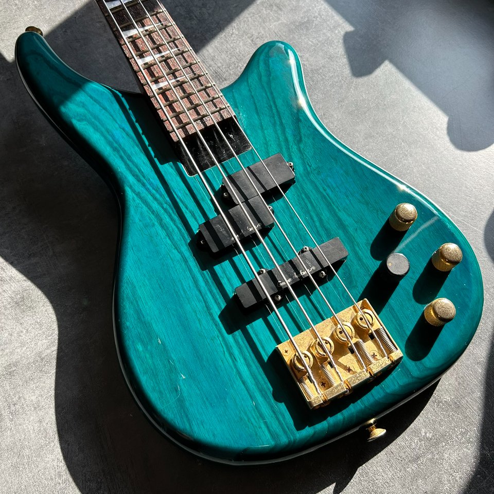 Der Bass ist auf einem zweiteiligen Eschenholz-Korpus aufgebaut. Der Blue Teal-Lack ist halbtransparent, sodass die wunderschönen Maserungen gut zu sehen sind. Der Hals ist aus Ahorn mit einem Palisandergriffbrett (24 Bünde) und dem für Jackson typischen dünnen „D”-Profil. Das Gesamtgewicht beträgt weniger als 4 kg. Bequem für Proben und Auftritte – es ist offensichtlich, dass dies eine Gitarre für wilde Bühnenauftritte ist.