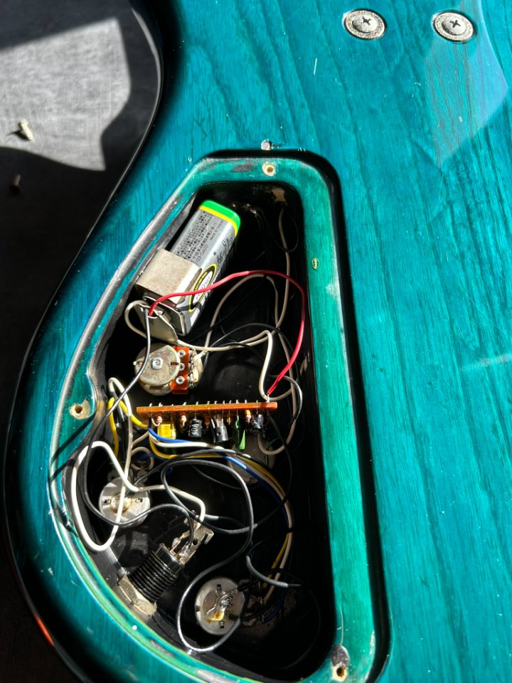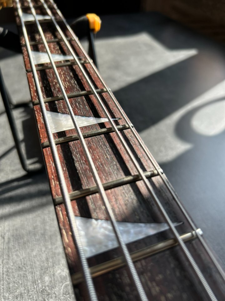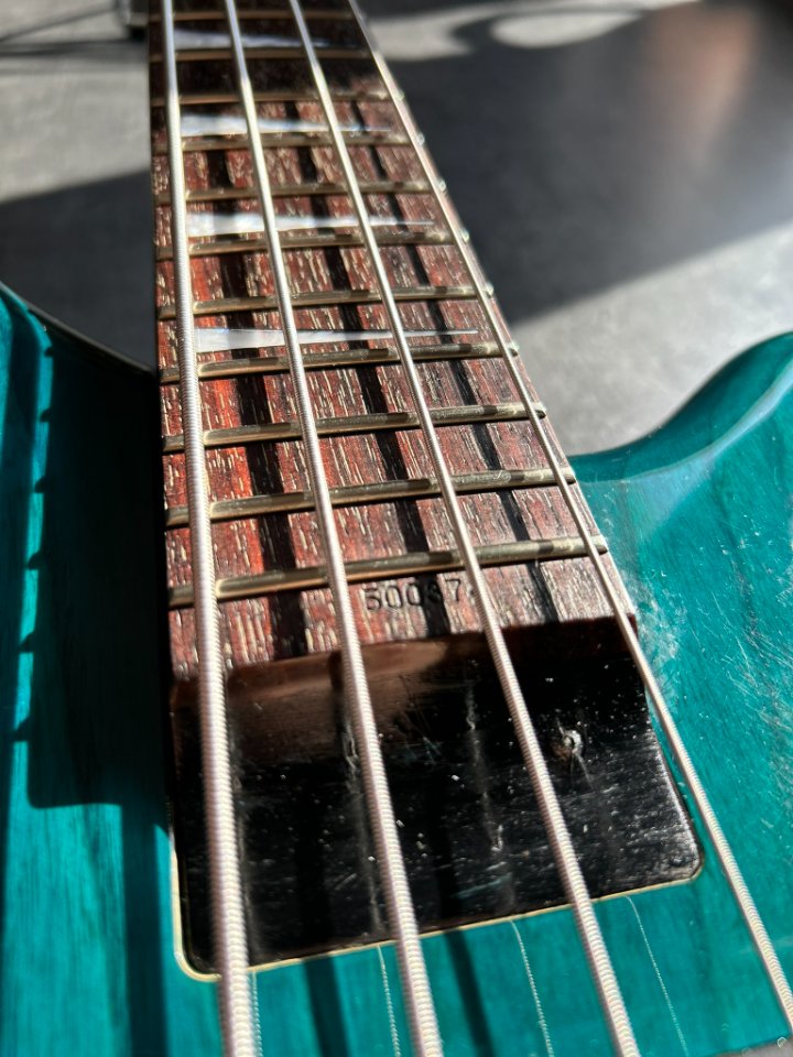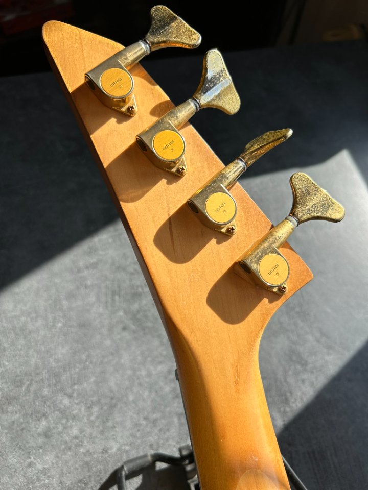 Die Hardware ist bewährtes Gotoh (Steg und Mechaniken) – alles hält die Stimmung und funktioniert reibungslos. Die Elektronik ist funktionsfähig. Die Potentiometerknöpfe sind nicht original. Die Bünde bewerte ich mit 7,5/10. Sie weisen Gebrauchsspuren auf, sind aber gleichmäßig und erfordern derzeit keine Reparatur durch einen Gitarrenbauer. Die Saitenlage beträgt ca. 2 mm über dem 12. Bund. Das Instrument lässt sich weich und ohne Schnarren spielen.