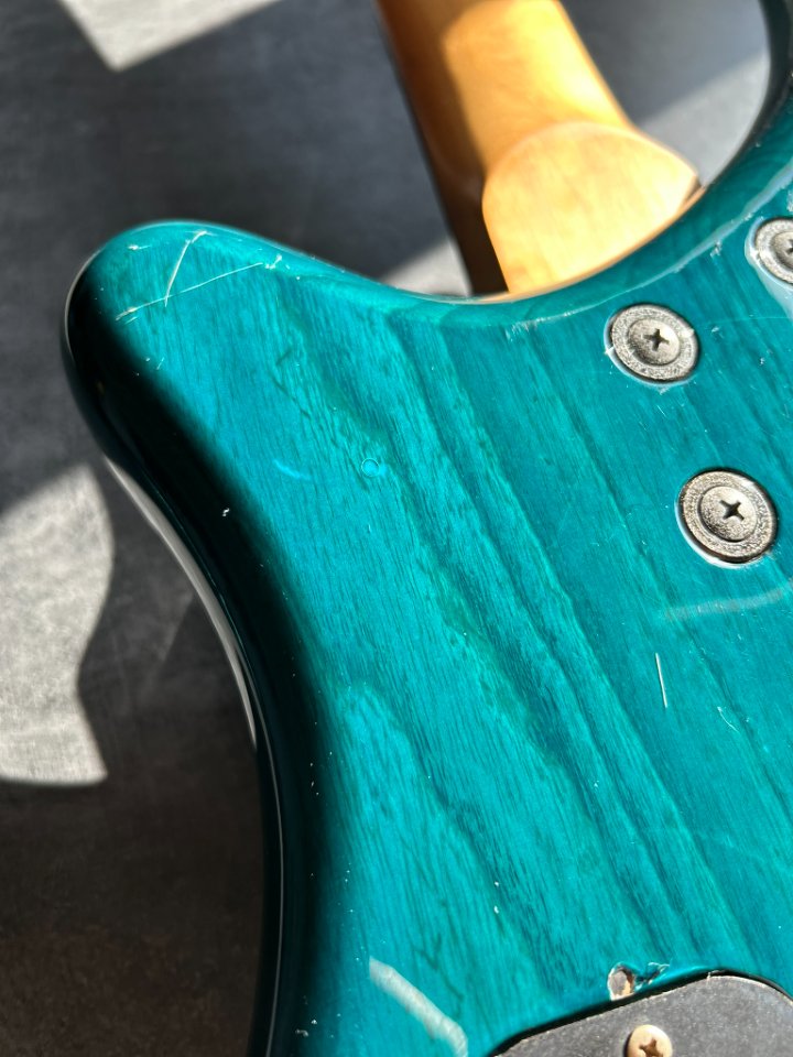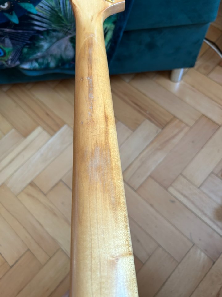 Optisch ist der Zustand gut bis sehr gut. Die Vorderseite sieht neu aus, während sich auf der Rückseite des Korpus zwei Kratzer vom Gurt und einige kleine „Dings” befinden. Der Lack am Hals weist sichtbare Abnutzungsspuren auf, die jedoch mit der Hand nicht zu spüren sind.