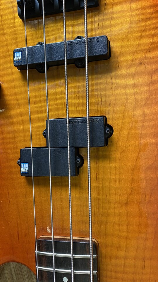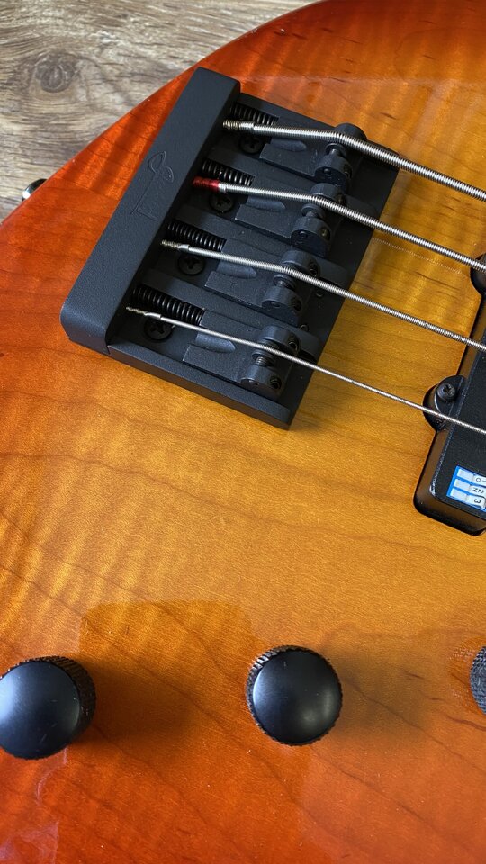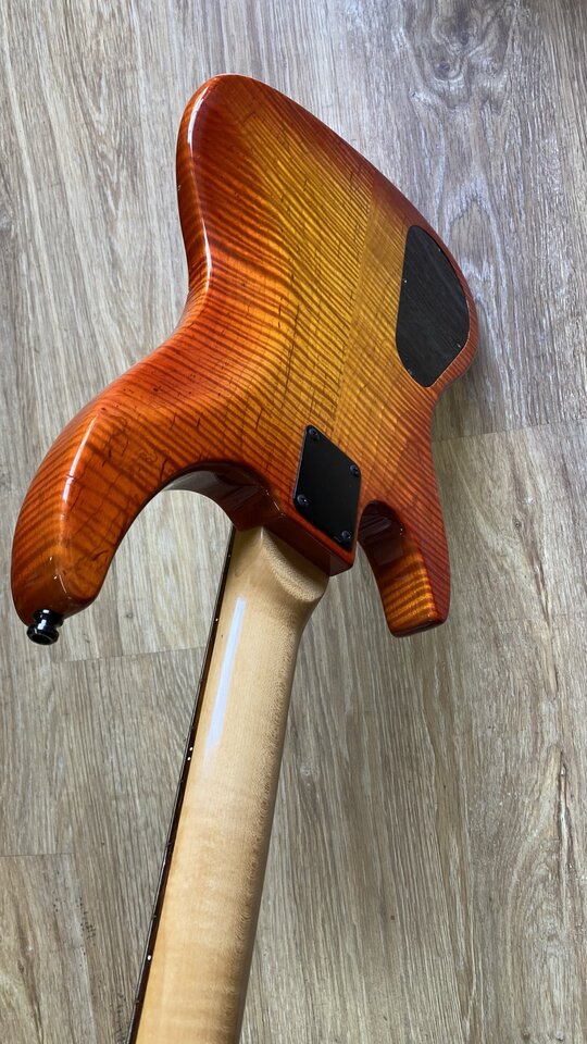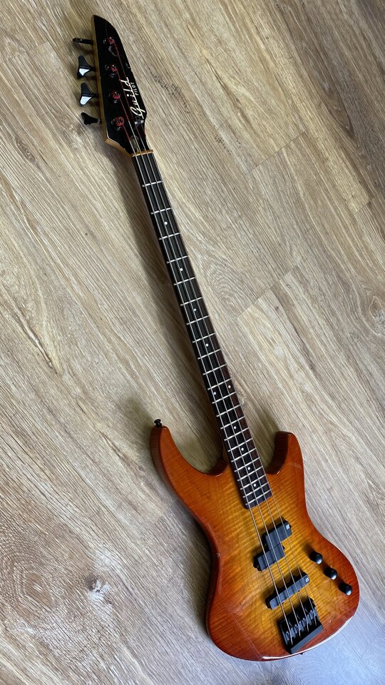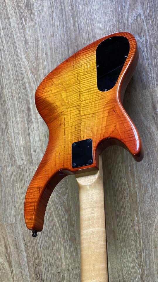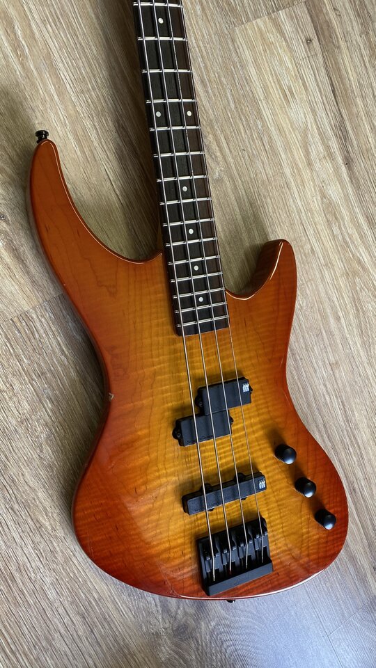 Der body besteht aus zwei massiven Teilen bookmatched AAA tiger-flame maple (heute würde man alleine daraus mehrere Tops bauen!), der Hals aus hardrock-Maple mit JB - Maßen, sowie einem fein gezeichneten Rosewoodgriffbrett. Diese Hölzer sind so exquisit, heute würden Sie in dieser Ausführung und Qualität horrende Mehrpreise verursachen (so denn der Bass bei Guild noch in Produktion wäre).