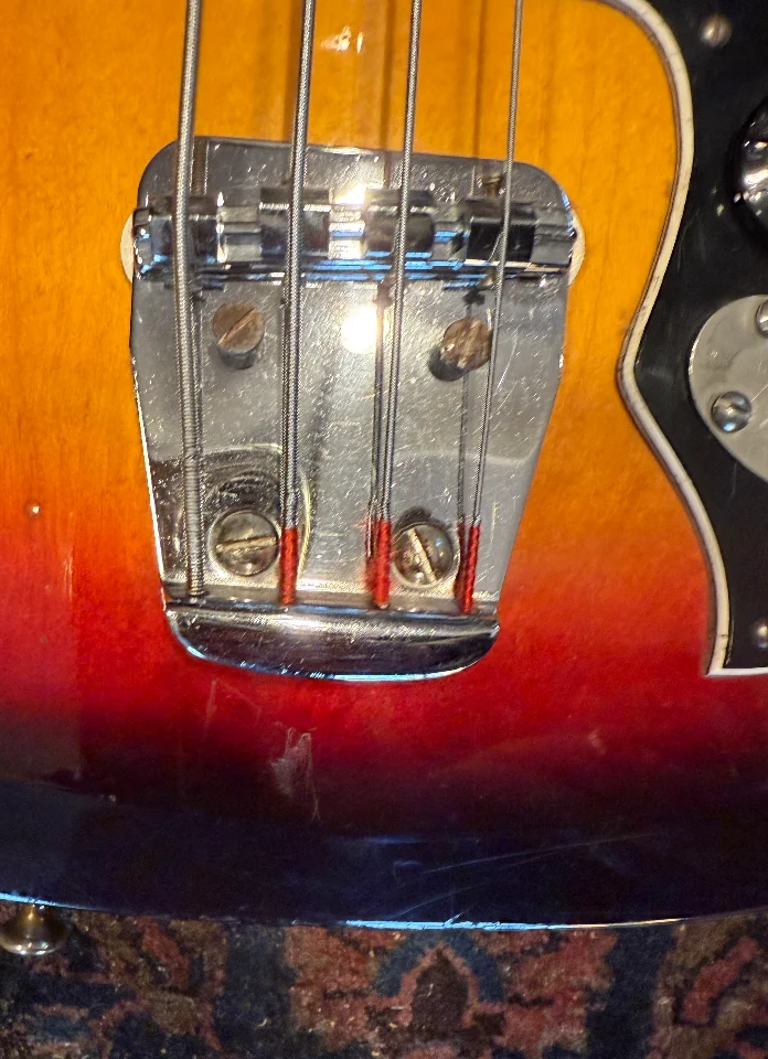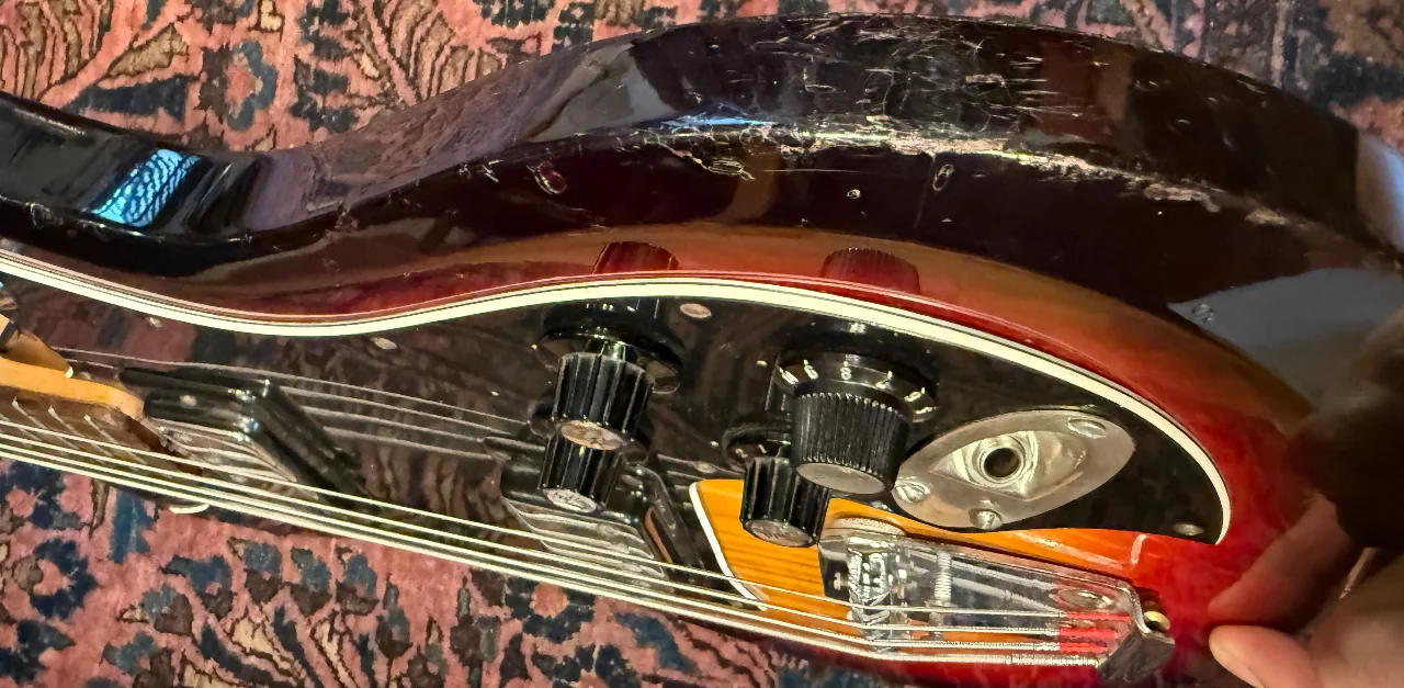 Der Bass hat Gebrauchsspuren und eine Mechanik ist nicht original. Das Layout ist jeweils Vol / Tone für jeden PU. Außerdem gibt es einen Toggle Switch zum schnellen Ansteuern der PU's, sowie einen Kill Switch, der genau wie im Video nur manchmal funktioniert.