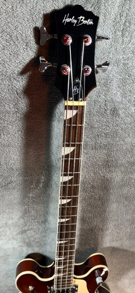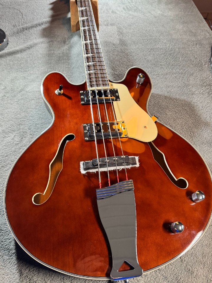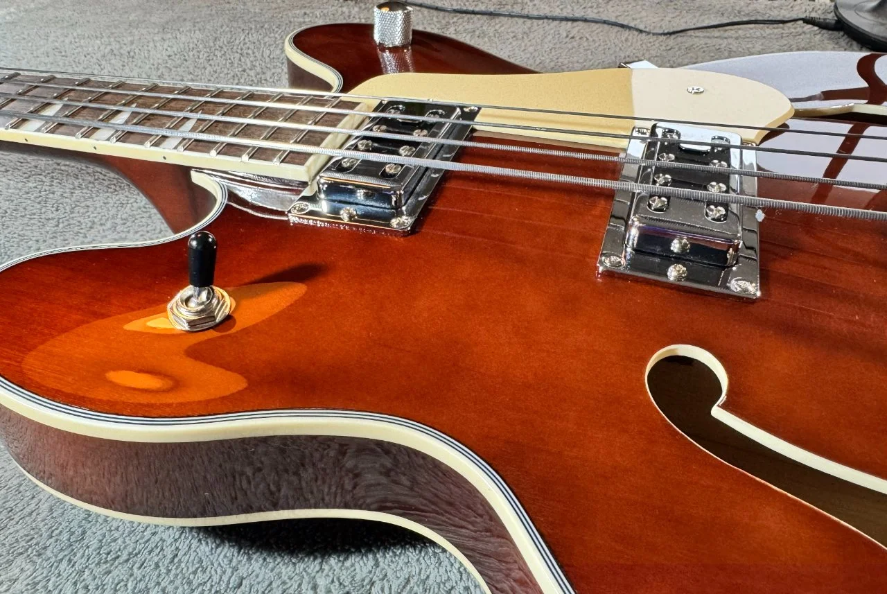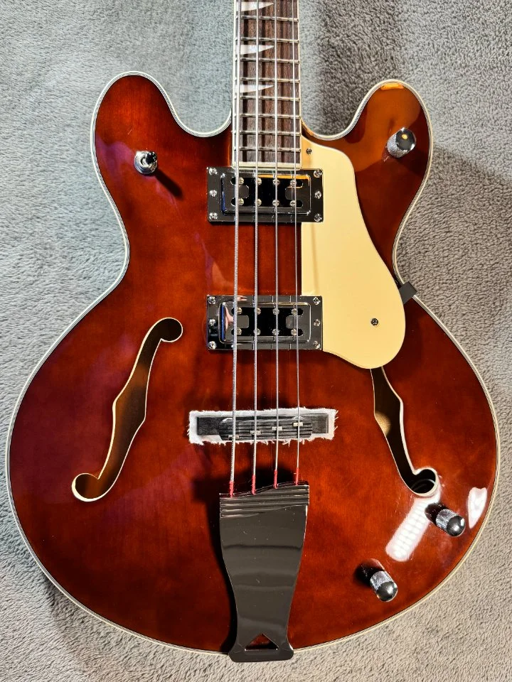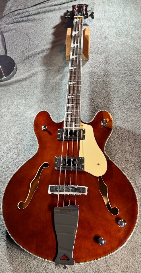 Der Bass hat einen walnussbraunen Hollowbody aus Ahorn mit einer gewölbten Decke. Der eingeleimte Hals mit einem „C“ – Halsprofil hat, genau wie der Body ein cremfarbenes Binding und ist ein Shortscale Hals mit 30“ Länge. Der Hals ist ebenfalls aus Ahorn, das Griffbrett ist aus Laurel.
